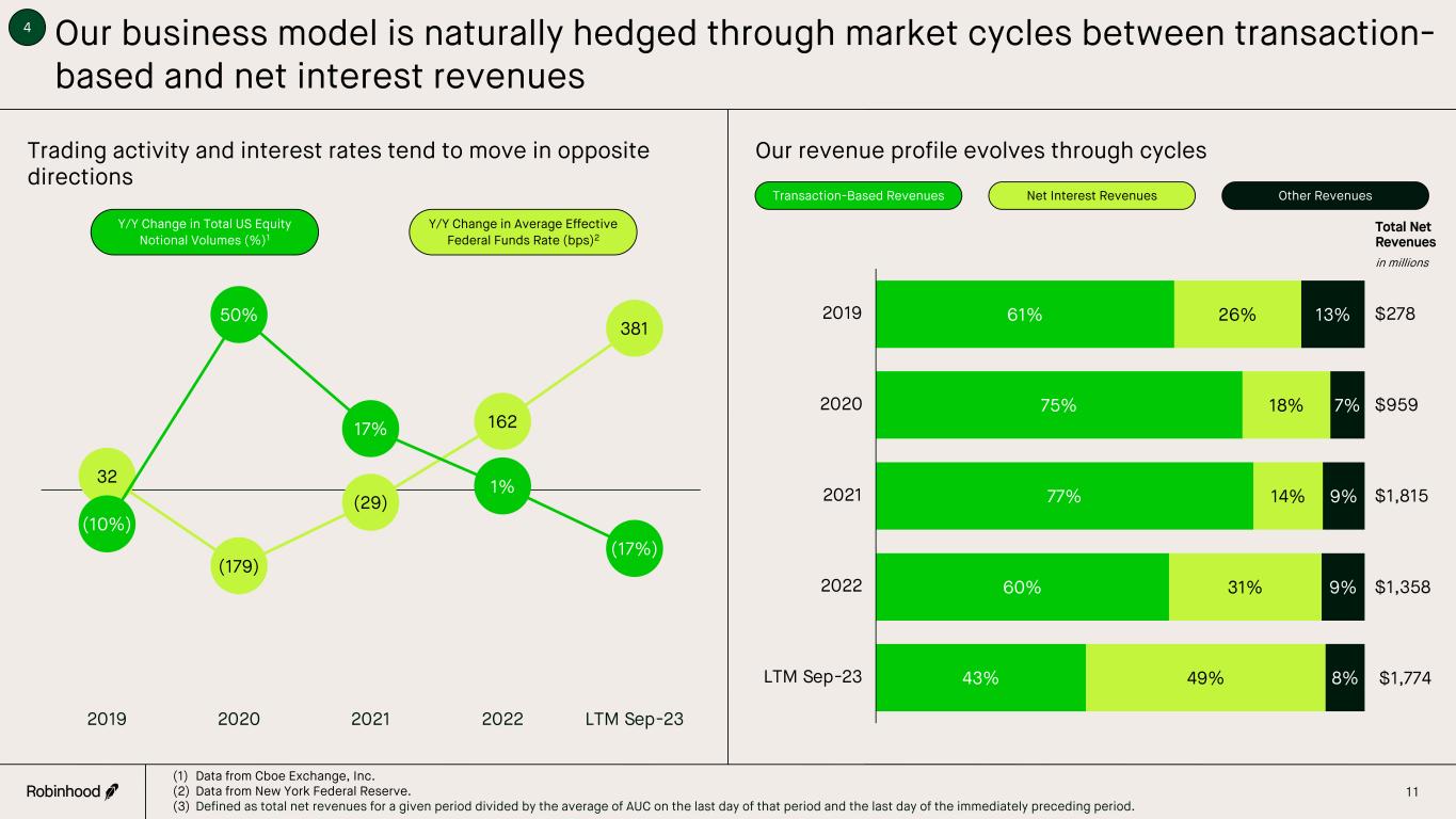 $171 $720 $1,402 $814 $771 $71 $177 $257 $424 $860 $36 $62 $156 $120 $143 $278 $959 $1,815 $1,358 $1,774 2019 2020 2021 2022 LTM Sep-23 We believe we can continue growing and diversifying our revenues Transaction-Based Revenues1 Other Revenues3Net Interest Revenues2 in millions 13% 26% 61% 7% 18% 75% 9% 14% 77% 9% 31% 60% 8% 49% 43% Retirement Credit Card Futures Advisory International Gold Near-term growth and diversification opportunities 10 (1) Primarily driven by equity, option, and crypto notional volumes. (2) Primarily driven by interest earning assets balance and interest rates. (3) Primarily driven by Gold subscriptions, proxy revenues, and ACATs. 3
