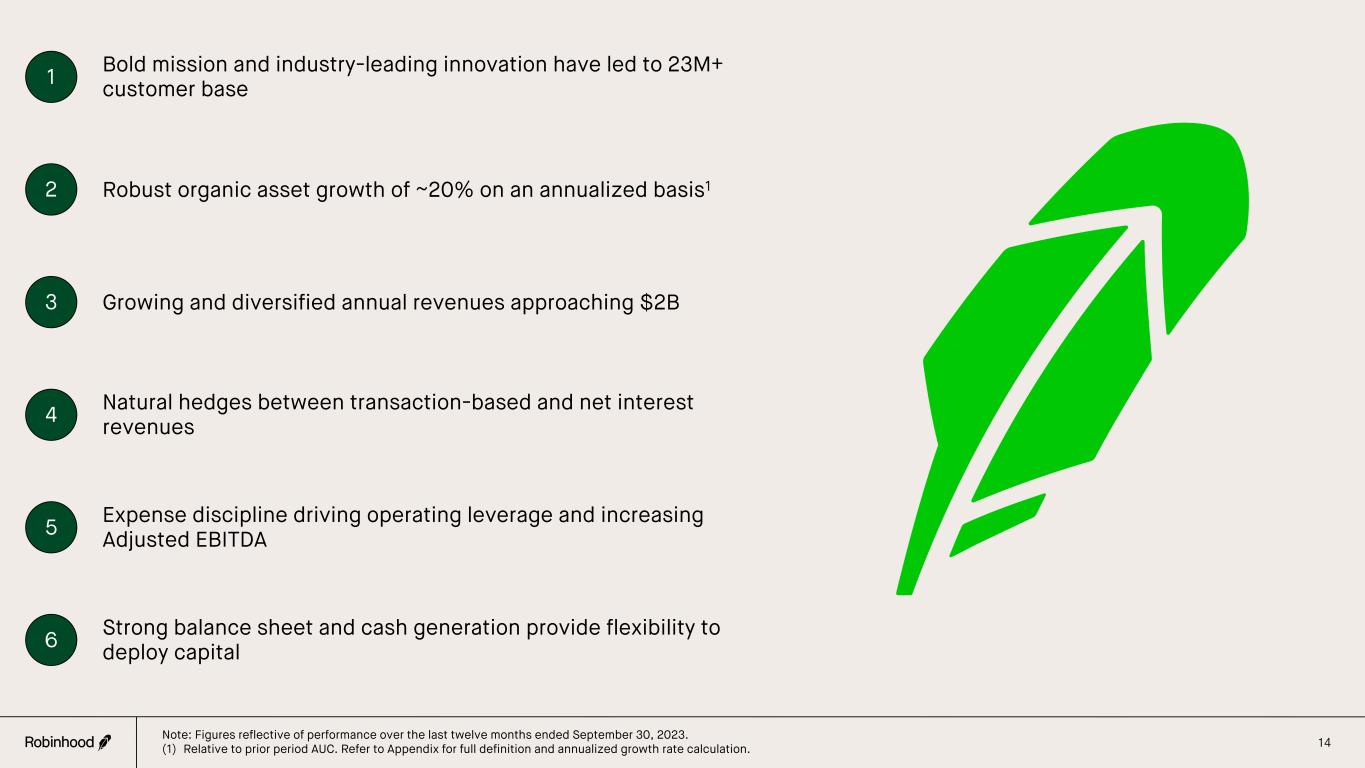 We are well positioned to deploy capital We have over $5B in corporate cash and investments1 on our balance sheet... ...and have generated $485M of Adjusted EBITDA2 on a LTM basis... in billions in millions ...providing us with flexibility to use excess cash to grow our business and drive shareholder value $6.2 $6.3 $5.9 $6.3 $5.4 Q3'22 Q4'22 Q1'23 Q2'23 Q3'23 $47 $82 $115 $151 $137 Q3'22 Q4'22 Q1'23 Q2'23 Q3'23 Our capital deployment YTD 2023: § Acquired X1, allowing us to accelerate the development of a Robinhood credit offering for our 23M+ customers § Bought 55M+ of our shares Future opportunities: § Organic growth § M&A § Shareholder capital returns 13 6 (1) As of September 30, 2023. For more information on our investments, see Note - Investments and Fair Value Measurement, to our unaudited condensed consolidated financial statements in our Q3 2023 10-Q. (2) Adjusted EBITDA is a non-GAAP financial measure. Refer to Appendix for the reconciliation of Adjusted EBITDA to the most directly comparable GAAP measure, net income (loss).