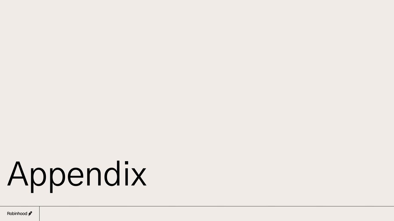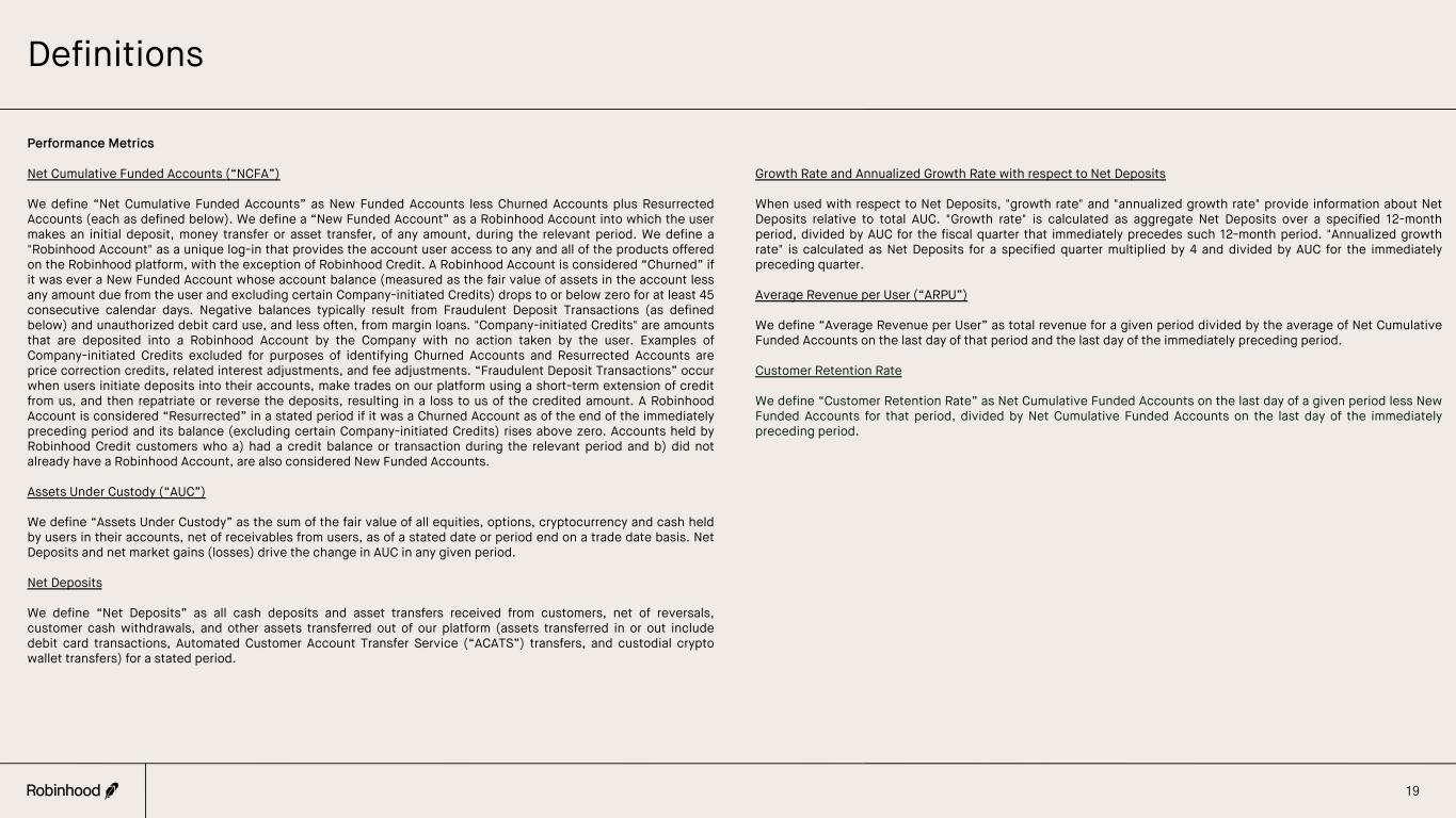 Definitions 19 Performance Metrics Net Cumulative Funded Accounts (“NCFA”) We define “Net Cumulative Funded Accounts” as New Funded Accounts less Churned Accounts plus Resurrected Accounts (each as defined below). We define a “New Funded Account” as a Robinhood Account into which the user makes an initial deposit, money transfer or asset transfer, of any amount, during the relevant period. We define a "Robinhood Account" as a unique log-in that provides the account user access to any and all of the products offered on the Robinhood platform, with the exception of Robinhood Credit. A Robinhood Account is considered “Churned” if it was ever a New Funded Account whose account balance (measured as the fair value of assets in the account less any amount due from the user and excluding certain Company-initiated Credits) drops to or below zero for at least 45 consecutive calendar days. Negative balances typically result from Fraudulent Deposit Transactions (as defined below) and unauthorized debit card use, and less often, from margin loans. "Company-initiated Credits" are amounts that are deposited into a Robinhood Account by the Company with no action taken by the user. Examples of Company-initiated Credits excluded for purposes of identifying Churned Accounts and Resurrected Accounts are price correction credits, related interest adjustments, and fee adjustments. “Fraudulent Deposit Transactions” occur when users initiate deposits into their accounts, make trades on our platform using a short-term extension of credit from us, and then repatriate or reverse the deposits, resulting in a loss to us of the credited amount. A Robinhood Account is considered “Resurrected” in a stated period if it was a Churned Account as of the end of the immediately preceding period and its balance (excluding certain Company-initiated Credits) rises above zero. Accounts held by Robinhood Credit customers who a) had a credit balance or transaction during the relevant period and b) did not already have a Robinhood Account, are also considered New Funded Accounts. Assets Under Custody (“AUC”) We define “Assets Under Custody” as the sum of the fair value of all equities, options, cryptocurrency and cash held by users in their accounts, net of receivables from users, as of a stated date or period end on a trade date basis. Net Deposits and net market gains (losses) drive the change in AUC in any given period. Net Deposits We define “Net Deposits” as all cash deposits and asset transfers received from customers, net of reversals, customer cash withdrawals, and other assets transferred out of our platform (assets transferred in or out include debit card transactions, Automated Customer Account Transfer Service (“ACATS”) transfers, and custodial crypto wallet transfers) for a stated period. Growth Rate and Annualized Growth Rate with respect to Net Deposits When used with respect to Net Deposits, "growth rate" and "annualized growth rate" provide information about Net Deposits relative to total AUC. "Growth rate" is calculated as aggregate Net Deposits over a specified 12-month period, divided by AUC for the fiscal quarter that immediately precedes such 12-month period. "Annualized growth rate" is calculated as Net Deposits for a specified quarter multiplied by 4 and divided by AUC for the immediately preceding quarter. Average Revenue per User (“ARPU”) We define “Average Revenue per User” as total revenue for a given period divided by the average of Net Cumulative Funded Accounts on the last day of that period and the last day of the immediately preceding period. Customer Retention Rate We define “Customer Retention Rate” as Net Cumulative Funded Accounts on the last day of a given period less New Funded Accounts for that period, divided by Net Cumulative Funded Accounts on the last day of the immediately preceding period.