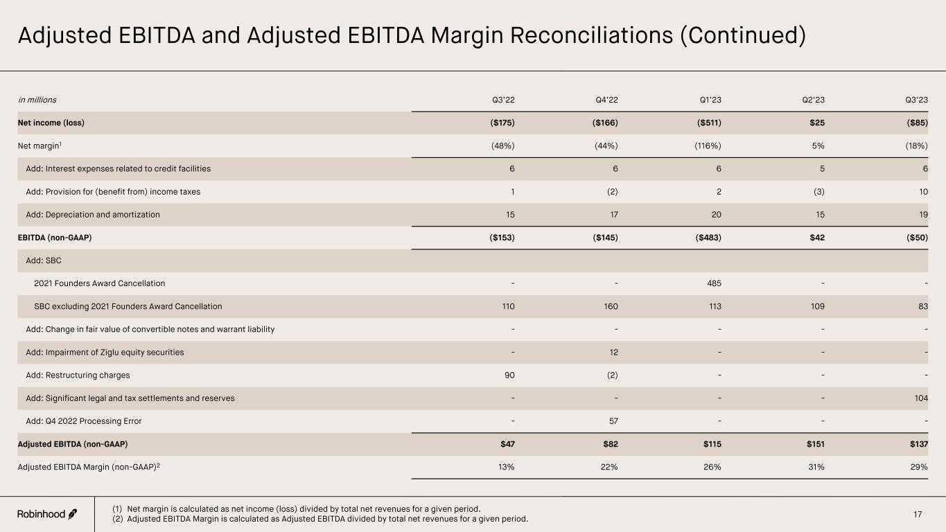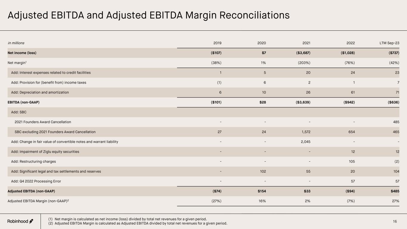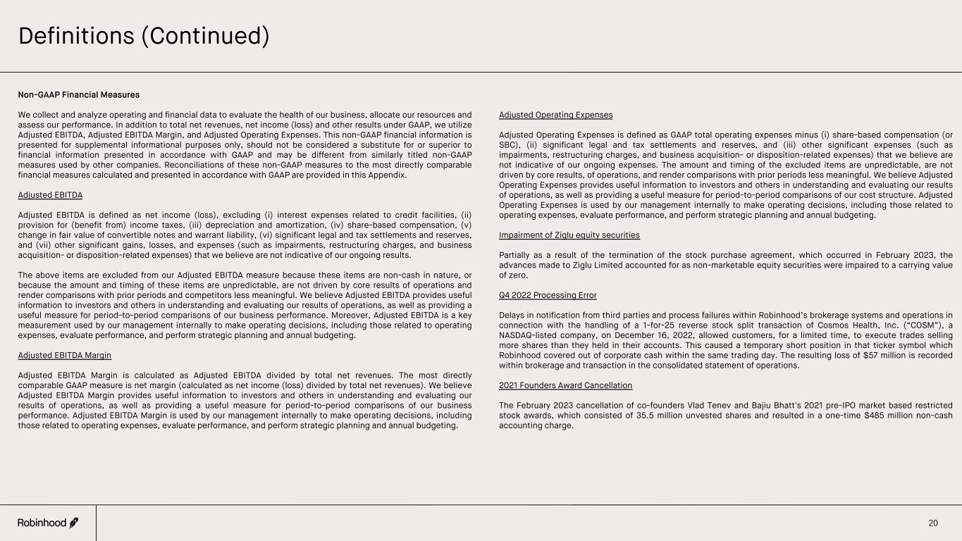 Definitions (Continued) 20 Non-GAAP Financial Measures We collect and analyze operating and financial data to evaluate the health of our business, allocate our resources and assess our performance. In addition to total net revenues, net income (loss) and other results under GAAP, we utilize Adjusted EBITDA, Adjusted EBITDA Margin, and Adjusted Operating Expenses. This non-GAAP financial information is presented for supplemental informational purposes only, should not be considered a substitute for or superior to financial information presented in accordance with GAAP and may be different from similarly titled non-GAAP measures used by other companies. Reconciliations of these non-GAAP measures to the most directly comparable financial measures calculated and presented in accordance with GAAP are provided in this Appendix. Adjusted EBITDA Adjusted EBITDA is defined as net income (loss), excluding (i) interest expenses related to credit facilities, (ii) provision for (benefit from) income taxes, (iii) depreciation and amortization, (iv) share-based compensation, (v) change in fair value of convertible notes and warrant liability, (vi) significant legal and tax settlements and reserves, and (vii) other significant gains, losses, and expenses (such as impairments, restructuring charges, and business acquisition- or disposition-related expenses) that we believe are not indicative of our ongoing results. The above items are excluded from our Adjusted EBITDA measure because these items are non-cash in nature, or because the amount and timing of these items are unpredictable, are not driven by core results of operations and render comparisons with prior periods and competitors less meaningful. We believe Adjusted EBITDA provides useful information to investors and others in understanding and evaluating our results of operations, as well as providing a useful measure for period-to-period comparisons of our business performance. Moreover, Adjusted EBITDA is a key measurement used by our management internally to make operating decisions, including those related to operating expenses, evaluate performance, and perform strategic planning and annual budgeting. Adjusted EBITDA Margin Adjusted EBITDA Margin is calculated as Adjusted EBITDA divided by total net revenues. The most directly comparable GAAP measure is net margin (calculated as net income (loss) divided by total net revenues). We believe Adjusted EBITDA Margin provides useful information to investors and others in understanding and evaluating our results of operations, as well as providing a useful measure for period-to-period comparisons of our business performance. Adjusted EBITDA Margin is used by our management internally to make operating decisions, including those related to operating expenses, evaluate performance, and perform strategic planning and annual budgeting. Adjusted Operating Expenses Adjusted Operating Expenses is defined as GAAP total operating expenses minus (i) share-based compensation (or SBC), (ii) significant legal and tax settlements and reserves, and (iii) other significant expenses (such as impairments, restructuring charges, and business acquisition- or disposition-related expenses) that we believe are not indicative of our ongoing expenses. The amount and timing of the excluded items are unpredictable, are not driven by core results, of operations, and render comparisons with prior periods less meaningful. We believe Adjusted Operating Expenses provides useful information to investors and others in understanding and evaluating our results of operations, as well as providing a useful measure for period-to-period comparisons of our cost structure. Adjusted Operating Expenses is used by our management internally to make operating decisions, including those related to operating expenses, evaluate performance, and perform strategic planning and annual budgeting. Impairment of Ziglu equity securities Partially as a result of the termination of the stock purchase agreement, which occurred in February 2023, the advances made to Ziglu Limited accounted for as non-marketable equity securities were impaired to a carrying value of zero. Q4 2022 Processing Error Delays in notification from third parties and process failures within Robinhood’s brokerage systems and operations in connection with the handling of a 1-for-25 reverse stock split transaction of Cosmos Health, Inc. (“COSM”), a NASDAQ-listed company, on December 16, 2022, allowed customers, for a limited time, to execute trades selling more shares than they held in their accounts. This caused a temporary short position in that ticker symbol which Robinhood covered out of corporate cash within the same trading day. The resulting loss of $57 million is recorded within brokerage and transaction in the consolidated statement of operations. 2021 Founders Award Cancellation The February 2023 cancellation of co-founders Vlad Tenev and Bajiu Bhatt's 2021 pre-IPO market based restricted stock awards, which consisted of 35.5 million unvested shares and resulted in a one-time $485 million non-cash accounting charge.