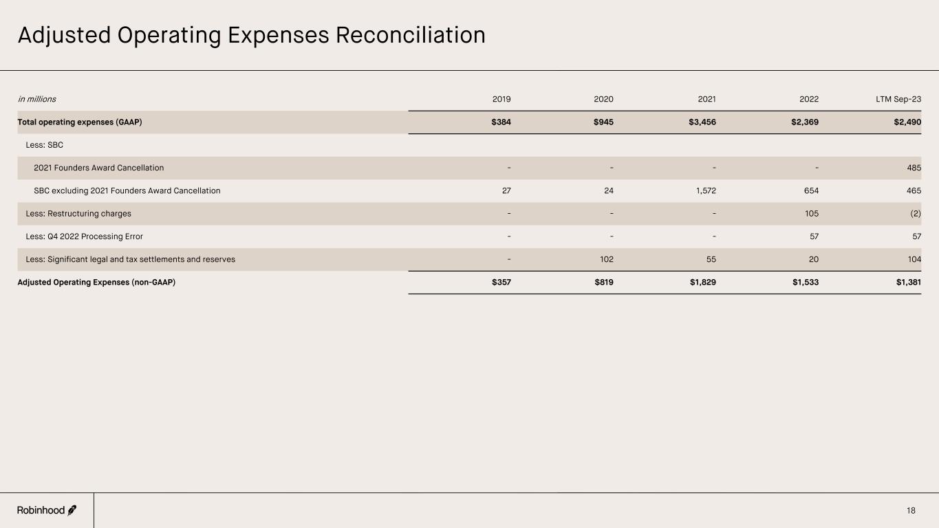 Adjusted EBITDA and Adjusted EBITDA Margin Reconciliations (Continued) 17(1) Net margin is calculated as net income (loss) divided by total net revenues for a given period. (2) Adjusted EBITDA Margin is calculated as Adjusted EBITDA divided by total net revenues for a given period. in millions Q3’22 Q4’22 Q1’23 Q2’23 Q3’23 Net income (loss) ($175) ($166) ($511) $25 ($85) Net margin1 (48%) (44%) (116%) 5% (18%) Add: Interest expenses related to credit facilities 6 6 6 5 6 Add: Provision for (benefit from) income taxes 1 (2) 2 (3) 10 Add: Depreciation and amortization 15 17 20 15 19 EBITDA (non-GAAP) ($153) ($145) ($483) $42 ($50) Add: SBC 2021 Founders Award Cancellation - - 485 - - SBC excluding 2021 Founders Award Cancellation 110 160 113 109 83 Add: Change in fair value of convertible notes and warrant liability - - - - - Add: Impairment of Ziglu equity securities - 12 - - - Add: Restructuring charges 90 (2) - - - Add: Significant legal and tax settlements and reserves - - - - 104 Add: Q4 2022 Processing Error - 57 - - - Adjusted EBITDA (non-GAAP) $47 $82 $115 $151 $137 Adjusted EBITDA Margin (non-GAAP)2 13% 22% 26% 31% 29%