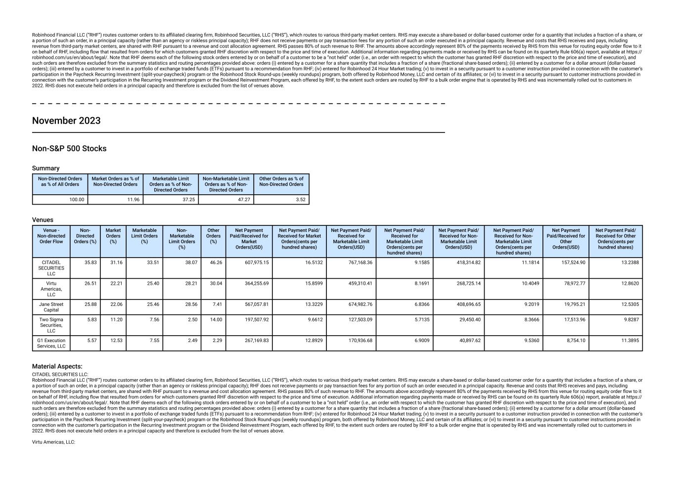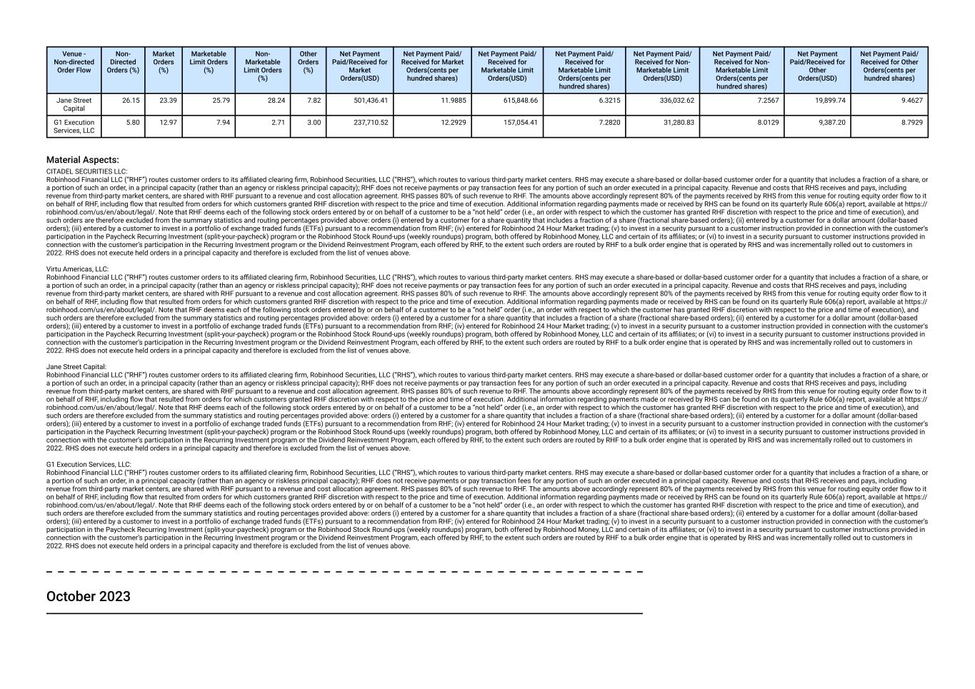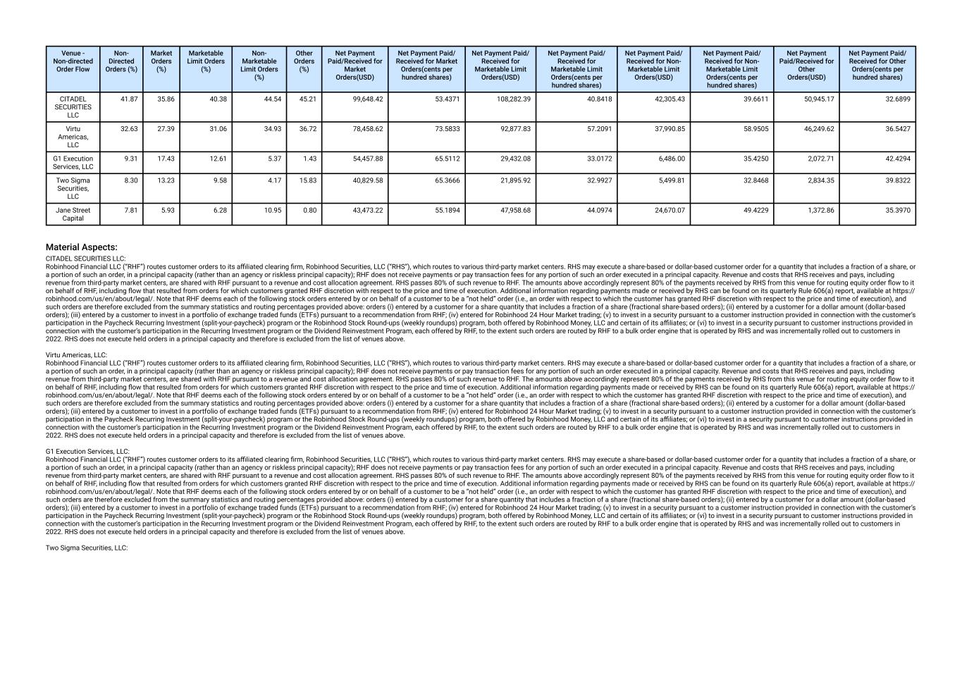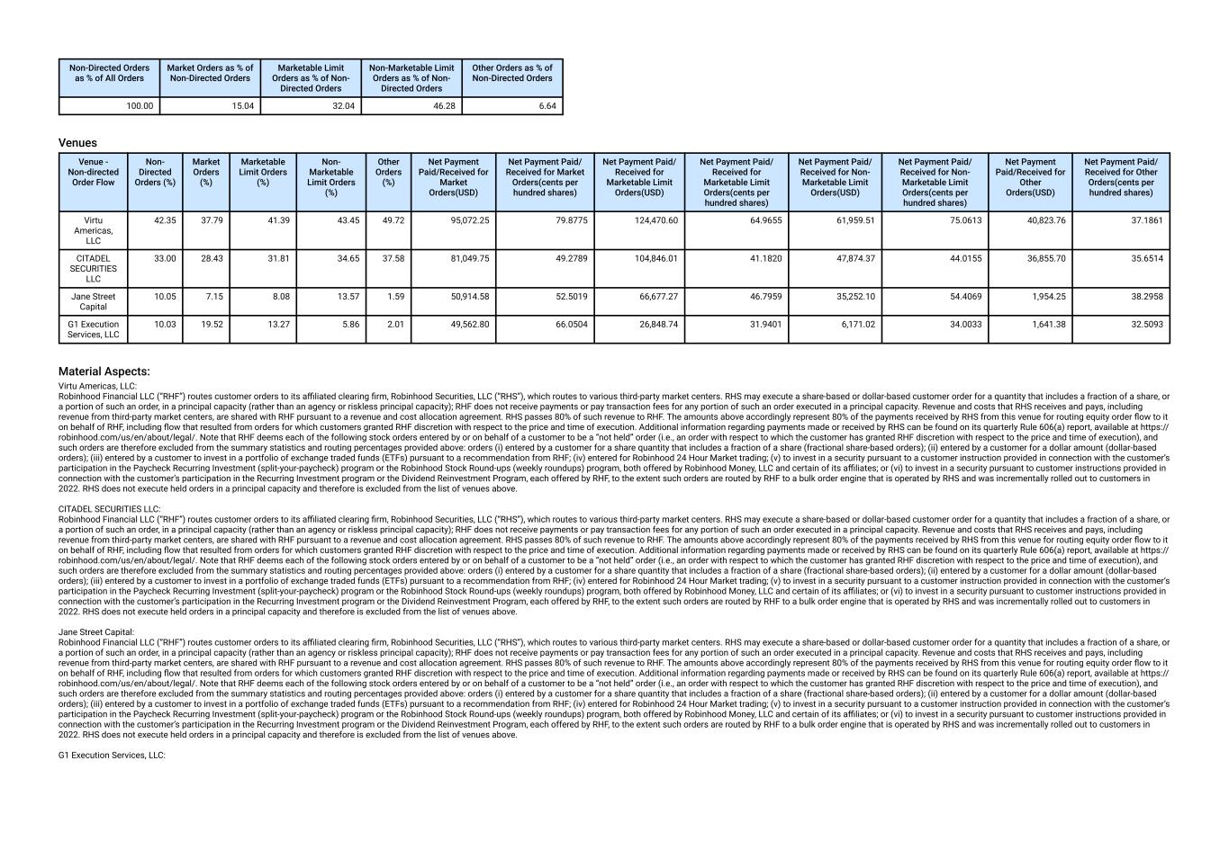 Venue - Non-directed Order Flow Non- Directed Orders (%) Market Orders (%) Marketable Limit Orders (%) Non- Marketable Limit Orders (%) Other Orders (%) Net Payment Paid/Received for Market Orders(USD) Net Payment Paid/ Received for Market Orders(cents per hundred shares) Net Payment Paid/ Received for Marketable Limit Orders(USD) Net Payment Paid/ Received for Marketable Limit Orders(cents per hundred shares) Net Payment Paid/ Received for Non- Marketable Limit Orders(USD) Net Payment Paid/ Received for Non- Marketable Limit Orders(cents per hundred shares) Net Payment Paid/Received for Other Orders(USD) Net Payment Paid/ Received for Other Orders(cents per hundred shares) Jane Street Capital 26.15 23.39 25.79 28.24 7.82 501,436.41 11.9885 615,848.66 6.3215 336,032.62 7.2567 19,899.74 9.4627 G1 Execution Services, LLC 5.80 12.97 7.94 2.71 3.00 237,710.52 12.2929 157,054.41 7.2820 31,280.83 8.0129 9,387.20 8.7929 Material Aspects: CITADEL SECURITIES LLC: Robinhood Financial LLC (“RHF”) routes customer orders to its affiliated clearing firm, Robinhood Securities, LLC (“RHS”), which routes to various third-party market centers. RHS may execute a share-based or dollar-based customer order for a quantity that includes a fraction of a share, or a portion of such an order, in a principal capacity (rather than an agency or riskless principal capacity); RHF does not receive payments or pay transaction fees for any portion of such an order executed in a principal capacity. Revenue and costs that RHS receives and pays, including revenue from third-party market centers, are shared with RHF pursuant to a revenue and cost allocation agreement. RHS passes 80% of such revenue to RHF. The amounts above accordingly represent 80% of the payments received by RHS from this venue for routing equity order flow to it on behalf of RHF, including flow that resulted from orders for which customers granted RHF discretion with respect to the price and time of execution. Additional information regarding payments made or received by RHS can be found on its quarterly Rule 606(a) report, available at https:// robinhood.com/us/en/about/legal/. Note that RHF deems each of the following stock orders entered by or on behalf of a customer to be a “not held” order (i.e., an order with respect to which the customer has granted RHF discretion with respect to the price and time of execution), and such orders are therefore excluded from the summary statistics and routing percentages provided above: orders (i) entered by a customer for a share quantity that includes a fraction of a share (fractional share-based orders); (ii) entered by a customer for a dollar amount (dollar-based orders); (iii) entered by a customer to invest in a portfolio of exchange traded funds (ETFs) pursuant to a recommendation from RHF; (iv) entered for Robinhood 24 Hour Market trading; (v) to invest in a security pursuant to a customer instruction provided in connection with the customer’s participation in the Paycheck Recurring Investment (split-your-paycheck) program or the Robinhood Stock Round-ups (weekly roundups) program, both offered by Robinhood Money, LLC and certain of its affiliates; or (vi) to invest in a security pursuant to customer instructions provided in connection with the customer’s participation in the Recurring Investment program or the Dividend Reinvestment Program, each offered by RHF, to the extent such orders are routed by RHF to a bulk order engine that is operated by RHS and was incrementally rolled out to customers in 2022. RHS does not execute held orders in a principal capacity and therefore is excluded from the list of venues above. Virtu Americas, LLC: Robinhood Financial LLC (“RHF”) routes customer orders to its affiliated clearing firm, Robinhood Securities, LLC (“RHS”), which routes to various third-party market centers. RHS may execute a share-based or dollar-based customer order for a quantity that includes a fraction of a share, or a portion of such an order, in a principal capacity (rather than an agency or riskless principal capacity); RHF does not receive payments or pay transaction fees for any portion of such an order executed in a principal capacity. Revenue and costs that RHS receives and pays, including revenue from third-party market centers, are shared with RHF pursuant to a revenue and cost allocation agreement. RHS passes 80% of such revenue to RHF. The amounts above accordingly represent 80% of the payments received by RHS from this venue for routing equity order flow to it on behalf of RHF, including flow that resulted from orders for which customers granted RHF discretion with respect to the price and time of execution. Additional information regarding payments made or received by RHS can be found on its quarterly Rule 606(a) report, available at https:// robinhood.com/us/en/about/legal/. Note that RHF deems each of the following stock orders entered by or on behalf of a customer to be a “not held” order (i.e., an order with respect to which the customer has granted RHF discretion with respect to the price and time of execution), and such orders are therefore excluded from the summary statistics and routing percentages provided above: orders (i) entered by a customer for a share quantity that includes a fraction of a share (fractional share-based orders); (ii) entered by a customer for a dollar amount (dollar-based orders); (iii) entered by a customer to invest in a portfolio of exchange traded funds (ETFs) pursuant to a recommendation from RHF; (iv) entered for Robinhood 24 Hour Market trading; (v) to invest in a security pursuant to a customer instruction provided in connection with the customer’s participation in the Paycheck Recurring Investment (split-your-paycheck) program or the Robinhood Stock Round-ups (weekly roundups) program, both offered by Robinhood Money, LLC and certain of its affiliates; or (vi) to invest in a security pursuant to customer instructions prov