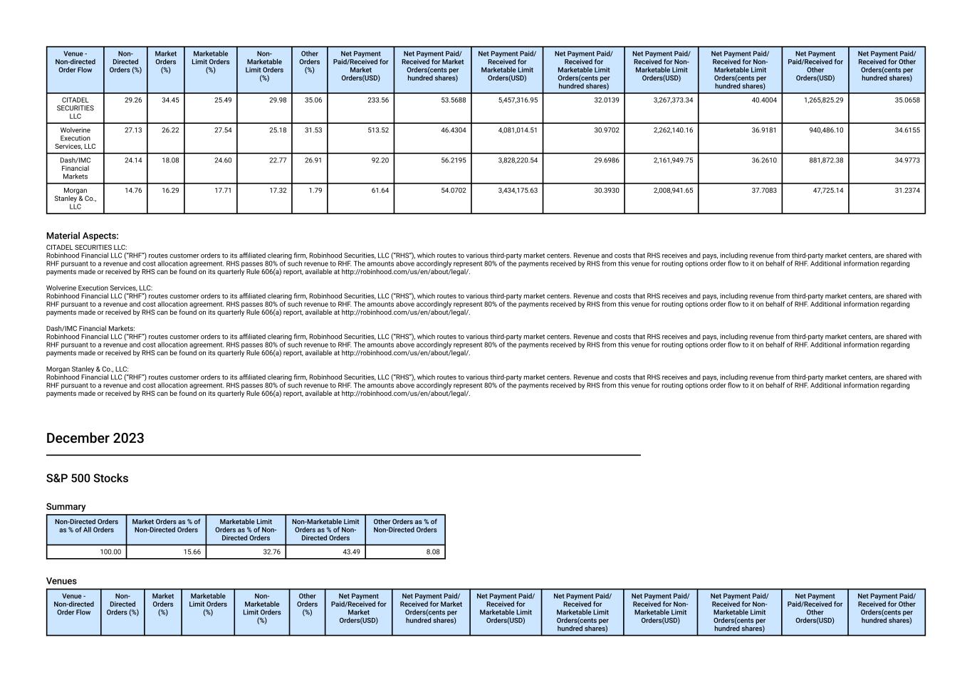 Venue - Non-directed Order Flow Non- Directed Orders (%) Market Orders (%) Marketable Limit Orders (%) Non- Marketable Limit Orders (%) Other Orders (%) Net Payment Paid/Received for Market Orders(USD) Net Payment Paid/ Received for Market Orders(cents per hundred shares) Net Payment Paid/ Received for Marketable Limit Orders(USD) Net Payment Paid/ Received for Marketable Limit Orders(cents per hundred shares) Net Payment Paid/ Received for Non- Marketable Limit Orders(USD) Net Payment Paid/ Received for Non- Marketable Limit Orders(cents per hundred shares) Net Payment Paid/Received for Other Orders(USD) Net Payment Paid/ Received for Other Orders(cents per hundred shares) CITADEL SECURITIES LLC 29.26 34.45 25.49 29.98 35.06 233.56 53.5688 5,457,316.95 32.0139 3,267,373.34 40.4004 1,265,825.29 35.0658 Wolverine Execution Services, LLC 27.13 26.22 27.54 25.18 31.53 513.52 46.4304 4,081,014.51 30.9702 2,262,140.16 36.9181 940,486.10 34.6155 Dash/IMC Financial Markets 24.14 18.08 24.60 22.77 26.91 92.20 56.2195 3,828,220.54 29.6986 2,161,949.75 36.2610 881,872.38 34.9773 Morgan Stanley & Co., LLC 14.76 16.29 17.71 17.32 1.79 61.64 54.0702 3,434,175.63 30.3930 2,008,941.65 37.7083 47,725.14 31.2374 Material Aspects: CITADEL SECURITIES LLC: Robinhood Financial LLC (“RHF”) routes customer orders to its affiliated clearing firm, Robinhood Securities, LLC (“RHS”), which routes to various third-party market centers. Revenue and costs that RHS receives and pays, including revenue from third-party market centers, are shared with RHF pursuant to a revenue and cost allocation agreement. RHS passes 80% of such revenue to RHF. The amounts above accordingly represent 80% of the payments received by RHS from this venue for routing options order flow to it on behalf of RHF. Additional information regarding payments made or received by RHS can be found on its quarterly Rule 606(a) report, available at http://robinhood.com/us/en/about/legal/. Wolverine Execution Services, LLC: Robinhood Financial LLC (“RHF”) routes customer orders to its affiliated clearing firm, Robinhood Securities, LLC (“RHS”), which routes to various third-party market centers. Revenue and costs that RHS receives and pays, including revenue from third-party market centers, are shared with RHF pursuant to a revenue and cost allocation agreement. RHS passes 80% of such revenue to RHF. The amounts above accordingly represent 80% of the payments received by RHS from this venue for routing options order flow to it on behalf of RHF. Additional information regarding payments made or received by RHS can be found on its quarterly Rule 606(a) report, available at http://robinhood.com/us/en/about/legal/. Dash/IMC Financial Markets: Robinhood Financial LLC (“RHF”) routes customer orders to its affiliated clearing firm, Robinhood Securities, LLC (“RHS”), which routes to various third-party market centers. Revenue and costs that RHS receives and pays, including revenue from third-party market centers, are shared with RHF pursuant to a revenue and cost allocation agreement. RHS passes 80% of such revenue to RHF. The amounts above accordingly represent 80% of the payments received by RHS from this venue for routing options order flow to it on behalf of RHF. Additional information regarding payments made or received by RHS can be found on its quarterly Rule 606(a) report, available at http://robinhood.com/us/en/about/legal/. Morgan Stanley & Co., LLC: Robinhood Financial LLC (“RHF”) routes customer orders to its affiliated clearing firm, Robinhood Securities, LLC (“RHS”), which routes to various third-party market centers. Revenue and costs that RHS receives and pays, including revenue from third-party market centers, are shared with RHF pursuant to a revenue and cost allocation agreement. RHS passes 80% of such revenue to RHF. The amounts above accordingly represent 80% of the payments received by RHS from this venue for routing options order flow to it on behalf of RHF. Additional information regarding payments made or received by RHS can be found on its quarterly Rule 606(a) report, available at http://robinhood.com/us/en/about/legal/. December 2023 S&P 500 Stocks Summary Non-Directed Orders as % of All Orders Market Orders as % of Non-Directed Orders Marketable Limit Orders as % of Non- Directed Orders Non-Marketable Limit Orders as % of Non- Directed Orders Other Orders as % of Non-Directed Orders 100.00 15.66 32.76 43.49 8.08 Venues Venue - Non-directed Order Flow Non- Directed Orders (%) Market Orders (%) Marketable Limit Orders (%) Non- Marketable Limit Orders (%) Other Orders (%) Net Payment Paid/Received for Market Orders(USD) Net Payment Paid/ Received for Market Orders(cents per hundred shares) Net Payment Paid/ Received for Marketable Limit Orders(USD) Net Payment Paid/ Received for Marketable Limit Orders(cents per hundred shares) Net Payment Paid/ Received for Non- Marketable Limit Orders(USD) Net Payment Paid/ Received for Non- Marketable Limit Orders(cents per hundred shares) Net Payment Paid/Received for Other Orders(USD) Net Payment Paid/ Received for Other Orders(cents per hundred shares)
