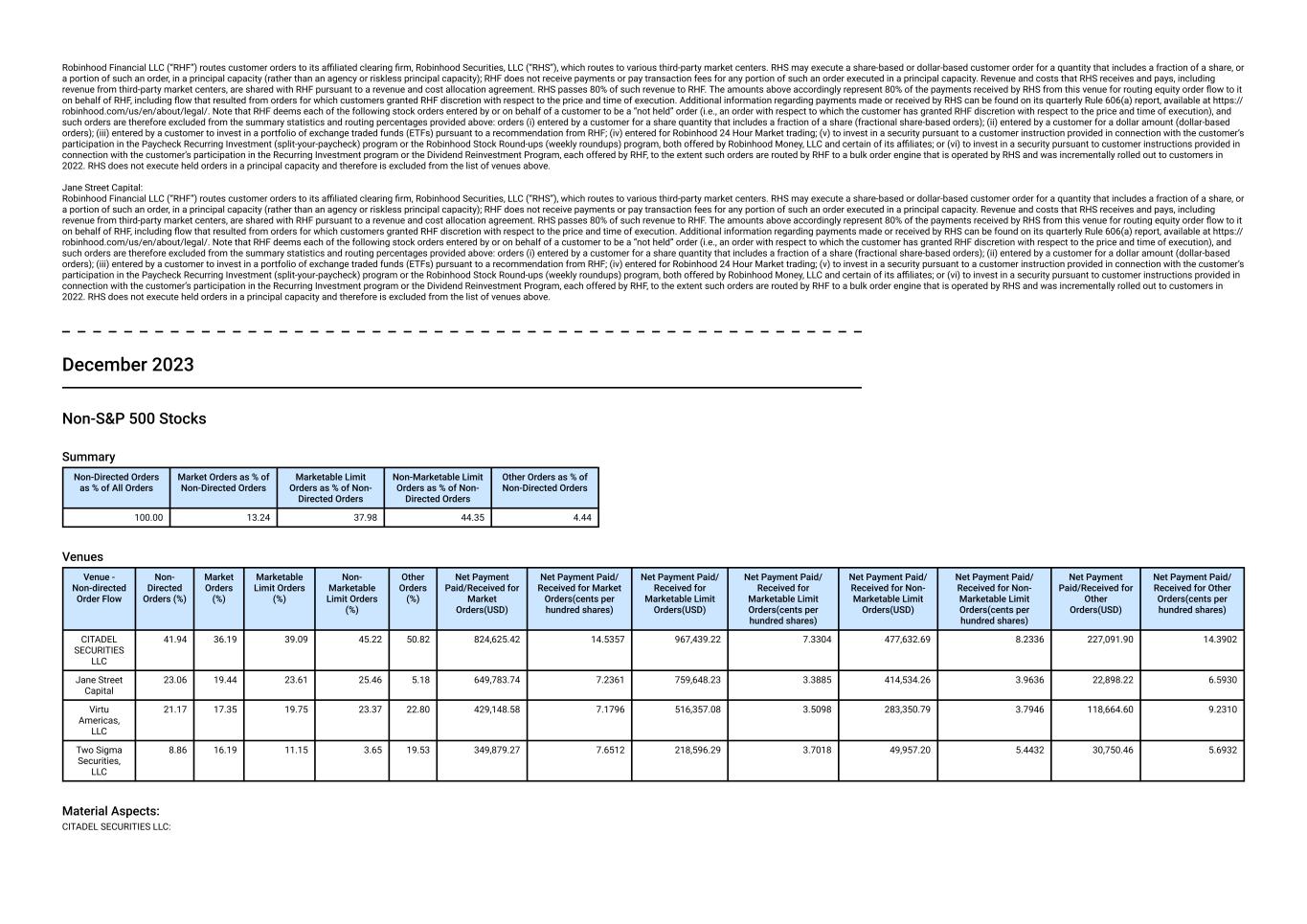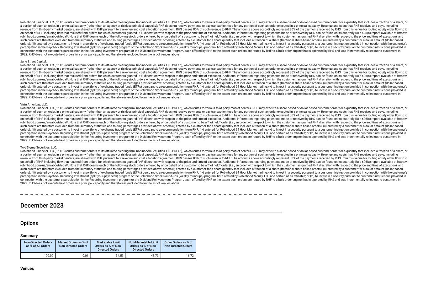 Robinhood Financial LLC (“RHF”) routes customer orders to its affiliated clearing firm, Robinhood Securities, LLC (“RHS”), which routes to various third-party market centers. RHS may execute a share-based or dollar-based customer order for a quantity that includes a fraction of a share, or a portion of such an order, in a principal capacity (rather than an agency or riskless principal capacity); RHF does not receive payments or pay transaction fees for any portion of such an order executed in a principal capacity. Revenue and costs that RHS receives and pays, including revenue from third-party market centers, are shared with RHF pursuant to a revenue and cost allocation agreement. RHS passes 80% of such revenue to RHF. The amounts above accordingly represent 80% of the payments received by RHS from this venue for routing equity order flow to it on behalf of RHF, including flow that resulted from orders for which customers granted RHF discretion with respect to the price and time of execution. Additional information regarding payments made or received by RHS can be found on its quarterly Rule 606(a) report, available at https:// robinhood.com/us/en/about/legal/. Note that RHF deems each of the following stock orders entered by or on behalf of a customer to be a “not held” order (i.e., an order with respect to which the customer has granted RHF discretion with respect to the price and time of execution), and such orders are therefore excluded from the summary statistics and routing percentages provided above: orders (i) entered by a customer for a share quantity that includes a fraction of a share (fractional share-based orders); (ii) entered by a customer for a dollar amount (dollar-based orders); (iii) entered by a customer to invest in a portfolio of exchange traded funds (ETFs) pursuant to a recommendation from RHF; (iv) entered for Robinhood 24 Hour Market trading; (v) to invest in a security pursuant to a customer instruction provided in connection with the customer’s participation in the Paycheck Recurring Investment (split-your-paycheck) program or the Robinhood Stock Round-ups (weekly roundups) program, both offered by Robinhood Money, LLC and certain of its affiliates; or (vi) to invest in a security pursuant to customer instructions provided in connection with the customer’s participation in the Recurring Investment program or the Dividend Reinvestment Program, each offered by RHF, to the extent such orders are routed by RHF to a bulk order engine that is operated by RHS and was incrementally rolled out to customers in 2022. RHS does not execute held orders in a principal capacity and therefore is excluded from the list of venues above. Jane Street Capital: Robinhood Financial LLC (“RHF”) routes customer orders to its affiliated clearing firm, Robinhood Securities, LLC (“RHS”), which routes to various third-party market centers. RHS may execute a share-based or dollar-based customer order for a quantity that includes a fraction of a share, or a portion of such an order, in a principal capacity (rather than an agency or riskless principal capacity); RHF does not receive payments or pay transaction fees for any portion of such an order executed in a principal capacity. Revenue and costs that RHS receives and pays, including revenue from third-party market centers, are shared with RHF pursuant to a revenue and cost allocation agreement. RHS passes 80% of such revenue to RHF. The amounts above accordingly represent 80% of the payments received by RHS from this venue for routing equity order flow to it on behalf of RHF, including flow that resulted from orders for which customers granted RHF discretion with respect to the price and time of execution. Additional information regarding payments made or received by RHS can be found on its quarterly Rule 606(a) report, available at https:// robinhood.com/us/en/about/legal/. Note that RHF deems each of the following stock orders entered by or on behalf of a customer to be a “not held” order (i.e., an order with respect to which the customer has granted RHF discretion with respect to the price and time of execution), and such orders are therefore excluded from the summary statistics and routing percentages provided above: orders (i) entered by a customer for a share quantity that includes a fraction of a share (fractional share-based orders); (ii) entered by a customer for a dollar amount (dollar-based orders); (iii) entered by a customer to invest in a portfolio of exchange traded funds (ETFs) pursuant to a recommendation from RHF; (iv) entered for Robinhood 24 Hour Market trading; (v) to invest in a security pursuant to a customer instruction provided in connection with the customer’s participation in the Paycheck Recurring Investment (split-your-paycheck) program or the Robinhood Stock Round-ups (weekly roundups) program, both offered by Robinhood Money, LLC and certain of its affiliates; or (vi) to invest in a security pursuant to customer instructions provided in connection with the customer’s participation in the Recurring Investment program or the Dividend Reinvestment Program, each offered by RHF, to the extent such orders are routed by RHF to a bulk order engine that is operated by RHS and was incrementally rolled out to customers in 2022. RHS does not execute held orders in a principal capacity and therefore is excluded from the list of venues above. December 2023 Non-S&P 500 Stocks Summary Non-Directed Orders as % of All Orders Market Orders as % of Non-Directed Orders Marketable Limit Orders as % of Non- Directed Orders Non-Marketable Limit Orders as % of Non- Directed Orders Other Orders as % of Non-Directed Orders 100.00 13.24 37.98 44.35 4.44 Venues Venue - Non-directed Order Flow Non- Directed Orders (%) Market Orders (%) Marketable Limit Orders (%) Non- Marketable Limit Orders (%) Other Orders (%) Net Payment Paid/Received for Market Orders(USD) Net Payment Paid/ Received for Market Orders(ce