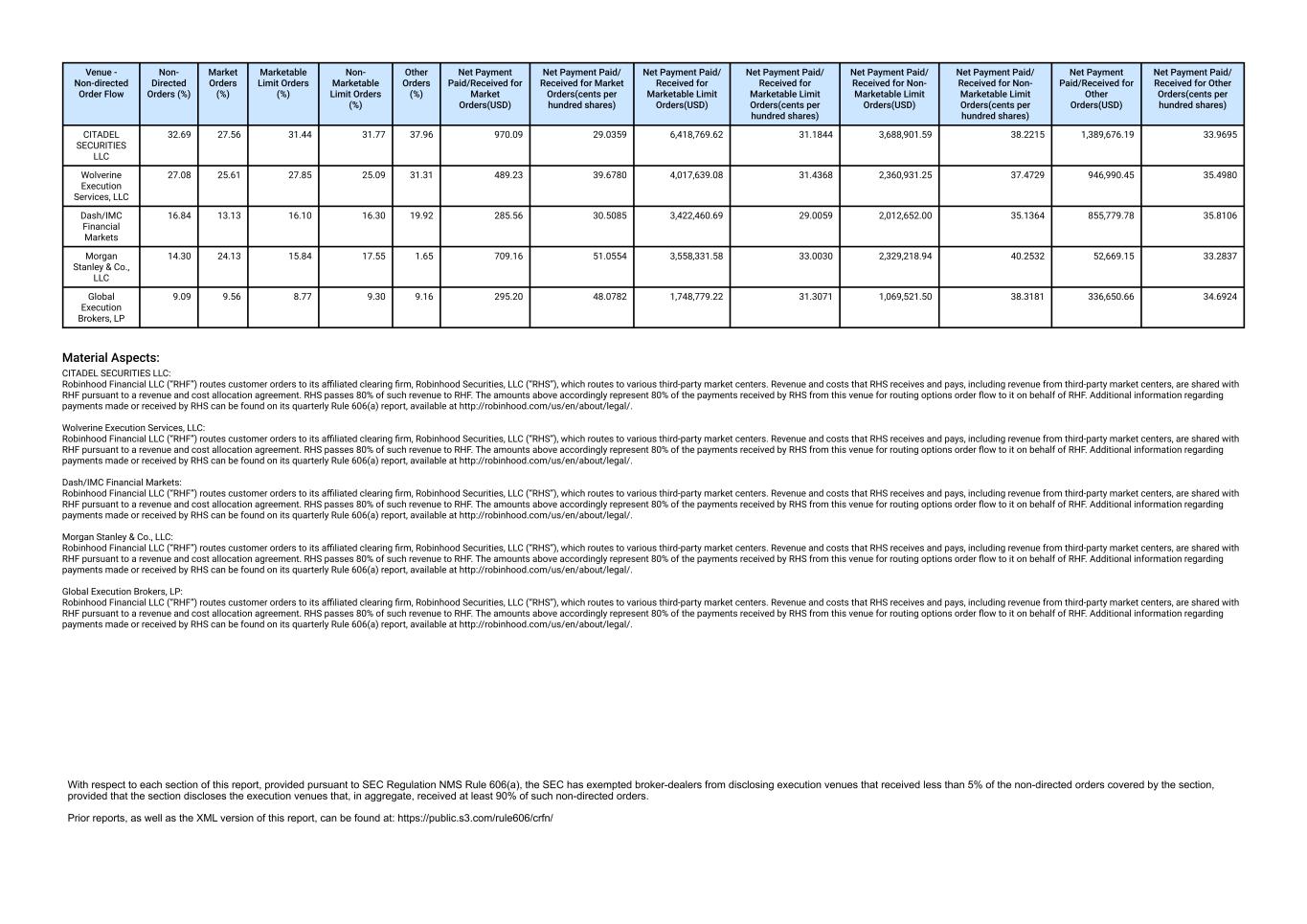 Venue - Non-directed Order Flow Non- Directed Orders (%) Market Orders (%) Marketable Limit Orders (%) Non- Marketable Limit Orders (%) Other Orders (%) Net Payment Paid/Received for Market Orders(USD) Net Payment Paid/ Received for Market Orders(cents per hundred shares) Net Payment Paid/ Received for Marketable Limit Orders(USD) Net Payment Paid/ Received for Marketable Limit Orders(cents per hundred shares) Net Payment Paid/ Received for Non- Marketable Limit Orders(USD) Net Payment Paid/ Received for Non- Marketable Limit Orders(cents per hundred shares) Net Payment Paid/Received for Other Orders(USD) Net Payment Paid/ Received for Other Orders(cents per hundred shares) CITADEL SECURITIES LLC 32.69 27.56 31.44 31.77 37.96 970.09 29.0359 6,418,769.62 31.1844 3,688,901.59 38.2215 1,389,676.19 33.9695 Wolverine Execution Services, LLC 27.08 25.61 27.85 25.09 31.31 489.23 39.6780 4,017,639.08 31.4368 2,360,931.25 37.4729 946,990.45 35.4980 Dash/IMC Financial Markets 16.84 13.13 16.10 16.30 19.92 285.56 30.5085 3,422,460.69 29.0059 2,012,652.00 35.1364 855,779.78 35.8106 Morgan Stanley & Co., LLC 14.30 24.13 15.84 17.55 1.65 709.16 51.0554 3,558,331.58 33.0030 2,329,218.94 40.2532 52,669.15 33.2837 Global Execution Brokers, LP 9.09 9.56 8.77 9.30 9.16 295.20 48.0782 1,748,779.22 31.3071 1,069,521.50 38.3181 336,650.66 34.6924 Material Aspects: CITADEL SECURITIES LLC: Robinhood Financial LLC (“RHF”) routes customer orders to its affiliated clearing firm, Robinhood Securities, LLC (“RHS”), which routes to various third-party market centers. Revenue and costs that RHS receives and pays, including revenue from third-party market centers, are shared with RHF pursuant to a revenue and cost allocation agreement. RHS passes 80% of such revenue to RHF. The amounts above accordingly represent 80% of the payments received by RHS from this venue for routing options order flow to it on behalf of RHF. Additional information regarding payments made or received by RHS can be found on its quarterly Rule 606(a) report, available at http://robinhood.com/us/en/about/legal/. Wolverine Execution Services, LLC: Robinhood Financial LLC (“RHF”) routes customer orders to its affiliated clearing firm, Robinhood Securities, LLC (“RHS”), which routes to various third-party market centers. Revenue and costs that RHS receives and pays, including revenue from third-party market centers, are shared with RHF pursuant to a revenue and cost allocation agreement. RHS passes 80% of such revenue to RHF. The amounts above accordingly represent 80% of the payments received by RHS from this venue for routing options order flow to it on behalf of RHF. Additional information regarding payments made or received by RHS can be found on its quarterly Rule 606(a) report, available at http://robinhood.com/us/en/about/legal/. Dash/IMC Financial Markets: Robinhood Financial LLC (“RHF”) routes customer orders to its affiliated clearing firm, Robinhood Securities, LLC (“RHS”), which routes to various third-party market centers. Revenue and costs that RHS receives and pays, including revenue from third-party market centers, are shared with RHF pursuant to a revenue and cost allocation agreement. RHS passes 80% of such revenue to RHF. The amounts above accordingly represent 80% of the payments received by RHS from this venue for routing options order flow to it on behalf of RHF. Additional information regarding payments made or received by RHS can be found on its quarterly Rule 606(a) report, available at http://robinhood.com/us/en/about/legal/. Morgan Stanley & Co., LLC: Robinhood Financial LLC (“RHF”) routes customer orders to its affiliated clearing firm, Robinhood Securities, LLC (“RHS”), which routes to various third-party market centers. Revenue and costs that RHS receives and pays, including revenue from third-party market centers, are shared with RHF pursuant to a revenue and cost allocation agreement. RHS passes 80% of such revenue to RHF. The amounts above accordingly represent 80% of the payments received by RHS from this venue for routing options order flow to it on behalf of RHF. Additional information regarding payments made or received by RHS can be found on its quarterly Rule 606(a) report, available at http://robinhood.com/us/en/about/legal/. Global Execution Brokers, LP: Robinhood Financial LLC (“RHF”) routes customer orders to its affiliated clearing firm, Robinhood Securities, LLC (“RHS”), which routes to various third-party market centers. Revenue and costs that RHS receives and pays, including revenue from third-party market centers, are shared with RHF pursuant to a revenue and cost allocation agreement. RHS passes 80% of such revenue to RHF. The amounts above accordingly represent 80% of the payments received by RHS from this venue for routing options order flow to it on behalf of RHF. Additional information regarding payments made or received by RHS can be found on its quarterly Rule 606(a) report, available at http://robinhood.com/us/en/about/legal/.