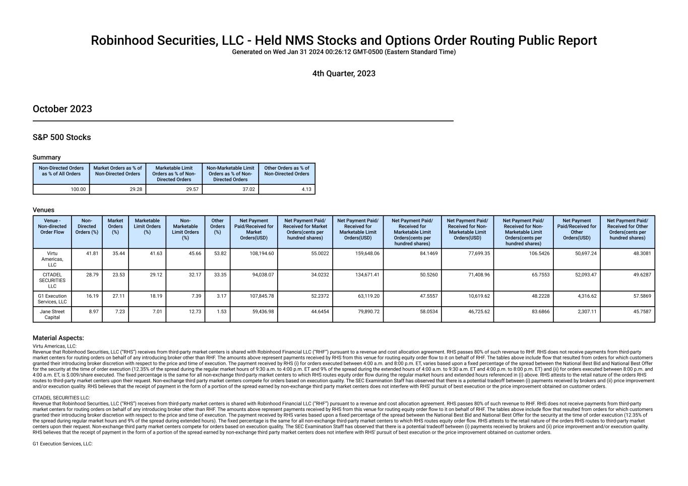 Robinhood Securities, LLC - Held NMS Stocks and Options Order Routing Public Report Generated on Wed Jan 31 2024 00:26:12 GMT-0500 (Eastern Standard Time) 4th Quarter, 2023 October 2023 S&P 500 Stocks Summary Non-Directed Orders as % of All Orders Market Orders as % of Non-Directed Orders Marketable Limit Orders as % of Non- Directed Orders Non-Marketable Limit Orders as % of Non- Directed Orders Other Orders as % of Non-Directed Orders 100.00 29.28 29.57 37.02 4.13 Venues Venue - Non-directed Order Flow Non- Directed Orders (%) Market Orders (%) Marketable Limit Orders (%) Non- Marketable Limit Orders (%) Other Orders (%) Net Payment Paid/Received for Market Orders(USD) Net Payment Paid/ Received for Market Orders(cents per hundred shares) Net Payment Paid/ Received for Marketable Limit Orders(USD) Net Payment Paid/ Received for Marketable Limit Orders(cents per hundred shares) Net Payment Paid/ Received for Non- Marketable Limit Orders(USD) Net Payment Paid/ Received for Non- Marketable Limit Orders(cents per hundred shares) Net Payment Paid/Received for Other Orders(USD) Net Payment Paid/ Received for Other Orders(cents per hundred shares) Virtu Americas, LLC 41.81 35.44 41.63 45.66 53.82 108,194.60 55.0022 159,648.06 84.1469 77,699.35 106.5426 50,697.24 48.3081 CITADEL SECURITIES LLC 28.79 23.53 29.12 32.17 33.35 94,038.07 34.0232 134,671.41 50.5260 71,408.96 65.7553 52,093.47 49.6287 G1 Execution Services, LLC 16.19 27.11 18.19 7.39 3.17 107,845.78 52.2372 63,119.20 47.5557 10,619.62 48.2228 4,316.62 57.5869 Jane Street Capital 8.97 7.23 7.01 12.73 1.53 59,436.98 44.6454 79,890.72 58.0534 46,725.62 83.6866 2,307.11 45.7587 Material Aspects: Virtu Americas, LLC: Revenue that Robinhood Securities, LLC (“RHS”) receives from third-party market centers is shared with Robinhood Financial LLC (“RHF”) pursuant to a revenue and cost allocation agreement. RHS passes 80% of such revenue to RHF. RHS does not receive payments from third-party market centers for routing orders on behalf of any introducing broker other than RHF. The amounts above represent payments received by RHS from this venue for routing equity order flow to it on behalf of RHF. The tables above include flow that resulted from orders for which customers granted their introducing broker discretion with respect to the price and time of execution. The payment received by RHS (i) for orders executed between 4:00 a.m. and 8:00 p.m. ET, varies based upon a fixed percentage of the spread between the National Best Bid and National Best Offer for the security at the time of order execution (12.35% of the spread during the regular market hours of 9:30 a.m. to 4:00 p.m. ET and 9% of the spread during the extended hours of 4:00 a.m. to 9:30 a.m. ET and 4:00 p.m. to 8:00 p.m. ET) and (ii) for orders executed between 8:00 p.m. and 4:00 a.m. ET, is $.009/share executed. The fixed percentage is the same for all non-exchange third-party market centers to which RHS routes equity order flow during the regular market hours and extended hours referenced in (i) above. RHS attests to the retail nature of the orders RHS routes to third-party market centers upon their request. Non-exchange third party market centers compete for orders based on execution quality. The SEC Examination Staff has observed that there is a potential tradeoff between (i) payments received by brokers and (ii) price improvement and/or execution quality. RHS believes that the receipt of payment in the form of a portion of the spread earned by non-exchange third party market centers does not interfere with RHS' pursuit of best execution or the price improvement obtained on customer orders. CITADEL SECURITIES LLC: Revenue that Robinhood Securities, LLC (“RHS”) receives from third-party market centers is shared with Robinhood Financial LLC (“RHF”) pursuant to a revenue and cost allocation agreement. RHS passes 80% of such revenue to RHF. RHS does not receive payments from third-party market centers for routing orders on behalf of any introducing broker other than RHF. The amounts above represent payments received by RHS from this venue for routing equity order flow to it on behalf of RHF. The tables above include flow that resulted from orders for which customers granted their introducing broker discretion with respect to the price and time of execution. The payment received by RHS varies based upon a fixed percentage of the spread between the National Best Bid and National Best Offer for the security at the time of order execution (12.35% of the spread during regular market hours and 9% of the spread during extended hours). The fixed percentage is the same for all non-exchange third-party market centers to which RHS routes equity order flow. RHS attests to the retail nature of the orders RHS routes to third-party market centers upon their request. Non-exchange third party market centers compete for orders based on execution quality. The SEC Examination Staff has observed that there is a potential tradeoff between (i) payments received by brokers and (ii) price improvement and/or execution quality. RHS believes that the receipt of payment in the form of a portion of the spread earned by non-exchange third party market centers does not interfere with RHS' pursuit of best execution or the price improvement obtained on customer orders. G1 Execution Services, LLC: