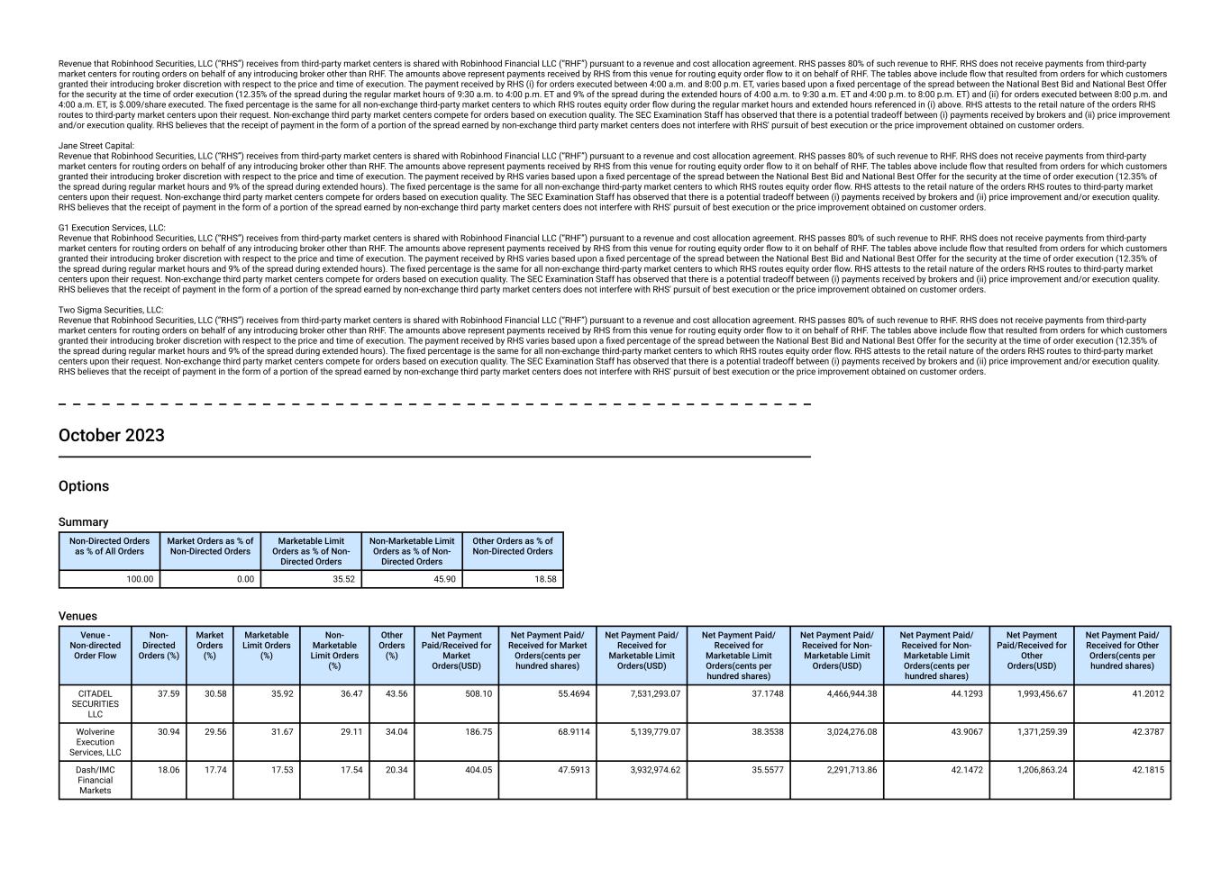 Revenue that Robinhood Securities, LLC (“RHS”) receives from third-party market centers is shared with Robinhood Financial LLC (“RHF”) pursuant to a revenue and cost allocation agreement. RHS passes 80% of such revenue to RHF. RHS does not receive payments from third-party market centers for routing orders on behalf of any introducing broker other than RHF. The amounts above represent payments received by RHS from this venue for routing equity order flow to it on behalf of RHF. The tables above include flow that resulted from orders for which customers granted their introducing broker discretion with respect to the price and time of execution. The payment received by RHS varies based upon a fixed percentage of the spread between the National Best Bid and National Best Offer for the security at the time of order execution (12.35% of the spread during regular market hours and 9% of the spread during extended hours). The fixed percentage is the same for all non-exchange third-party market centers to which RHS routes equity order flow. RHS attests to the retail nature of the orders RHS routes to third-party market centers upon their request. Non-exchange third party market centers compete for orders based on execution quality. The SEC Examination Staff has observed that there is a potential tradeoff between (i) payments received by brokers and (ii) price improvement and/or execution quality. RHS believes that the receipt of payment in the form of a portion of the spread earned by non-exchange third party market centers does not interfere with RHS' pursuit of best execution or the price improvement obtained on customer orders. G1 Execution Services, LLC: Revenue that Robinhood Securities, LLC (“RHS”) receives from third-party market centers is shared with Robinhood Financial LLC (“RHF”) pursuant to a revenue and cost allocation agreement. RHS passes 80% of such revenue to RHF. RHS does not receive payments from third-party market centers for routing orders on behalf of any introducing broker other than RHF. The amounts above represent payments received by RHS from this venue for routing equity order flow to it on behalf of RHF. The tables above include flow that resulted from orders for which customers granted their introducing broker discretion with respect to the price and time of execution. The payment received by RHS varies based upon a fixed percentage of the spread between the National Best Bid and National Best Offer for the security at the time of order execution (12.35% of the spread during regular market hours and 9% of the spread during extended hours). The fixed percentage is the same for all non-exchange third-party market centers to which RHS routes equity order flow. RHS attests to the retail nature of the orders RHS routes to third-party market centers upon their request. Non-exchange third party market centers compete for orders based on execution quality. The SEC Examination Staff has observed that there is a potential tradeoff between (i) payments received by brokers and (ii) price improvement and/or execution quality. RHS believes that the receipt of payment in the form of a portion of the spread earned by non-exchange third party market centers does not interfere with RHS' pursuit of best execution or the price improvement obtained on customer orders. November 2023 Options Summary Non-Directed Orders as % of All Orders Market Orders as % of Non-Directed Orders Marketable Limit Orders as % of Non- Directed Orders Non-Marketable Limit Orders as % of Non- Directed Orders Other Orders as % of Non-Directed Orders 100.00 0.01 35.78 46.82 17.40 Venues Venue - Non-directed Order Flow Non- Directed Orders (%) Market Orders (%) Marketable Limit Orders (%) Non- Marketable Limit Orders (%) Other Orders (%) Net Payment Paid/Received for Market Orders(USD) Net Payment Paid/ Received for Market Orders(cents per hundred shares) Net Payment Paid/ Received for Marketable Limit Orders(USD) Net Payment Paid/ Received for Marketable Limit Orders(cents per hundred shares) Net Payment Paid/ Received for Non- Marketable Limit Orders(USD) Net Payment Paid/ Received for Non- Marketable Limit Orders(cents per hundred shares) Net Payment Paid/Received for Other Orders(USD) Net Payment Paid/ Received for Other Orders(cents per hundred shares) CITADEL SECURITIES LLC 29.26 34.45 25.49 29.98 35.06 291.95 66.9610 6,821,646.19 40.0173 4,084,216.68 50.5005 1,582,281.61 43.8323 Wolverine Execution Services, LLC 27.13 26.22 27.54 25.18 31.53 641.90 58.0380 5,101,268.14 38.7128 2,827,675.20 46.1477 1,175,607.63 43.2693 Dash/IMC Financial Markets 24.14 18.08 24.60 22.77 26.91 115.25 70.2744 4,785,275.68 37.1233 2,702,437.19 45.3263 1,102,340.48 43.7216 Morgan Stanley & Co., LLC 14.76 16.29 17.71 17.32 1.79 77.05 67.5877 4,292,719.54 37.9912 2,511,177.06 47.1353 59,656.43 39.0468 Material Aspects: CITADEL SECURITIES LLC: