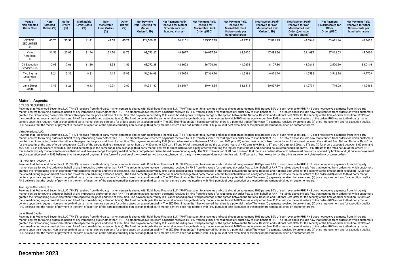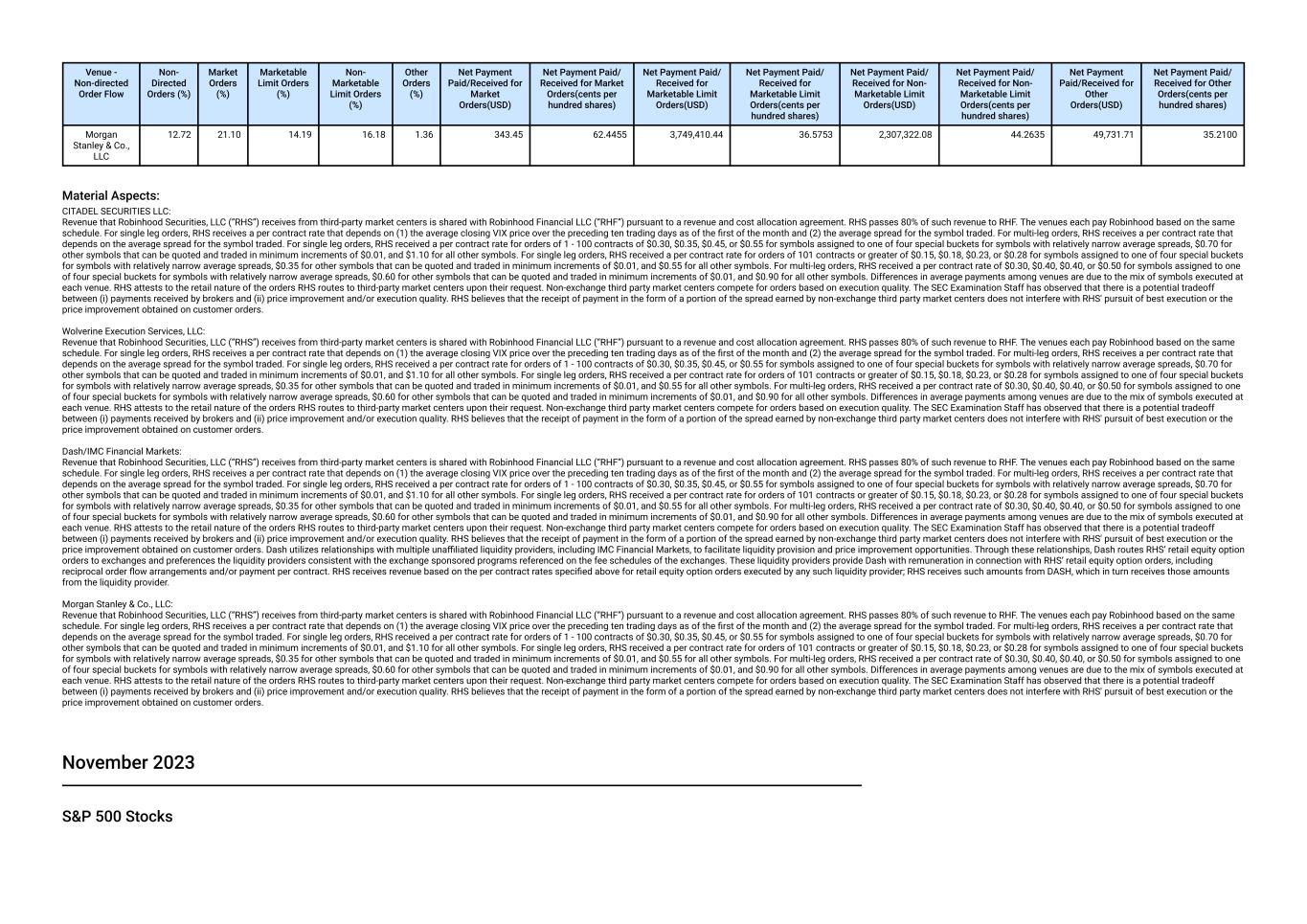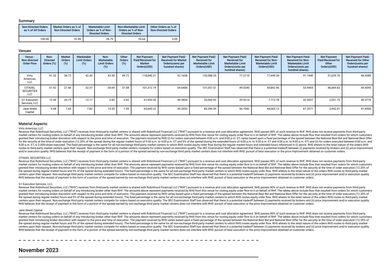 Revenue that Robinhood Securities, LLC (“RHS”) receives from third-party market centers is shared with Robinhood Financial LLC (“RHF”) pursuant to a revenue and cost allocation agreement. RHS passes 80% of such revenue to RHF. RHS does not receive payments from third-party market centers for routing orders on behalf of any introducing broker other than RHF. The amounts above represent payments received by RHS from this venue for routing equity order flow to it on behalf of RHF. The tables above include flow that resulted from orders for which customers granted their introducing broker discretion with respect to the price and time of execution. The payment received by RHS varies based upon a fixed percentage of the spread between the National Best Bid and National Best Offer for the security at the time of order execution (12.35% of the spread during regular market hours and 9% of the spread during extended hours). The fixed percentage is the same for all non-exchange third-party market centers to which RHS routes equity order flow. RHS attests to the retail nature of the orders RHS routes to third-party market centers upon their request. Non-exchange third party market centers compete for orders based on execution quality. The SEC Examination Staff has observed that there is a potential tradeoff between (i) payments received by brokers and (ii) price improvement and/or execution quality. RHS believes that the receipt of payment in the form of a portion of the spread earned by non-exchange third party market centers does not interfere with RHS' pursuit of best execution or the price improvement obtained on customer orders. Jane Street Capital: Revenue that Robinhood Securities, LLC (“RHS”) receives from third-party market centers is shared with Robinhood Financial LLC (“RHF”) pursuant to a revenue and cost allocation agreement. RHS passes 80% of such revenue to RHF. RHS does not receive payments from third-party market centers for routing orders on behalf of any introducing broker other than RHF. The amounts above represent payments received by RHS from this venue for routing equity order flow to it on behalf of RHF. The tables above include flow that resulted from orders for which customers granted their introducing broker discretion with respect to the price and time of execution. The payment received by RHS varies based upon a fixed percentage of the spread between the National Best Bid and National Best Offer for the security at the time of order execution (12.35% of the spread during regular market hours and 9% of the spread during extended hours). The fixed percentage is the same for all non-exchange third-party market centers to which RHS routes equity order flow. RHS attests to the retail nature of the orders RHS routes to third-party market centers upon their request. Non-exchange third party market centers compete for orders based on execution quality. The SEC Examination Staff has observed that there is a potential tradeoff between (i) payments received by brokers and (ii) price improvement and/or execution quality. RHS believes that the receipt of payment in the form of a portion of the spread earned by non-exchange third party market centers does not interfere with RHS' pursuit of best execution or the price improvement obtained on customer orders. October 2023 Non-S&P 500 Stocks Summary Non-Directed Orders as % of All Orders Market Orders as % of Non-Directed Orders Marketable Limit Orders as % of Non- Directed Orders Non-Marketable Limit Orders as % of Non- Directed Orders Other Orders as % of Non-Directed Orders 100.00 23.60 32.15 41.56 2.69 Venues Venue - Non-directed Order Flow Non- Directed Orders (%) Market Orders (%) Marketable Limit Orders (%) Non- Marketable Limit Orders (%) Other Orders (%) Net Payment Paid/Received for Market Orders(USD) Net Payment Paid/ Received for Market Orders(cents per hundred shares) Net Payment Paid/ Received for Marketable Limit Orders(USD) Net Payment Paid/ Received for Marketable Limit Orders(cents per hundred shares) Net Payment Paid/ Received for Non- Marketable Limit Orders(USD) Net Payment Paid/ Received for Non- Marketable Limit Orders(cents per hundred shares) Net Payment Paid/Received for Other Orders(USD) Net Payment Paid/ Received for Other Orders(cents per hundred shares) CITADEL SECURITIES LLC 35.55 33.07 33.59 37.82 45.67 660,436.98 12.6136 860,285.33 9.4686 400,218.12 9.9904 151,194.79 14.6612 Virtu Americas, LLC 26.73 22.20 26.55 29.11 31.97 405,888.99 13.4779 517,184.69 8.9454 279,832.06 9.4881 80,443.44 13.5069 Jane Street Capital 25.03 20.72 25.51 28.22 7.87 626,795.51 11.9442 769,810.82 7.8583 420,040.77 9.0537 24,874.67 11.8044 G1 Execution Services, LLC 6.93 13.70 7.75 2.70 3.01 297,138.15 11.4454 196,318.01 9.1025 39,101.04 10.0161 11,734.00 10.9866 Two Sigma Securities, LLC 5.32 9.46 6.09 1.98 11.46 185,173.54 8.6046 121,420.56 5.9232 22,905.67 7.3692 18,223.43 10.0925 Material Aspects: CITADEL SECURITIES LLC: Revenue that Robinhood Securities, LLC (“RHS”) receives from third-party market centers is shared with Robinhood Financial LLC (“RHF”) pursuant to a revenue and cost allocation agreement. RHS passes 80% of such revenue to RHF. RHS does not receive payments from third-party market centers for routing orders on behalf of any introducing broker other than RHF. The amounts above represent payments received by RHS from this venue for routing equity order flow to it on behalf of RHF. The tables above include flow that resulted from orders for which customers granted their introducing broker discretion with respect to the price and time of execution. The payment received by RHS varies based upon a fixed percentage of the spread between the National Best Bid and National Best Offer for the security at the time of order execution (12.35% of the spread during regular market hours and 9% of the spread during extended hours). The fixed percentage is the same for all non-exchange third-party market