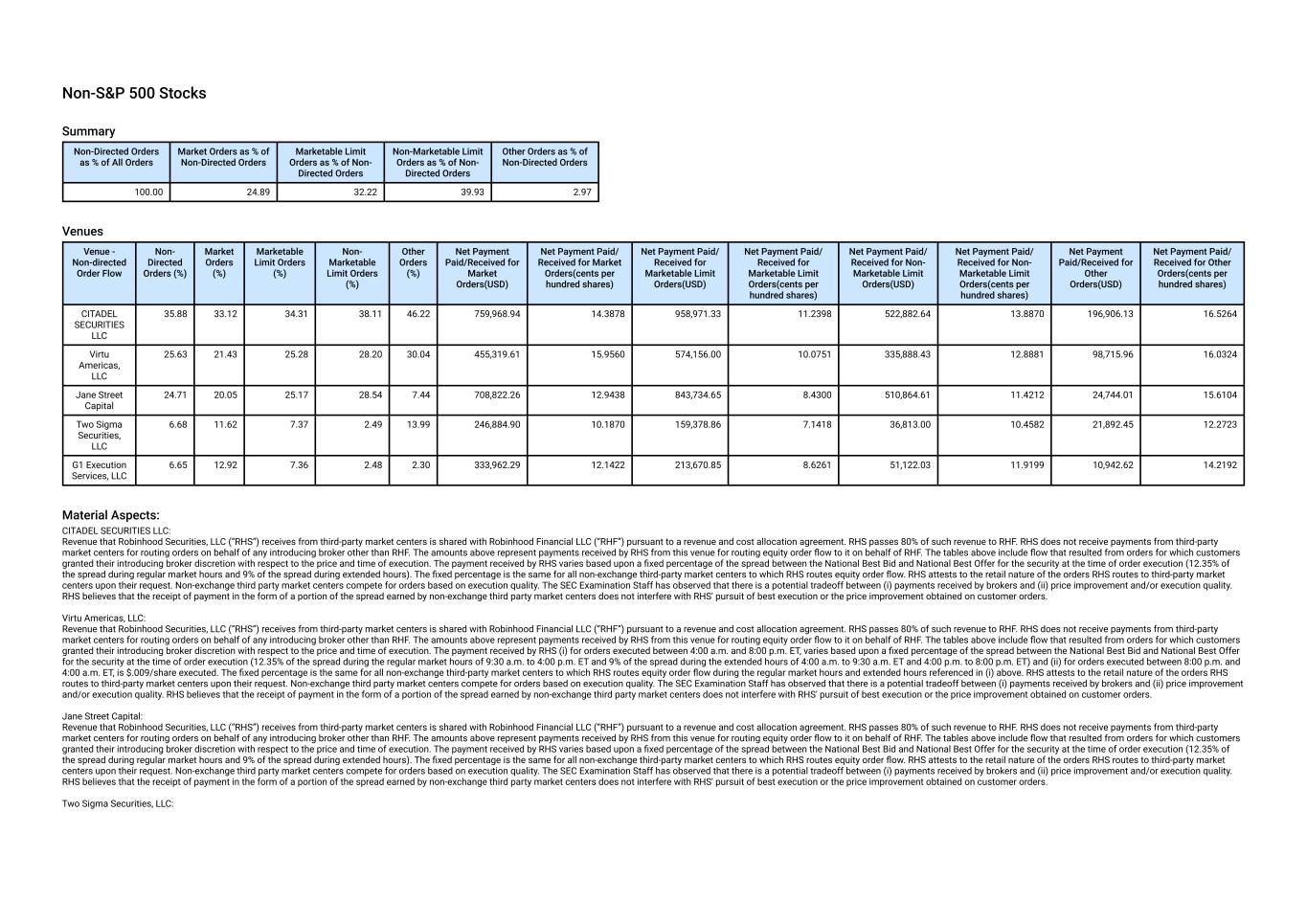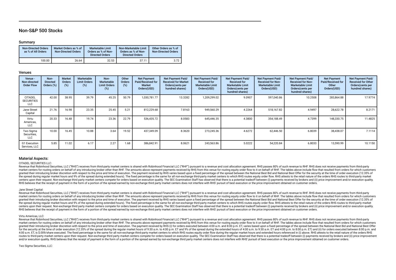 Non-S&P 500 Stocks Summary Non-Directed Orders as % of All Orders Market Orders as % of Non-Directed Orders Marketable Limit Orders as % of Non- Directed Orders Non-Marketable Limit Orders as % of Non- Directed Orders Other Orders as % of Non-Directed Orders 100.00 24.89 32.22 39.93 2.97 Venues Venue - Non-directed Order Flow Non- Directed Orders (%) Market Orders (%) Marketable Limit Orders (%) Non- Marketable Limit Orders (%) Other Orders (%) Net Payment Paid/Received for Market Orders(USD) Net Payment Paid/ Received for Market Orders(cents per hundred shares) Net Payment Paid/ Received for Marketable Limit Orders(USD) Net Payment Paid/ Received for Marketable Limit Orders(cents per hundred shares) Net Payment Paid/ Received for Non- Marketable Limit Orders(USD) Net Payment Paid/ Received for Non- Marketable Limit Orders(cents per hundred shares) Net Payment Paid/Received for Other Orders(USD) Net Payment Paid/ Received for Other Orders(cents per hundred shares) CITADEL SECURITIES LLC 35.88 33.12 34.31 38.11 46.22 759,968.94 14.3878 958,971.33 11.2398 522,882.64 13.8870 196,906.13 16.5264 Virtu Americas, LLC 25.63 21.43 25.28 28.20 30.04 455,319.61 15.9560 574,156.00 10.0751 335,888.43 12.8881 98,715.96 16.0324 Jane Street Capital 24.71 20.05 25.17 28.54 7.44 708,822.26 12.9438 843,734.65 8.4300 510,864.61 11.4212 24,744.01 15.6104 Two Sigma Securities, LLC 6.68 11.62 7.37 2.49 13.99 246,884.90 10.1870 159,378.86 7.1418 36,813.00 10.4582 21,892.45 12.2723 G1 Execution Services, LLC 6.65 12.92 7.36 2.48 2.30 333,962.29 12.1422 213,670.85 8.6261 51,122.03 11.9199 10,942.62 14.2192 Material Aspects: CITADEL SECURITIES LLC: Revenue that Robinhood Securities, LLC (“RHS”) receives from third-party market centers is shared with Robinhood Financial LLC (“RHF”) pursuant to a revenue and cost allocation agreement. RHS passes 80% of such revenue to RHF. RHS does not receive payments from third-party market centers for routing orders on behalf of any introducing broker other than RHF. The amounts above represent payments received by RHS from this venue for routing equity order flow to it on behalf of RHF. The tables above include flow that resulted from orders for which customers granted their introducing broker discretion with respect to the price and time of execution. The payment received by RHS varies based upon a fixed percentage of the spread between the National Best Bid and National Best Offer for the security at the time of order execution (12.35% of the spread during regular market hours and 9% of the spread during extended hours). The fixed percentage is the same for all non-exchange third-party market centers to which RHS routes equity order flow. RHS attests to the retail nature of the orders RHS routes to third-party market centers upon their request. Non-exchange third party market centers compete for orders based on execution quality. The SEC Examination Staff has observed that there is a potential tradeoff between (i) payments received by brokers and (ii) price improvement and/or execution quality. RHS believes that the receipt of payment in the form of a portion of the spread earned by non-exchange third party market centers does not interfere with RHS' pursuit of best execution or the price improvement obtained on customer orders. Virtu Americas, LLC: Revenue that Robinhood Securities, LLC (“RHS”) receives from third-party market centers is shared with Robinhood Financial LLC (“RHF”) pursuant to a revenue and cost allocation agreement. RHS passes 80% of such revenue to RHF. RHS does not receive payments from third-party market centers for routing orders on behalf of any introducing broker other than RHF. The amounts above represent payments received by RHS from this venue for routing equity order flow to it on behalf of RHF. The tables above include flow that resulted from orders for which customers granted their introducing broker discretion with respect to the price and time of execution. The payment received by RHS (i) for orders executed between 4:00 a.m. and 8:00 p.m. ET, varies based upon a fixed percentage of the spread between the National Best Bid and National Best Offer for the security at the time of order execution (12.35% of the spread during the regular market hours of 9:30 a.m. to 4:00 p.m. ET and 9% of the spread during the extended hours of 4:00 a.m. to 9:30 a.m. ET and 4:00 p.m. to 8:00 p.m. ET) and (ii) for orders executed between 8:00 p.m. and 4:00 a.m. ET, is $.009/share executed. The fixed percentage is the same for all non-exchange third-party market centers to which RHS routes equity order flow during the regular market hours and extended hours referenced in (i) above. RHS attests to the retail nature of the orders RHS routes to third-party market centers upon their request. Non-exchange third party market centers compete for orders based on execution quality. The SEC Examination Staff has observed that there is a potential tradeoff between (i) payments received by brokers and (ii) price improvement and/or execution quality. RHS believes that the receipt of payment in the form of a portion of the spread earned by non-exchange third party market centers does not interfere with RHS' pursuit of best execution or the price improvement obtained on customer orders. Jane Street Capital: Revenue that Robinhood Securities, LLC (“RHS”) receives from third-party market centers is shared with Robinhood Financial LLC (“RHF”) pursuant to a revenue and cost allocation agreement. RHS passes 80% of such revenue to RHF. RHS does not receive payments from third-party market centers for routing orders on behalf of any introducing broker other than RHF. The amounts above represent payments received by RHS from this venue for routing equity order flow to it on behalf of RHF. The tables above include flow that resulted from orders for which customers granted their introducing broker discretion with respect to the price and time of execution. The payment 