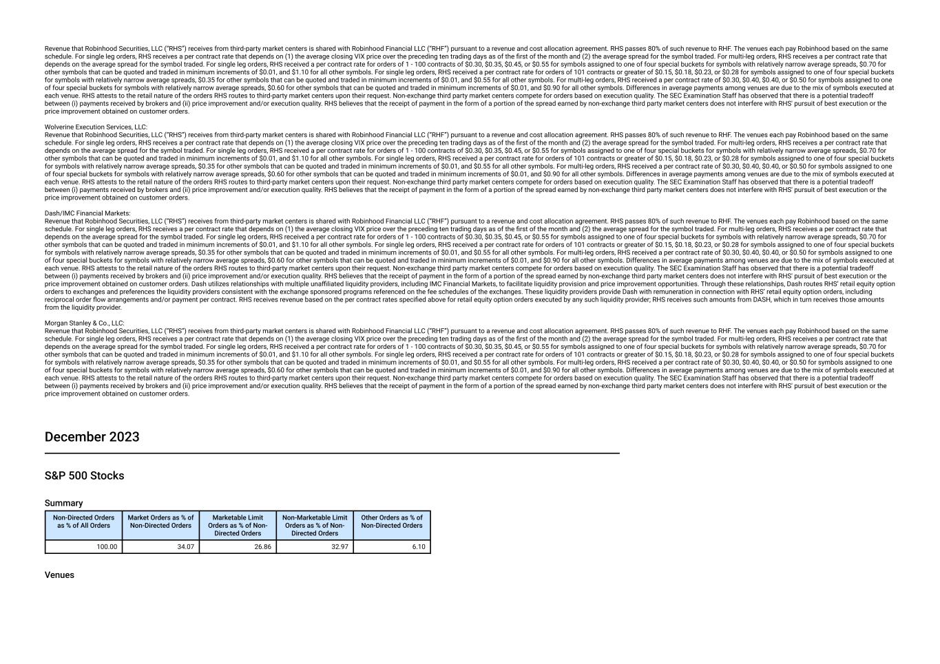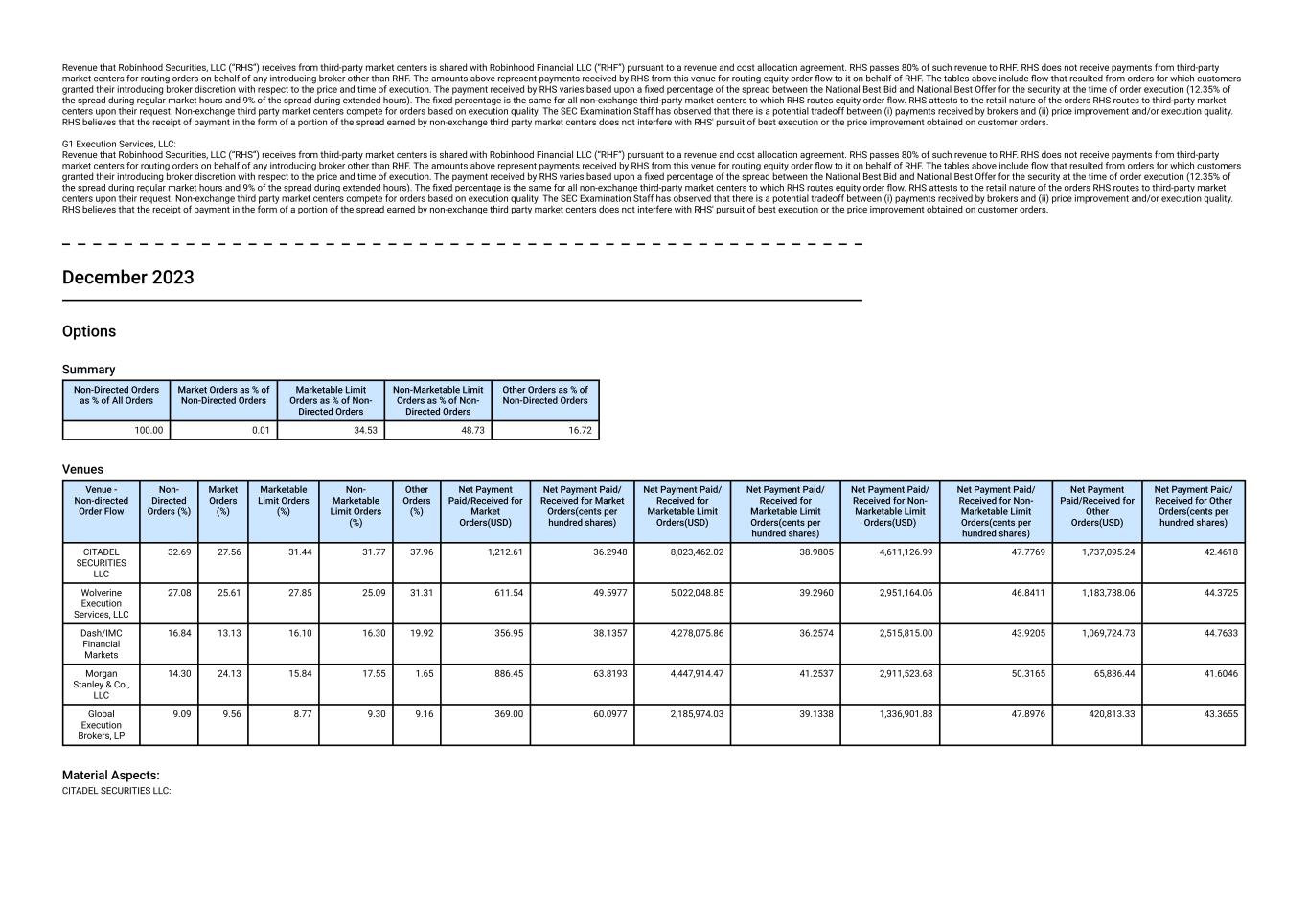Revenue that Robinhood Securities, LLC (“RHS”) receives from third-party market centers is shared with Robinhood Financial LLC (“RHF”) pursuant to a revenue and cost allocation agreement. RHS passes 80% of such revenue to RHF. RHS does not receive payments from third-party market centers for routing orders on behalf of any introducing broker other than RHF. The amounts above represent payments received by RHS from this venue for routing equity order flow to it on behalf of RHF. The tables above include flow that resulted from orders for which customers granted their introducing broker discretion with respect to the price and time of execution. The payment received by RHS varies based upon a fixed percentage of the spread between the National Best Bid and National Best Offer for the security at the time of order execution (12.35% of the spread during regular market hours and 9% of the spread during extended hours). The fixed percentage is the same for all non-exchange third-party market centers to which RHS routes equity order flow. RHS attests to the retail nature of the orders RHS routes to third-party market centers upon their request. Non-exchange third party market centers compete for orders based on execution quality. The SEC Examination Staff has observed that there is a potential tradeoff between (i) payments received by brokers and (ii) price improvement and/or execution quality. RHS believes that the receipt of payment in the form of a portion of the spread earned by non-exchange third party market centers does not interfere with RHS' pursuit of best execution or the price improvement obtained on customer orders. G1 Execution Services, LLC: Revenue that Robinhood Securities, LLC (“RHS”) receives from third-party market centers is shared with Robinhood Financial LLC (“RHF”) pursuant to a revenue and cost allocation agreement. RHS passes 80% of such revenue to RHF. RHS does not receive payments from third-party market centers for routing orders on behalf of any introducing broker other than RHF. The amounts above represent payments received by RHS from this venue for routing equity order flow to it on behalf of RHF. The tables above include flow that resulted from orders for which customers granted their introducing broker discretion with respect to the price and time of execution. The payment received by RHS varies based upon a fixed percentage of the spread between the National Best Bid and National Best Offer for the security at the time of order execution (12.35% of the spread during regular market hours and 9% of the spread during extended hours). The fixed percentage is the same for all non-exchange third-party market centers to which RHS routes equity order flow. RHS attests to the retail nature of the orders RHS routes to third-party market centers upon their request. Non-exchange third party market centers compete for orders based on execution quality. The SEC Examination Staff has observed that there is a potential tradeoff between (i) payments received by brokers and (ii) price improvement and/or execution quality. RHS believes that the receipt of payment in the form of a portion of the spread earned by non-exchange third party market centers does not interfere with RHS' pursuit of best execution or the price improvement obtained on customer orders. December 2023 Options Summary Non-Directed Orders as % of All Orders Market Orders as % of Non-Directed Orders Marketable Limit Orders as % of Non- Directed Orders Non-Marketable Limit Orders as % of Non- Directed Orders Other Orders as % of Non-Directed Orders 100.00 0.01 34.53 48.73 16.72 Venues Venue - Non-directed Order Flow Non- Directed Orders (%) Market Orders (%) Marketable Limit Orders (%) Non- Marketable Limit Orders (%) Other Orders (%) Net Payment Paid/Received for Market Orders(USD) Net Payment Paid/ Received for Market Orders(cents per hundred shares) Net Payment Paid/ Received for Marketable Limit Orders(USD) Net Payment Paid/ Received for Marketable Limit Orders(cents per hundred shares) Net Payment Paid/ Received for Non- Marketable Limit Orders(USD) Net Payment Paid/ Received for Non- Marketable Limit Orders(cents per hundred shares) Net Payment Paid/Received for Other Orders(USD) Net Payment Paid/ Received for Other Orders(cents per hundred shares) CITADEL SECURITIES LLC 32.69 27.56 31.44 31.77 37.96 1,212.61 36.2948 8,023,462.02 38.9805 4,611,126.99 47.7769 1,737,095.24 42.4618 Wolverine Execution Services, LLC 27.08 25.61 27.85 25.09 31.31 611.54 49.5977 5,022,048.85 39.2960 2,951,164.06 46.8411 1,183,738.06 44.3725 Dash/IMC Financial Markets 16.84 13.13 16.10 16.30 19.92 356.95 38.1357 4,278,075.86 36.2574 2,515,815.00 43.9205 1,069,724.73 44.7633 Morgan Stanley & Co., LLC 14.30 24.13 15.84 17.55 1.65 886.45 63.8193 4,447,914.47 41.2537 2,911,523.68 50.3165 65,836.44 41.6046 Global Execution Brokers, LP 9.09 9.56 8.77 9.30 9.16 369.00 60.0977 2,185,974.03 39.1338 1,336,901.88 47.8976 420,813.33 43.3655 Material Aspects: CITADEL SECURITIES LLC: