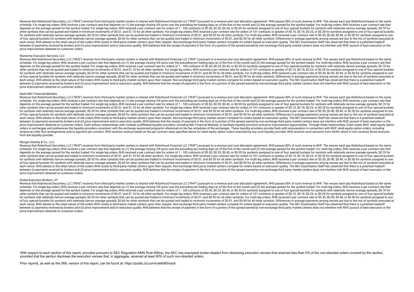 Venue - Non-directed Order Flow Non- Directed Orders (%) Market Orders (%) Marketable Limit Orders (%) Non- Marketable Limit Orders (%) Other Orders (%) Net Payment Paid/Received for Market Orders(USD) Net Payment Paid/ Received for Market Orders(cents per hundred shares) Net Payment Paid/ Received for Marketable Limit Orders(USD) Net Payment Paid/ Received for Marketable Limit Orders(cents per hundred shares) Net Payment Paid/ Received for Non- Marketable Limit Orders(USD) Net Payment Paid/ Received for Non- Marketable Limit Orders(cents per hundred shares) Net Payment Paid/Received for Other Orders(USD) Net Payment Paid/ Received for Other Orders(cents per hundred shares) Morgan Stanley & Co., LLC 12.72 21.10 14.19 16.18 1.36 343.45 62.4455 3,749,410.44 36.5753 2,307,322.08 44.2635 49,731.71 35.2100 Material Aspects: CITADEL SECURITIES LLC: Revenue that Robinhood Securities, LLC (“RHS”) receives from third-party market centers is shared with Robinhood Financial LLC (“RHF”) pursuant to a revenue and cost allocation agreement. RHS passes 80% of such revenue to RHF. The venues each pay Robinhood based on the same schedule. For single leg orders, RHS receives a per contract rate that depends on (1) the average closing VIX price over the preceding ten trading days as of the first of the month and (2) the average spread for the symbol traded. For multi-leg orders, RHS receives a per contract rate that depends on the average spread for the symbol traded. For single leg orders, RHS received a per contract rate for orders of 1 - 100 contracts of $0.30, $0.35, $0.45, or $0.55 for symbols assigned to one of four special buckets for symbols with relatively narrow average spreads, $0.70 for other symbols that can be quoted and traded in minimum increments of $0.01, and $1.10 for all other symbols. For single leg orders, RHS received a per contract rate for orders of 101 contracts or greater of $0.15, $0.18, $0.23, or $0.28 for symbols assigned to one of four special buckets for symbols with relatively narrow average spreads, $0.35 for other symbols that can be quoted and traded in minimum increments of $0.01, and $0.55 for all other symbols. For multi-leg orders, RHS received a per contract rate of $0.30, $0.40, $0.40, or $0.50 for symbols assigned to one of four special buckets for symbols with relatively narrow average spreads, $0.60 for other symbols that can be quoted and traded in minimum increments of $0.01, and $0.90 for all other symbols. Differences in average payments among venues are due to the mix of symbols executed at each venue. RHS attests to the retail nature of the orders RHS routes to third-party market centers upon their request. Non-exchange third party market centers compete for orders based on execution quality. The SEC Examination Staff has observed that there is a potential tradeoff between (i) payments received by brokers and (ii) price improvement and/or execution quality. RHS believes that the receipt of payment in the form of a portion of the spread earned by non-exchange third party market centers does not interfere with RHS' pursuit of best execution or the price improvement obtained on customer orders. Wolverine Execution Services, LLC: Revenue that Robinhood Securities, LLC (“RHS”) receives from third-party market centers is shared with Robinhood Financial LLC (“RHF”) pursuant to a revenue and cost allocation agreement. RHS passes 80% of such revenue to RHF. The venues each pay Robinhood based on the same schedule. For single leg orders, RHS receives a per contract rate that depends on (1) the average closing VIX price over the preceding ten trading days as of the first of the month and (2) the average spread for the symbol traded. For multi-leg orders, RHS receives a per contract rate that depends on the average spread for the symbol traded. For single leg orders, RHS received a per contract rate for orders of 1 - 100 contracts of $0.30, $0.35, $0.45, or $0.55 for symbols assigned to one of four special buckets for symbols with relatively narrow average spreads, $0.70 for other symbols that can be quoted and traded in minimum increments of $0.01, and $1.10 for all other symbols. For single leg orders, RHS received a per contract rate for orders of 101 contracts or greater of $0.15, $0.18, $0.23, or $0.28 for symbols assigned to one of four special buckets for symbols with relatively narrow average spreads, $0.35 for other symbols that can be quoted and traded in minimum increments of $0.01, and $0.55 for all other symbols. For multi-leg orders, RHS received a per contract rate of $0.30, $0.40, $0.40, or $0.50 for symbols assigned to one of four special buckets for symbols with relatively narrow average spreads, $0.60 for other symbols that can be quoted and traded in minimum increments of $0.01, and $0.90 for all other symbols. Differences in average payments among venues are due to the mix of symbols executed at each venue. RHS attests to the retail nature of the orders RHS routes to third-party market centers upon their request. Non-exchange third party market centers compete for orders based on execution quality. The SEC Examination Staff has observed that there is a potential tradeoff between (i) payments received by brokers and (ii) price improvement and/or execution quality. RHS believes that the receipt of payment in the form of a portion of the spread earned by non-exchange third party market centers does not interfere with RHS' pursuit of best execution or the price improvement obtained on customer orders. Dash/IMC Financial Markets: Revenue that Robinhood Securities, LLC (“RHS”) receives from third-party market centers is shared with Robinhood Financial LLC (“RHF”) pursuant to a revenue and cost allocation agreement. RHS passes 80% of such revenue to RHF. The venues each pay Robinhood based on the same schedule. For single leg orders, RHS receives a per contract rate that depends on (1) the average closing VIX price over the preced