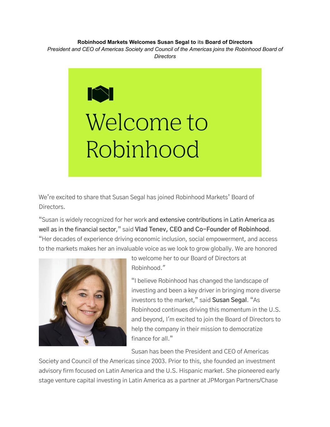 Robinhood Markets Welcomes Susan Segal to its Board of Directors President and CEO of Americas Society and Council of the Americas joins the Robinhood Board of Directors We’re excited to share that Susan Segal has joined Robinhood Markets’ Board of Directors. “Susan is widely recognized for her work and extensive contributions in Latin America as well as in the financial sector,” said Vlad Tenev, CEO and Co-Founder of Robinhood. “Her decades of experience driving economic inclusion, social empowerment, and access to the markets makes her an invaluable voice as we look to grow globally. We are honored to welcome her to our Board of Directors at Robinhood." “I believe Robinhood has changed the landscape of investing and been a key driver in bringing more diverse investors to the market,” said Susan Segal. “As Robinhood continues driving this momentum in the U.S. and beyond, I'm excited to join the Board of Directors to help the company in their mission to democratize finance for all.” Susan has been the President and CEO of Americas Society and Council of the Americas since 2003. Prior to this, she founded an investment advisory firm focused on Latin America and the U.S. Hispanic market. She pioneered early stage venture capital investing in Latin America as a partner at JPMorgan Partners/Chase