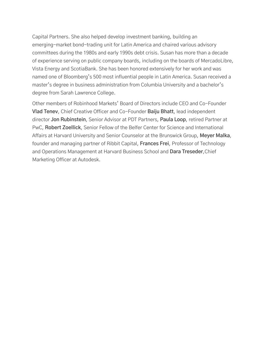 Capital Partners. She also helped develop investment banking, building an emerging-market bond-trading unit for Latin America and chaired various advisory committees during the 1980s and early 1990s debt crisis. Susan has more than a decade of experience serving on public company boards, including on the boards of MercadoLibre, Vista Energy and ScotiaBank. She has been honored extensively for her work and was named one of Bloomberg’s 500 most influential people in Latin America. Susan received a master’s degree in business administration from Columbia University and a bachelor’s degree from Sarah Lawrence College. Other members of Robinhood Markets’ Board of Directors include CEO and Co-Founder Vlad Tenev, Chief Creative Officer and Co-Founder Baiju Bhatt, lead independent director Jon Rubinstein, Senior Advisor at PDT Partners, Paula Loop, retired Partner at PwC, Robert Zoellick, Senior Fellow of the Belfer Center for Science and International Affairs at Harvard University and Senior Counselor at the Brunswick Group,Meyer Malka, founder and managing partner of Ribbit Capital, Frances Frei, Professor of Technology and Operations Management at Harvard Business School and Dara Treseder,Chief Marketing Officer at Autodesk.