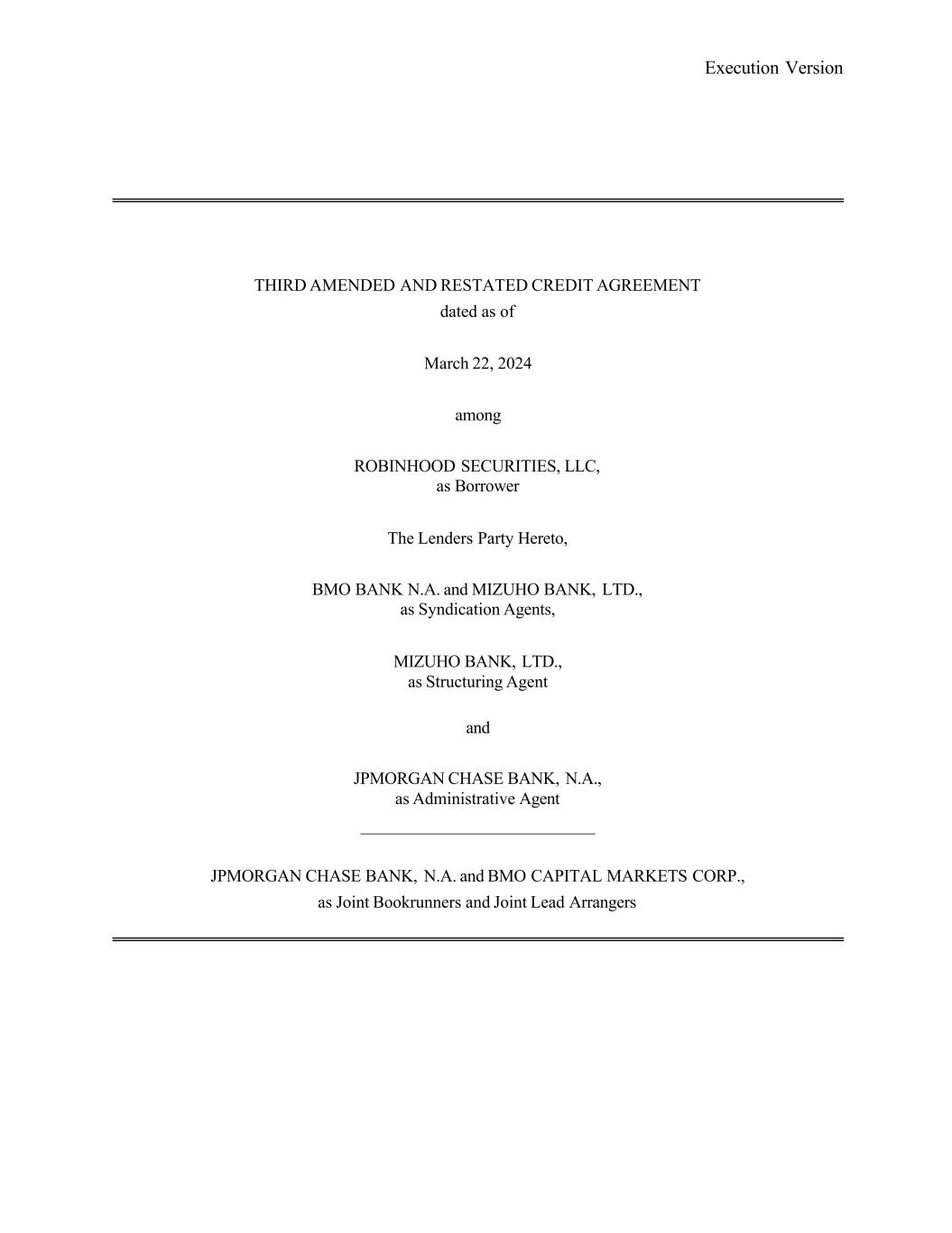 Execution Version THIRD AMENDED AND RESTATED CREDIT AGREEMENT dated as of March 22, 2024 among ROBINHOOD SECURITIES, LLC, as Borrower The Lenders Party Hereto, BMO BANK N.A. and MIZUHO BANK, LTD., as Syndication Agents, MIZUHO BANK, LTD., as Structuring Agent and JPMORGAN CHASE BANK, N.A., as Administrative Agent JPMORGAN CHASE BANK, N.A. and BMO CAPITAL MARKETS CORP., as Joint Bookrunners and Joint Lead Arrangers