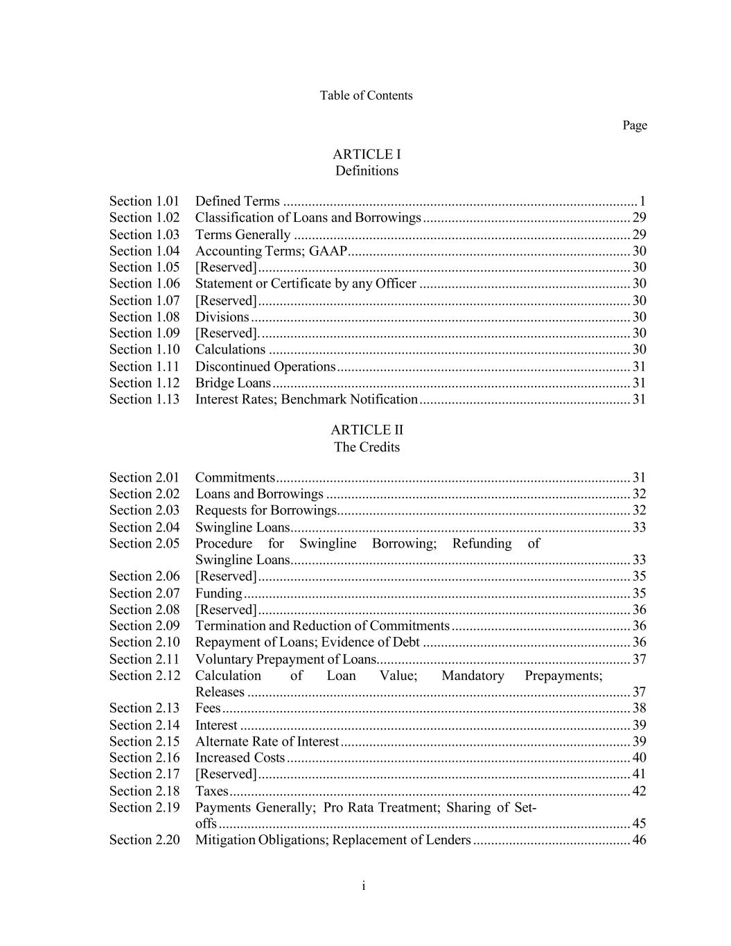 i Table of Contents Page ARTICLE I Definitions Section 1.01 Defined Terms ................................................................................................... 1 Section 1.02 Classification of Loans and Borrowings .......................................................... 29 Section 1.03 Terms Generally .............................................................................................. 29 Section 1.04 Accounting Terms; GAAP ............................................................................... 30 Section 1.05 [Reserved] ........................................................................................................ 30 Section 1.06 Statement or Certificate by any Officer ........................................................... 30 Section 1.07 [Reserved] ........................................................................................................ 30 Section 1.08 Divisions .......................................................................................................... 30 Section 1.09 [Reserved]. ....................................................................................................... 30 Section 1.10 Calculations ..................................................................................................... 30 Section 1.11 Discontinued Operations .................................................................................. 31 Section 1.12 Bridge Loans .................................................................................................... 31 Section 1.13 Interest Rates; Benchmark Notification ........................................................... 31 ARTICLE II The Credits Section 2.01 Commitments ................................................................................................... 31 Section 2.02 Loans and Borrowings ..................................................................................... 32 Section 2.03 Requests for Borrowings .................................................................................. 32 Section 2.04 Swingline Loans ............................................................................................... 33 Section 2.05 Procedure for Swingline Borrowing; Refunding of Swingline Loans ............................................................................................... 33 Section 2.06 [Reserved] ........................................................................................................ 35 Section 2.07 Funding ............................................................................................................ 35 Section 2.08 [Reserved] ........................................................................................................ 36 Section 2.09 Termination and Reduction of Commitments .................................................. 36 Section 2.10 Repayment of Loans; Evidence of Debt .......................................................... 36 Section 2.11 Voluntary Prepayment of Loans ....................................................................... 37 Section 2.12 Calculation of Loan Value; Mandatory Prepayments; Releases ........................................................................................................... 37 Section 2.13 Fees .................................................................................................................. 38 Section 2.14 Interest ............................................................................................................. 39 Section 2.15 Alternate Rate of Interest ................................................................................. 39 Section 2.16 Increased Costs ................................................................................................ 40 Section 2.17 [Reserved] ........................................................................................................ 41 Section 2.18 Taxes ................................................................................................................ 42 Section 2.19 Payments Generally; Pro Rata Treatment; Sharing of Set- offs ................................................................................................................... 45 Section 2.20 Mitigation Obligations; Replacement of Lenders ............................................ 46