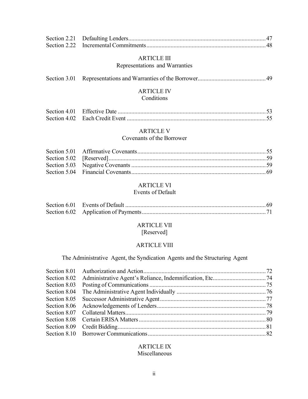 ii Section 2.21 Defaulting Lenders ........................................................................................... 47 Section 2.22 Incremental Commitments ............................................................................... 48 ARTICLE III Representations and Warranties Section 3.01 Representations and Warranties of the Borrower ............................................. 49 ARTICLE IV Conditions Section 4.01 Effective Date .................................................................................................. 53 Section 4.02 Each Credit Event ............................................................................................ 55 ARTICLE V Covenants of the Borrower Section 5.01 Affirmative Covenants ..................................................................................... 55 Section 5.02 [Reserved] ........................................................................................................ 59 Section 5.03 Negative Covenants ......................................................................................... 59 Section 5.04 Financial Covenants ......................................................................................... 69 ARTICLE VI Events of Default Section 6.01 Events of Default ............................................................................................. 69 Section 6.02 Application of Payments .................................................................................. 71 ARTICLE VII [Reserved] ARTICLE VIII The Administrative Agent, the Syndication Agents and the Structuring Agent Section 8.01 Authorization and Action ................................................................................. 72 Section 8.02 Administrative Agent’s Reliance, Indemnification, Etc ................................... 74 Section 8.03 Posting of Communications ............................................................................. 75 Section 8.04 The Administrative Agent Individually ........................................................... 76 Section 8.05 Successor Administrative Agent ...................................................................... 77 Section 8.06 Acknowledgements of Lenders ........................................................................ 78 Section 8.07 Collateral Matters ............................................................................................. 79 Section 8.08 Certain ERISA Matters .................................................................................... 80 Section 8.09 Credit Bidding .................................................................................................. 81 Section 8.10 Borrower Communications .............................................................................. 82 ARTICLE IX Miscellaneous