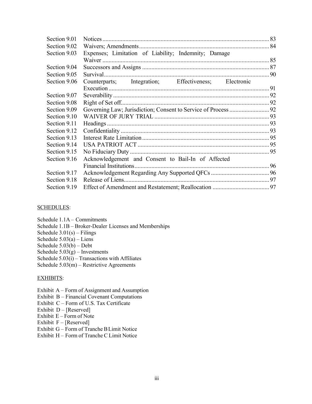 iii Section 9.01 Notices ............................................................................................................. 83 Section 9.02 Waivers; Amendments ..................................................................................... 84 Section 9.03 Expenses; Limitation of Liability; Indemnity; Damage Waiver ............................................................................................................. 85 Section 9.04 Successors and Assigns ................................................................................... 87 Section 9.05 Survival ............................................................................................................ 90 Section 9.06 Counterparts; Integration; Effectiveness; Electronic Execution ......................................................................................................... 91 Section 9.07 Severability ...................................................................................................... 92 Section 9.08 Right of Set off ................................................................................................. 92 Section 9.09 Governing Law; Jurisdiction; Consent to Service of Process .......................... 92 Section 9.10 WAIVER OF JURY TRIAL ........................................................................... 93 Section 9.11 Headings .......................................................................................................... 93 Section 9.12 Confidentiality ................................................................................................. 93 Section 9.13 Interest Rate Limitation ................................................................................... 95 Section 9.14 USA PATRIOT ACT ...................................................................................... 95 Section 9.15 No Fiduciary Duty ........................................................................................... 95 Section 9.16 Acknowledgement and Consent to Bail-In of Affected Financial Institutions ........................................................................................ 96 Section 9.17 Acknowledgement Regarding Any Supported QFCs ...................................... 96 Section 9.18 Release of Liens ............................................................................................... 97 Section 9.19 Effect of Amendment and Restatement; Reallocation ..................................... 97 SCHEDULES: Schedule 1.1A – Commitments Schedule 1.1B – Broker-Dealer Licenses and Memberships Schedule 3.01(s) – Filings Schedule 5.03(a) – Liens Schedule 5.03(b) – Debt Schedule 5.03(g) – Investments Schedule 5.03(i) – Transactions with Affiliates Schedule 5.03(m) – Restrictive Agreements EXHIBITS: Exhibit A – Form of Assignment and Assumption Exhibit B – Financial Covenant Computations Exhibit C – Form of U.S. Tax Certificate Exhibit D – [Reserved] Exhibit E – Form of Note Exhibit F – [Reserved] Exhibit G – Form of Tranche B Limit Notice Exhibit H – Form of Tranche C Limit Notice