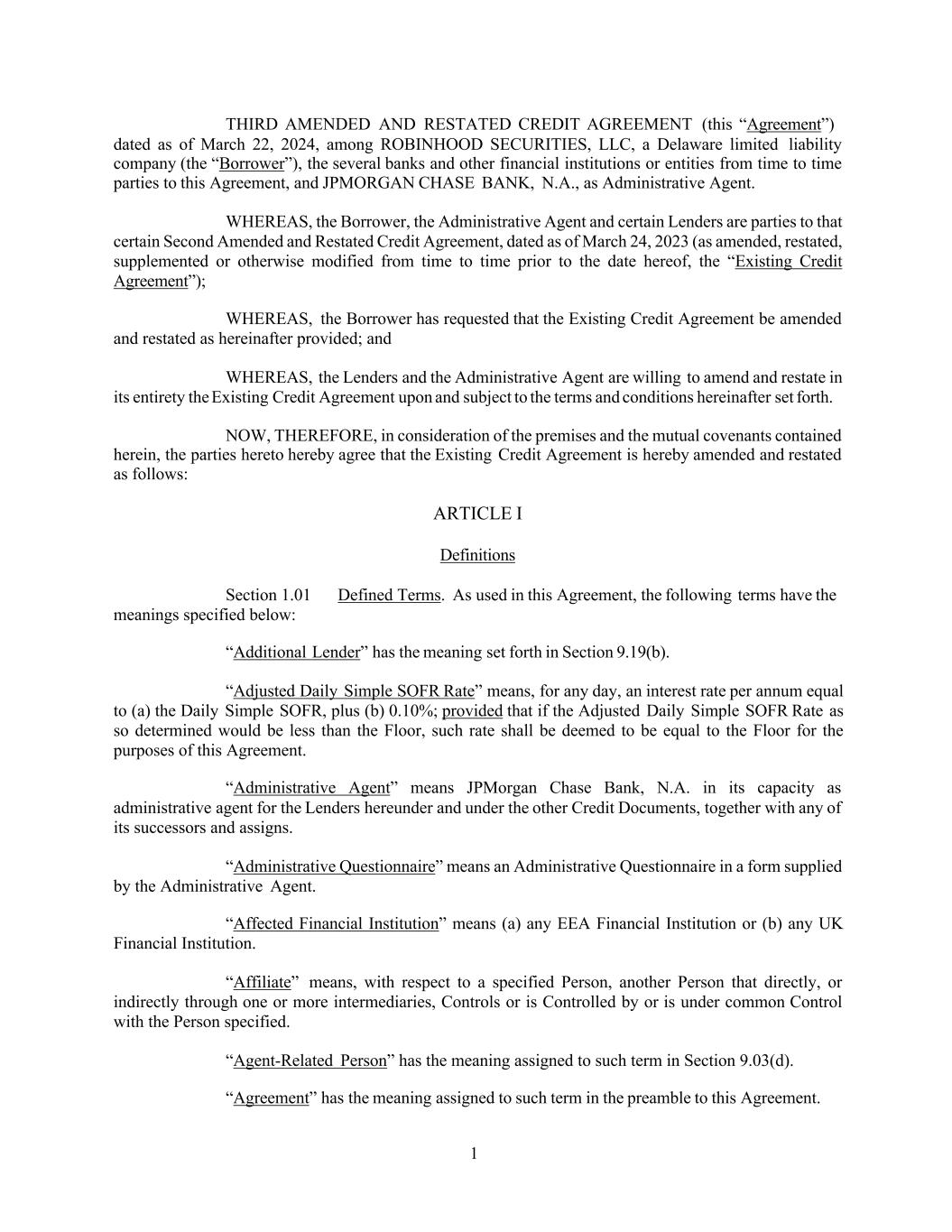 1 THIRD AMENDED AND RESTATED CREDIT AGREEMENT (this “Agreement”) dated as of March 22, 2024, among ROBINHOOD SECURITIES, LLC, a Delaware limited liability company (the “Borrower”), the several banks and other financial institutions or entities from time to time parties to this Agreement, and JPMORGAN CHASE BANK, N.A., as Administrative Agent. WHEREAS, the Borrower, the Administrative Agent and certain Lenders are parties to that certain Second Amended and Restated Credit Agreement, dated as of March 24, 2023 (as amended, restated, supplemented or otherwise modified from time to time prior to the date hereof, the “Existing Credit Agreement”); WHEREAS, the Borrower has requested that the Existing Credit Agreement be amended and restated as hereinafter provided; and WHEREAS, the Lenders and the Administrative Agent are willing to amend and restate in its entirety the Existing Credit Agreement upon and subject to the terms and conditions hereinafter set forth. NOW, THEREFORE, in consideration of the premises and the mutual covenants contained herein, the parties hereto hereby agree that the Existing Credit Agreement is hereby amended and restated as follows: ARTICLE I Definitions Section 1.01 Defined Terms. As used in this Agreement, the following terms have the meanings specified below: “Additional Lender” has the meaning set forth in Section 9.19(b). “Adjusted Daily Simple SOFR Rate” means, for any day, an interest rate per annum equal to (a) the Daily Simple SOFR, plus (b) 0.10%; provided that if the Adjusted Daily Simple SOFR Rate as so determined would be less than the Floor, such rate shall be deemed to be equal to the Floor for the purposes of this Agreement. “Administrative Agent” means JPMorgan Chase Bank, N.A. in its capacity as administrative agent for the Lenders hereunder and under the other Credit Documents, together with any of its successors and assigns. “Administrative Questionnaire” means an Administrative Questionnaire in a form supplied by the Administrative Agent. “Affected Financial Institution” means (a) any EEA Financial Institution or (b) any UK Financial Institution. “Affiliate” means, with respect to a specified Person, another Person that directly, or indirectly through one or more intermediaries, Controls or is Controlled by or is under common Control with the Person specified. “Agent-Related Person” has the meaning assigned to such term in Section 9.03(d). “Agreement” has the meaning assigned to such term in the preamble to this Agreement.