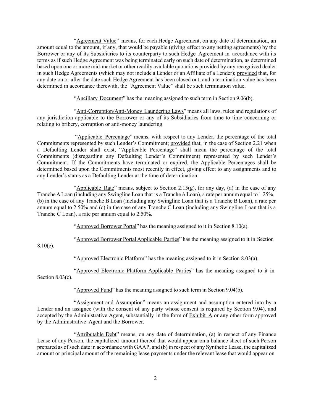 2 “Agreement Value” means, for each Hedge Agreement, on any date of determination, an amount equal to the amount, if any, that would be payable (giving effect to any netting agreements) by the Borrower or any of its Subsidiaries to its counterparty to such Hedge Agreement in accordance with its terms as if such Hedge Agreement was being terminated early on such date of determination, as determined based upon one or more mid-market or other readily available quotations provided by any recognized dealer in such Hedge Agreements (which may not include a Lender or an Affiliate of a Lender); provided that, for any date on or after the date such Hedge Agreement has been closed out, and a termination value has been determined in accordance therewith, the “Agreement Value” shall be such termination value. “Ancillary Document” has the meaning assigned to such term in Section 9.06(b). “Anti-Corruption/Anti-Money Laundering Laws” means all laws, rules and regulations of any jurisdiction applicable to the Borrower or any of its Subsidiaries from time to time concerning or relating to bribery, corruption or anti-money laundering. “Applicable Percentage” means, with respect to any Lender, the percentage of the total Commitments represented by such Lender’s Commitment; provided that, in the case of Section 2.21 when a Defaulting Lender shall exist, “Applicable Percentage” shall mean the percentage of the total Commitments (disregarding any Defaulting Lender’s Commitment) represented by such Lender’s Commitment. If the Commitments have terminated or expired, the Applicable Percentages shall be determined based upon the Commitments most recently in effect, giving effect to any assignments and to any Lender’s status as a Defaulting Lender at the time of determination. “Applicable Rate” means, subject to Section 2.15(g), for any day, (a) in the case of any Tranche A Loan (including any Swingline Loan that is a Tranche A Loan), a rate per annum equal to 1.25%, (b) in the case of any Tranche B Loan (including any Swingline Loan that is a Tranche B Loan), a rate per annum equal to 2.50% and (c) in the case of any Tranche C Loan (including any Swingline Loan that is a Tranche C Loan), a rate per annum equal to 2.50%. “Approved Borrower Portal” has the meaning assigned to it in Section 8.10(a). “Approved Borrower Portal Applicable Parties” has the meaning assigned to it in Section 8.10(c). “Approved Electronic Platform” has the meaning assigned to it in Section 8.03(a). “Approved Electronic Platform Applicable Parties” has the meaning assigned to it in Section 8.03(c). “Approved Fund” has the meaning assigned to such term in Section 9.04(b). “Assignment and Assumption” means an assignment and assumption entered into by a Lender and an assignee (with the consent of any party whose consent is required by Section 9.04), and accepted by the Administrative Agent, substantially in the form of Exhibit A or any other form approved by the Administrative Agent and the Borrower. “Attributable Debt” means, on any date of determination, (a) in respect of any Finance Lease of any Person, the capitalized amount thereof that would appear on a balance sheet of such Person prepared as of such date in accordance with GAAP, and (b) in respect of any Synthetic Lease, the capitalized amount or principal amount of the remaining lease payments under the relevant lease that would appear on