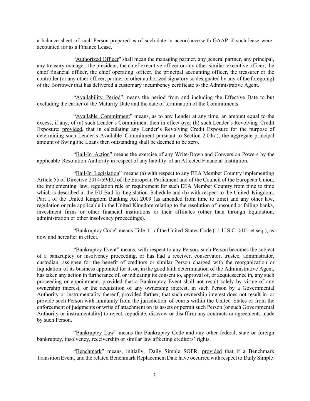 3 a balance sheet of such Person prepared as of such date in accordance with GAAP if such lease were accounted for as a Finance Lease. “Authorized Officer” shall mean the managing partner, any general partner, any principal, any treasury manager, the president, the chief executive officer or any other similar executive officer, the chief financial officer, the chief operating officer, the principal accounting officer, the treasurer or the controller (or any other officer, partner or other authorized signatory so designated by any of the foregoing) of the Borrower that has delivered a customary incumbency certificate to the Administrative Agent. “Availability Period” means the period from and including the Effective Date to but excluding the earlier of the Maturity Date and the date of termination of the Commitments. “Available Commitment” means, as to any Lender at any time, an amount equal to the excess, if any, of (a) such Lender’s Commitment then in effect over (b) such Lender’s Revolving Credit Exposure; provided, that in calculating any Lender’s Revolving Credit Exposure for the purpose of determining such Lender’s Available Commitment pursuant to Section 2.04(a), the aggregate principal amount of Swingline Loans then outstanding shall be deemed to be zero. “Bail-In Action” means the exercise of any Write-Down and Conversion Powers by the applicable Resolution Authority in respect of any liability of an Affected Financial Institution. “Bail-In Legislation” means (a) with respect to any EEA Member Country implementing Article 55 of Directive 2014/59/EU of the European Parliament and of the Council of the European Union, the implementing law, regulation rule or requirement for such EEA Member Country from time to time which is described in the EU Bail-In Legislation Schedule and (b) with respect to the United Kingdom, Part I of the United Kingdom Banking Act 2009 (as amended from time to time) and any other law, regulation or rule applicable in the United Kingdom relating to the resolution of unsound or failing banks, investment firms or other financial institutions or their affiliates (other than through liquidation, administration or other insolvency proceedings). “Bankruptcy Code” means Title 11 of the United States Code (11 U.S.C. §101 et seq.), as now and hereafter in effect. “Bankruptcy Event” means, with respect to any Person, such Person becomes the subject of a bankruptcy or insolvency proceeding, or has had a receiver, conservator, trustee, administrator, custodian, assignee for the benefit of creditors or similar Person charged with the reorganization or liquidation of its business appointed for it, or, in the good faith determination of the Administrative Agent, has taken any action in furtherance of, or indicating its consent to, approval of, or acquiescence in, any such proceeding or appointment, provided that a Bankruptcy Event shall not result solely by virtue of any ownership interest, or the acquisition of any ownership interest, in such Person by a Governmental Authority or instrumentality thereof, provided further, that such ownership interest does not result in or provide such Person with immunity from the jurisdiction of courts within the United States or from the enforcement of judgments or writs of attachment on its assets or permit such Person (or such Governmental Authority or instrumentality) to reject, repudiate, disavow or disaffirm any contracts or agreements made by such Person. “Bankruptcy Law” means the Bankruptcy Code and any other federal, state or foreign bankruptcy, insolvency, receivership or similar law affecting creditors’ rights. “Benchmark” means, initially, Daily Simple SOFR; provided that if a Benchmark Transition Event, and the related Benchmark Replacement Date have occurred with respect to Daily Simple