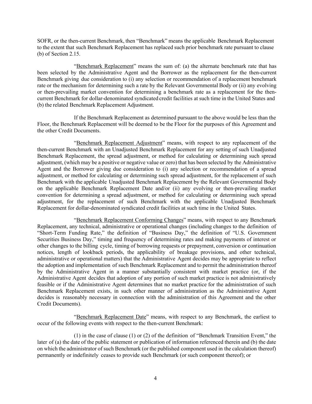 4 SOFR, or the then-current Benchmark, then “Benchmark” means the applicable Benchmark Replacement to the extent that such Benchmark Replacement has replaced such prior benchmark rate pursuant to clause (b) of Section 2.15. “Benchmark Replacement” means the sum of: (a) the alternate benchmark rate that has been selected by the Administrative Agent and the Borrower as the replacement for the then-current Benchmark giving due consideration to (i) any selection or recommendation of a replacement benchmark rate or the mechanism for determining such a rate by the Relevant Governmental Body or (ii) any evolving or then-prevailing market convention for determining a benchmark rate as a replacement for the then- current Benchmark for dollar-denominated syndicated credit facilities at such time in the United States and (b) the related Benchmark Replacement Adjustment. If the Benchmark Replacement as determined pursuant to the above would be less than the Floor, the Benchmark Replacement will be deemed to be the Floor for the purposes of this Agreement and the other Credit Documents. “Benchmark Replacement Adjustment” means, with respect to any replacement of the then-current Benchmark with an Unadjusted Benchmark Replacement for any setting of such Unadjusted Benchmark Replacement, the spread adjustment, or method for calculating or determining such spread adjustment, (which may be a positive or negative value or zero) that has been selected by the Administrative Agent and the Borrower giving due consideration to (i) any selection or recommendation of a spread adjustment, or method for calculating or determining such spread adjustment, for the replacement of such Benchmark with the applicable Unadjusted Benchmark Replacement by the Relevant Governmental Body on the applicable Benchmark Replacement Date and/or (ii) any evolving or then-prevailing market convention for determining a spread adjustment, or method for calculating or determining such spread adjustment, for the replacement of such Benchmark with the applicable Unadjusted Benchmark Replacement for dollar-denominated syndicated credit facilities at such time in the United States. “Benchmark Replacement Conforming Changes” means, with respect to any Benchmark Replacement, any technical, administrative or operational changes (including changes to the definition of “Short-Term Funding Rate,” the definition of “Business Day,” the definition of “U.S. Government Securities Business Day,” timing and frequency of determining rates and making payments of interest or other changes to the billing cycle, timing of borrowing requests or prepayment, conversion or continuation notices, length of lookback periods, the applicability of breakage provisions, and other technical, administrative or operational matters) that the Administrative Agent decides may be appropriate to reflect the adoption and implementation of such Benchmark Replacement and to permit the administration thereof by the Administrative Agent in a manner substantially consistent with market practice (or, if the Administrative Agent decides that adoption of any portion of such market practice is not administratively feasible or if the Administrative Agent determines that no market practice for the administration of such Benchmark Replacement exists, in such other manner of administration as the Administrative Agent decides is reasonably necessary in connection with the administration of this Agreement and the other Credit Documents). “Benchmark Replacement Date” means, with respect to any Benchmark, the earliest to occur of the following events with respect to the then-current Benchmark: (1) in the case of clause (1) or (2) of the definition of “Benchmark Transition Event,” the later of (a) the date of the public statement or publication of information referenced therein and (b) the date on which the administrator of such Benchmark (or the published component used in the calculation thereof) permanently or indefinitely ceases to provide such Benchmark (or such component thereof); or