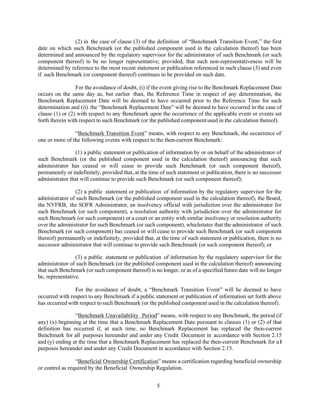 5 (2) in the case of clause (3) of the definition of “Benchmark Transition Event,” the first date on which such Benchmark (or the published component used in the calculation thereof) has been determined and announced by the regulatory supervisor for the administrator of such Benchmark (or such component thereof) to be no longer representative; provided, that such non-representativeness will be determined by reference to the most recent statement or publication referenced in such clause (3) and even if such Benchmark (or component thereof) continues to be provided on such date. For the avoidance of doubt, (i) if the event giving rise to the Benchmark Replacement Date occurs on the same day as, but earlier than, the Reference Time in respect of any determination, the Benchmark Replacement Date will be deemed to have occurred prior to the Reference Time for such determination and (ii) the “Benchmark Replacement Date” will be deemed to have occurred in the case of clause (1) or (2) with respect to any Benchmark upon the occurrence of the applicable event or events set forth therein with respect to such Benchmark (or the published component used in the calculation thereof). “Benchmark Transition Event” means, with respect to any Benchmark, the occurrence of one or more of the following events with respect to the then-current Benchmark: (1) a public statement or publication of information by or on behalf of the administrator of such Benchmark (or the published component used in the calculation thereof) announcing that such administrator has ceased or will cease to provide such Benchmark (or such component thereof), permanently or indefinitely, provided that, at the time of such statement or publication, there is no successor administrator that will continue to provide such Benchmark (or such component thereof); (2) a public statement or publication of information by the regulatory supervisor for the administrator of such Benchmark (or the published component used in the calculation thereof), the Board, the NYFRB, the SOFR Administrator, an insolvency official with jurisdiction over the administrator for such Benchmark (or such component), a resolution authority with jurisdiction over the administrator for such Benchmark (or such component) or a court or an entity with similar insolvency or resolution authority over the administrator for such Benchmark (or such component), whichstates that the administrator of such Benchmark (or such component) has ceased or will cease to provide such Benchmark (or such component thereof) permanently or indefinitely, provided that, at the time of such statement or publication, there is no successor administrator that will continue to provide such Benchmark (or such component thereof); or (3) a public statement or publication of information by the regulatory supervisor for the administrator of such Benchmark (or the published component used in the calculation thereof) announcing that such Benchmark (or such component thereof) is no longer, or as of a specified future date will no longer be, representative. For the avoidance of doubt, a “Benchmark Transition Event” will be deemed to have occurred with respect to any Benchmark if a public statement or publication of information set forth above has occurred with respect to such Benchmark (or the published component used in the calculation thereof). “Benchmark Unavailability Period” means, with respect to any Benchmark, the period (if any) (x) beginning at the time that a Benchmark Replacement Date pursuant to clauses (1) or (2) of that definition has occurred if, at such time, no Benchmark Replacement has replaced the then-current Benchmark for all purposes hereunder and under any Credit Document in accordance with Section 2.15 and (y) ending at the time that a Benchmark Replacement has replaced the then-current Benchmark for a l purposes hereunder and under any Credit Document in accordance with Section 2.15. “Beneficial Ownership Certification” means a certification regarding beneficial ownership or control as required by the Beneficial Ownership Regulation.