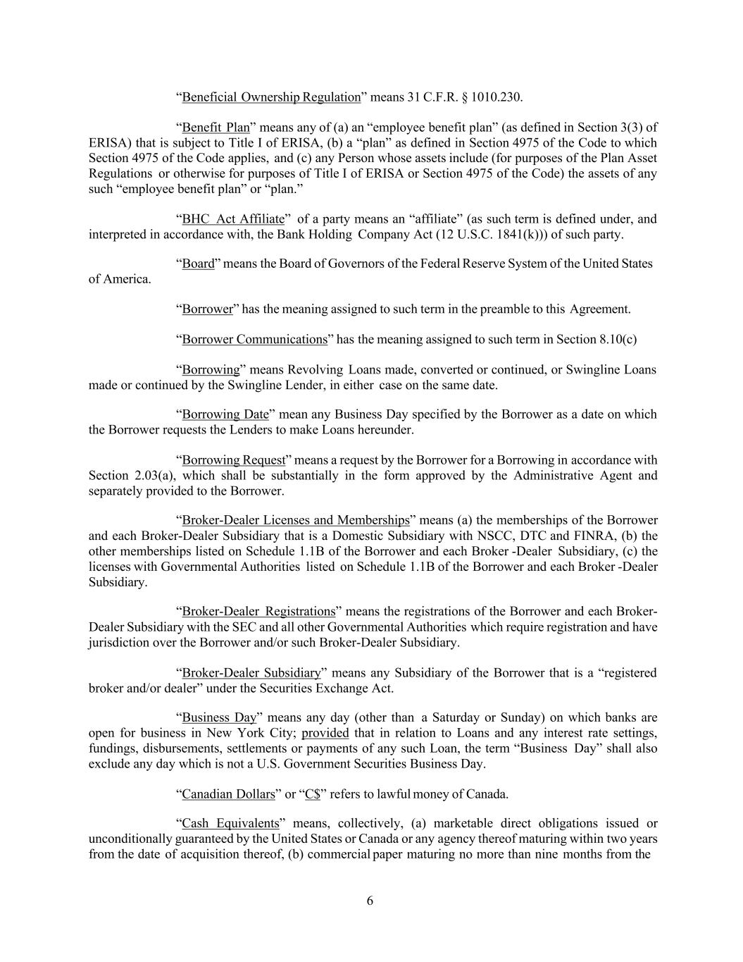 6 “Beneficial Ownership Regulation” means 31 C.F.R. § 1010.230. “Benefit Plan” means any of (a) an “employee benefit plan” (as defined in Section 3(3) of ERISA) that is subject to Title I of ERISA, (b) a “plan” as defined in Section 4975 of the Code to which Section 4975 of the Code applies, and (c) any Person whose assets include (for purposes of the Plan Asset Regulations or otherwise for purposes of Title I of ERISA or Section 4975 of the Code) the assets of any such “employee benefit plan” or “plan.” “BHC Act Affiliate” of a party means an “affiliate” (as such term is defined under, and interpreted in accordance with, the Bank Holding Company Act (12 U.S.C. 1841(k))) of such party. “Board” means the Board of Governors of the Federal Reserve System of the United States of America. “Borrower” has the meaning assigned to such term in the preamble to this Agreement. “Borrower Communications” has the meaning assigned to such term in Section 8.10(c) “Borrowing” means Revolving Loans made, converted or continued, or Swingline Loans made or continued by the Swingline Lender, in either case on the same date. “Borrowing Date” mean any Business Day specified by the Borrower as a date on which the Borrower requests the Lenders to make Loans hereunder. “Borrowing Request” means a request by the Borrower for a Borrowing in accordance with Section 2.03(a), which shall be substantially in the form approved by the Administrative Agent and separately provided to the Borrower. “Broker-Dealer Licenses and Memberships” means (a) the memberships of the Borrower and each Broker-Dealer Subsidiary that is a Domestic Subsidiary with NSCC, DTC and FINRA, (b) the other memberships listed on Schedule 1.1B of the Borrower and each Broker -Dealer Subsidiary, (c) the licenses with Governmental Authorities listed on Schedule 1.1B of the Borrower and each Broker -Dealer Subsidiary. “Broker-Dealer Registrations” means the registrations of the Borrower and each Broker- Dealer Subsidiary with the SEC and all other Governmental Authorities which require registration and have jurisdiction over the Borrower and/or such Broker-Dealer Subsidiary. “Broker-Dealer Subsidiary” means any Subsidiary of the Borrower that is a “registered broker and/or dealer” under the Securities Exchange Act. “Business Day” means any day (other than a Saturday or Sunday) on which banks are open for business in New York City; provided that in relation to Loans and any interest rate settings, fundings, disbursements, settlements or payments of any such Loan, the term “Business Day” shall also exclude any day which is not a U.S. Government Securities Business Day. “Canadian Dollars” or “C$” refers to lawful money of Canada. “Cash Equivalents” means, collectively, (a) marketable direct obligations issued or unconditionally guaranteed by the United States or Canada or any agency thereof maturing within two years from the date of acquisition thereof, (b) commercial paper maturing no more than nine months from the
