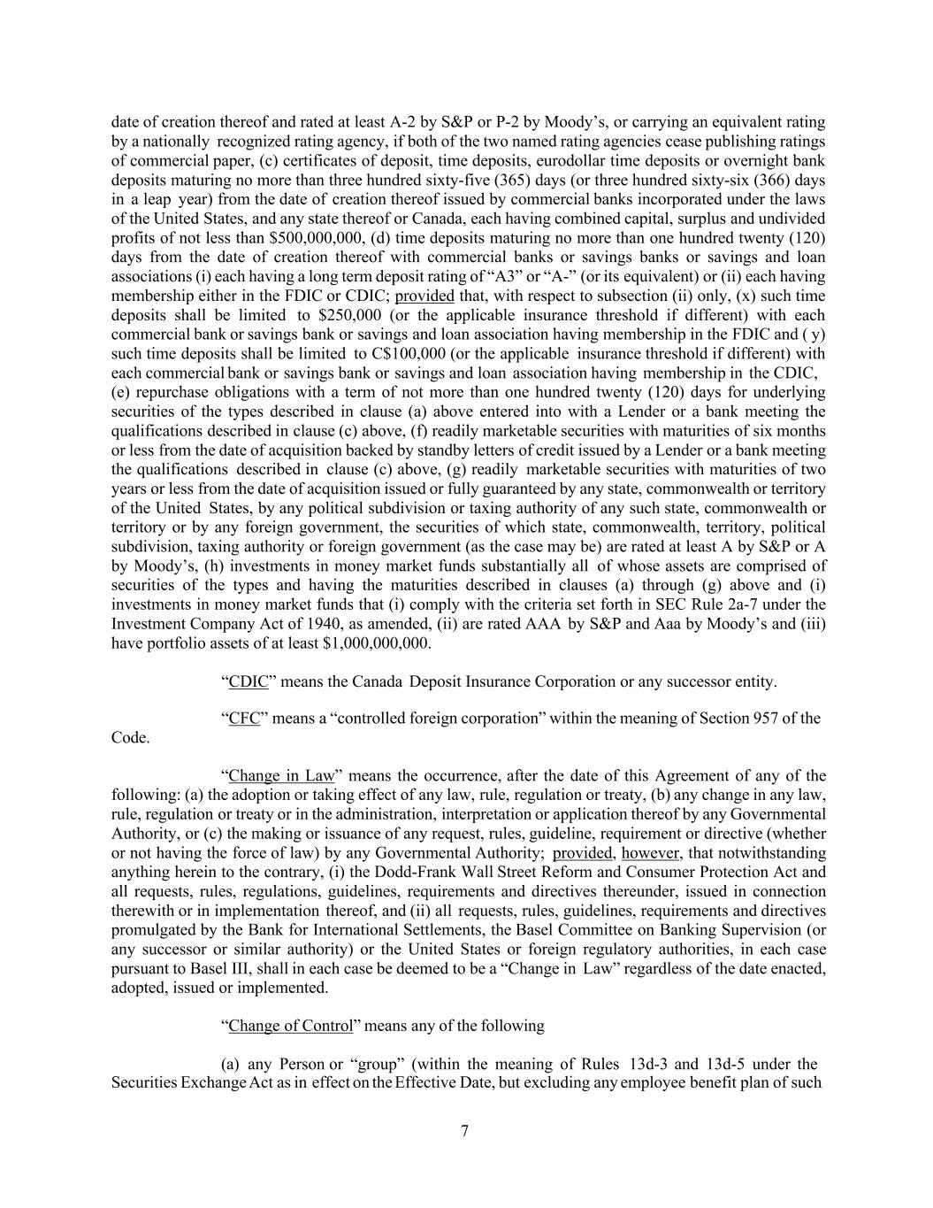 7 date of creation thereof and rated at least A-2 by S&P or P-2 by Moody’s, or carrying an equivalent rating by a nationally recognized rating agency, if both of the two named rating agencies cease publishing ratings of commercial paper, (c) certificates of deposit, time deposits, eurodollar time deposits or overnight bank deposits maturing no more than three hundred sixty-five (365) days (or three hundred sixty-six (366) days in a leap year) from the date of creation thereof issued by commercial banks incorporated under the laws of the United States, and any state thereof or Canada, each having combined capital, surplus and undivided profits of not less than $500,000,000, (d) time deposits maturing no more than one hundred twenty (120) days from the date of creation thereof with commercial banks or savings banks or savings and loan associations (i) each having a long term deposit rating of “A3” or “A-” (or its equivalent) or (ii) each having membership either in the FDIC or CDIC; provided that, with respect to subsection (ii) only, (x) such time deposits shall be limited to $250,000 (or the applicable insurance threshold if different) with each commercial bank or savings bank or savings and loan association having membership in the FDIC and ( y) such time deposits shall be limited to C$100,000 (or the applicable insurance threshold if different) with each commercial bank or savings bank or savings and loan association having membership in the CDIC, (e) repurchase obligations with a term of not more than one hundred twenty (120) days for underlying securities of the types described in clause (a) above entered into with a Lender or a bank meeting the qualifications described in clause (c) above, (f) readily marketable securities with maturities of six months or less from the date of acquisition backed by standby letters of credit issued by a Lender or a bank meeting the qualifications described in clause (c) above, (g) readily marketable securities with maturities of two years or less from the date of acquisition issued or fully guaranteed by any state, commonwealth or territory of the United States, by any political subdivision or taxing authority of any such state, commonwealth or territory or by any foreign government, the securities of which state, commonwealth, territory, political subdivision, taxing authority or foreign government (as the case may be) are rated at least A by S&P or A by Moody’s, (h) investments in money market funds substantially all of whose assets are comprised of securities of the types and having the maturities described in clauses (a) through (g) above and (i) investments in money market funds that (i) comply with the criteria set forth in SEC Rule 2a-7 under the Investment Company Act of 1940, as amended, (ii) are rated AAA by S&P and Aaa by Moody’s and (iii) have portfolio assets of at least $1,000,000,000. Code. “CDIC” means the Canada Deposit Insurance Corporation or any successor entity. “CFC” means a “controlled foreign corporation” within the meaning of Section 957 of the “Change in Law” means the occurrence, after the date of this Agreement of any of the following: (a) the adoption or taking effect of any law, rule, regulation or treaty, (b) any change in any law, rule, regulation or treaty or in the administration, interpretation or application thereof by any Governmental Authority, or (c) the making or issuance of any request, rules, guideline, requirement or directive (whether or not having the force of law) by any Governmental Authority; provided, however, that notwithstanding anything herein to the contrary, (i) the Dodd-Frank Wall Street Reform and Consumer Protection Act and all requests, rules, regulations, guidelines, requirements and directives thereunder, issued in connection therewith or in implementation thereof, and (ii) all requests, rules, guidelines, requirements and directives promulgated by the Bank for International Settlements, the Basel Committee on Banking Supervision (or any successor or similar authority) or the United States or foreign regulatory authorities, in each case pursuant to Basel III, shall in each case be deemed to be a “Change in Law” regardless of the date enacted, adopted, issued or implemented. “Change of Control” means any of the following (a) any Person or “group” (within the meaning of Rules 13d-3 and 13d-5 under the Securities Exchange Act as in effect on the Effective Date, but excluding any employee benefit plan of such