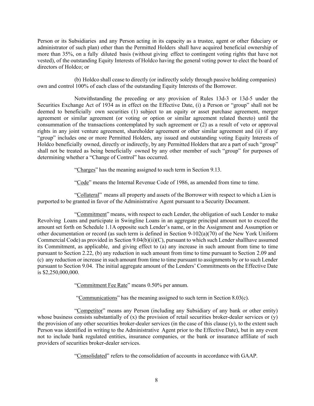 8 Person or its Subsidiaries and any Person acting in its capacity as a trustee, agent or other fiduciary or administrator of such plan) other than the Permitted Holders shall have acquired beneficial ownership of more than 35%, on a fully diluted basis (without giving effect to contingent voting rights that have not vested), of the outstanding Equity Interests of Holdco having the general voting power to elect the board of directors of Holdco; or (b) Holdco shall cease to directly (or indirectly solely through passive holding companies) own and control 100% of each class of the outstanding Equity Interests of the Borrower. Notwithstanding the preceding or any provision of Rules 13d-3 or 13d-5 under the Securities Exchange Act of 1934 as in effect on the Effective Date, (i) a Person or “group” shall not be deemed to beneficially own securities (1) subject to an equity or asset purchase agreement, merger agreement or similar agreement (or voting or option or similar agreement related thereto) until the consummation of the transactions contemplated by such agreement or (2) as a result of veto or approval rights in any joint venture agreement, shareholder agreement or other similar agreement and (ii) if any “group” includes one or more Permitted Holders, any issued and outstanding voting Equity Interests of Holdco beneficially owned, directly or indirectly, by any Permitted Holders that are a part of such “group” shall not be treated as being beneficially owned by any other member of such “group” for purposes of determining whether a “Change of Control” has occurred. “Charges” has the meaning assigned to such term in Section 9.13. “Code” means the Internal Revenue Code of 1986, as amended from time to time. “Collateral” means all property and assets of the Borrower with respect to which a Lien is purported to be granted in favor of the Administrative Agent pursuant to a Security Document. “Commitment” means, with respect to each Lender, the obligation of such Lender to make Revolving Loans and participate in Swingline Loans in an aggregate principal amount not to exceed the amount set forth on Schedule 1.1A opposite such Lender’s name, or in the Assignment and Assumption or other documentation or record (as such term is defined in Section 9-102(a)(70) of the New York Uniform Commercial Code) as provided in Section 9.04(b)(ii)(C), pursuant to which such Lender shallhave assumed its Commitment, as applicable, and giving effect to (a) any increase in such amount from time to time pursuant to Section 2.22, (b) any reduction in such amount from time to time pursuant to Section 2.09 and (c) any reduction or increase in such amount from time to time pursuant to assignments by or to such Lender pursuant to Section 9.04. The initial aggregate amount of the Lenders’ Commitments on the Effective Date is $2,250,000,000. “Commitment Fee Rate” means 0.50% per annum. “Communications” has the meaning assigned to such term in Section 8.03(c). “Competitor” means any Person (including any Subsidiary of any bank or other entity) whose business consists substantially of (x) the provision of retail securities broker-dealer services or (y) the provision of any other securities broker-dealer services (in the case of this clause (y), to the extent such Person was identified in writing to the Administrative Agent prior to the Effective Date), but in any event not to include bank regulated entities, insurance companies, or the bank or insurance affiliate of such providers of securities broker-dealer services. “Consolidated” refers to the consolidation of accounts in accordance with GAAP.