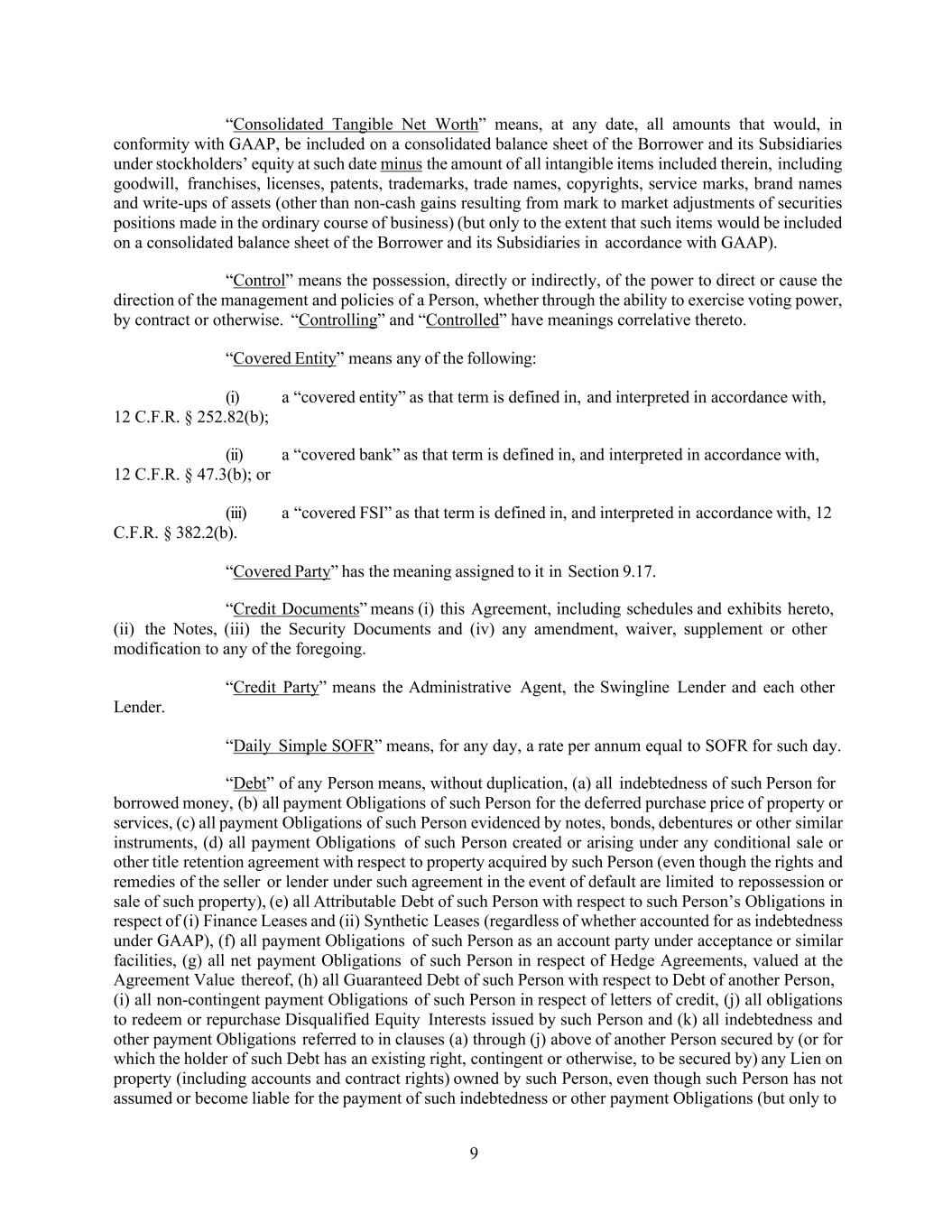 9 “Consolidated Tangible Net Worth” means, at any date, all amounts that would, in conformity with GAAP, be included on a consolidated balance sheet of the Borrower and its Subsidiaries under stockholders’ equity at such date minus the amount of all intangible items included therein, including goodwill, franchises, licenses, patents, trademarks, trade names, copyrights, service marks, brand names and write-ups of assets (other than non-cash gains resulting from mark to market adjustments of securities positions made in the ordinary course of business) (but only to the extent that such items would be included on a consolidated balance sheet of the Borrower and its Subsidiaries in accordance with GAAP). “Control” means the possession, directly or indirectly, of the power to direct or cause the direction of the management and policies of a Person, whether through the ability to exercise voting power, by contract or otherwise. “Controlling” and “Controlled” have meanings correlative thereto. “Covered Entity” means any of the following: (i) a “covered entity” as that term is defined in, and interpreted in accordance with, 12 C.F.R. § 252.82(b); (ii) a “covered bank” as that term is defined in, and interpreted in accordance with, 12 C.F.R. § 47.3(b); or (iii) a “covered FSI” as that term is defined in, and interpreted in accordance with, 12 C.F.R. § 382.2(b). “Covered Party” has the meaning assigned to it in Section 9.17. “Credit Documents” means (i) this Agreement, including schedules and exhibits hereto, (ii) the Notes, (iii) the Security Documents and (iv) any amendment, waiver, supplement or other modification to any of the foregoing. “Credit Party” means the Administrative Agent, the Swingline Lender and each other Lender. “Daily Simple SOFR” means, for any day, a rate per annum equal to SOFR for such day. “Debt” of any Person means, without duplication, (a) all indebtedness of such Person for borrowed money, (b) all payment Obligations of such Person for the deferred purchase price of property or services, (c) all payment Obligations of such Person evidenced by notes, bonds, debentures or other similar instruments, (d) all payment Obligations of such Person created or arising under any conditional sale or other title retention agreement with respect to property acquired by such Person (even though the rights and remedies of the seller or lender under such agreement in the event of default are limited to repossession or sale of such property), (e) all Attributable Debt of such Person with respect to such Person’s Obligations in respect of (i) Finance Leases and (ii) Synthetic Leases (regardless of whether accounted for as indebtedness under GAAP), (f) all payment Obligations of such Person as an account party under acceptance or similar facilities, (g) all net payment Obligations of such Person in respect of Hedge Agreements, valued at the Agreement Value thereof, (h) all Guaranteed Debt of such Person with respect to Debt of another Person, (i) all non-contingent payment Obligations of such Person in respect of letters of credit, (j) all obligations to redeem or repurchase Disqualified Equity Interests issued by such Person and (k) all indebtedness and other payment Obligations referred to in clauses (a) through (j) above of another Person secured by (or for which the holder of such Debt has an existing right, contingent or otherwise, to be secured by) any Lien on property (including accounts and contract rights) owned by such Person, even though such Person has not assumed or become liable for the payment of such indebtedness or other payment Obligations (but only to