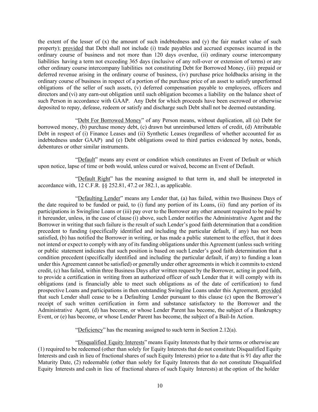 10 the extent of the lesser of (x) the amount of such indebtedness and (y) the fair market value of such property); provided that Debt shall not include (i) trade payables and accrued expenses incurred in the ordinary course of business and not more than 120 days overdue, (ii) ordinary course intercompany liabilities having a term not exceeding 365 days (inclusive of any roll-over or extension of terms) or any other ordinary course intercompany liabilities not constituting Debt for Borrowed Money, (iii) prepaid or deferred revenue arising in the ordinary course of business, (iv) purchase price holdbacks arising in the ordinary course of business in respect of a portion of the purchase price of an asset to satisfy unperformed obligations of the seller of such assets, (v) deferred compensation payable to employees, officers and directors and (vi) any earn-out obligation until such obligation becomes a liability on the balance sheet of such Person in accordance with GAAP. Any Debt for which proceeds have been escrowed or otherwise deposited to repay, defease, redeem or satisfy and discharge such Debt shall not be deemed outstanding. “Debt For Borrowed Money” of any Person means, without duplication, all (a) Debt for borrowed money, (b) purchase money debt, (c) drawn but unreimbursed letters of credit, (d) Attributable Debt in respect of (i) Finance Leases and (ii) Synthetic Leases (regardless of whether accounted for as indebtedness under GAAP) and (e) Debt obligations owed to third parties evidenced by notes, bonds, debentures or other similar instruments. “Default” means any event or condition which constitutes an Event of Default or which upon notice, lapse of time or both would, unless cured or waived, become an Event of Default. “Default Right” has the meaning assigned to that term in, and shall be interpreted in accordance with, 12 C.F.R. §§ 252.81, 47.2 or 382.1, as applicable. “Defaulting Lender” means any Lender that, (a) has failed, within two Business Days of the date required to be funded or paid, to (i) fund any portion of its Loans, (ii) fund any portion of its participations in Swingline Loans or (iii) pay over to the Borrower any other amount required to be paid by it hereunder, unless, in the case of clause (i) above, such Lender notifies the Administrative Agent and the Borrower in writing that such failure is the result of such Lender’s good faith determination that a condition precedent to funding (specifically identified and including the particular default, if any) has not been satisfied, (b) has notified the Borrower in writing, or has made a public statement to the effect, that it does not intend or expect to comply with any of its funding obligations under this Agreement (unless such writing or public statement indicates that such position is based on such Lender’s good faith determination that a condition precedent (specifically identified and including the particular default, if any) to funding a loan under this Agreement cannot be satisfied) or generally under other agreements in which it commits to extend credit, (c) has failed, within three Business Days after written request by the Borrower, acting in good faith, to provide a certification in writing from an authorized officer of such Lender that it will comply with its obligations (and is financially able to meet such obligations as of the date of certification) to fund prospective Loans and participations in then outstanding Swingline Loans under this Agreement, provided that such Lender shall cease to be a Defaulting Lender pursuant to this clause (c) upon the Borrower’s receipt of such written certification in form and substance satisfactory to the Borrower and the Administrative Agent, (d) has become, or whose Lender Parent has become, the subject of a Bankruptcy Event, or (e) has become, or whose Lender Parent has become, the subject of a Bail-In Action. “Deficiency” has the meaning assigned to such term in Section 2.12(a). “Disqualified Equity Interests” means Equity Interests that by their terms or otherwise are (1) required to be redeemed (other than solely for Equity Interests that do not constitute Disqualified Equity Interests and cash in lieu of fractional shares of such Equity Interests) prior to a date that is 91 day after the Maturity Date, (2) redeemable (other than solely for Equity Interests that do not constitute Disqualified Equity Interests and cash in lieu of fractional shares of such Equity Interests) at the option of the holder