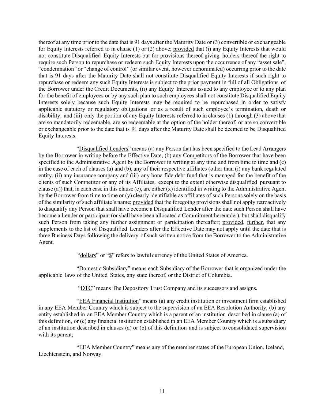 11 thereof at any time prior to the date that is 91 days after the Maturity Date or (3) convertible or exchangeable for Equity Interests referred to in clause (1) or (2) above; provided that (i) any Equity Interests that would not constitute Disqualified Equity Interests but for provisions thereof giving holders thereof the right to require such Person to repurchase or redeem such Equity Interests upon the occurrence of any “asset sale”, “condemnation” or “change of control” (or similar event, however denominated) occurring prior to the date that is 91 days after the Maturity Date shall not constitute Disqualified Equity Interests if such right to repurchase or redeem any such Equity Interests is subject to the prior payment in full of all Obligations of the Borrower under the Credit Documents, (ii) any Equity Interests issued to any employee or to any plan for the benefit of employees or by any such plan to such employees shall not constitute Disqualified Equity Interests solely because such Equity Interests may be required to be repurchased in order to satisfy applicable statutory or regulatory obligations or as a result of such employee’s termination, death or disability, and (iii) only the portion of any Equity Interests referred to in clauses (1) through (3) above that are so mandatorily redeemable, are so redeemable at the option of the holder thereof, or are so convertible or exchangeable prior to the date that is 91 days after the Maturity Date shall be deemed to be Disqualified Equity Interests. “Disqualified Lenders” means (a) any Person that has been specified to the Lead Arrangers by the Borrower in writing before the Effective Date, (b) any Competitors of the Borrower that have been specified to the Administrative Agent by the Borrower in writing at any time and from time to time and (c) in the case of each of clauses (a) and (b), any of their respective affiliates (other than (i) any bank regulated entity, (ii) any insurance company and (iii) any bona fide debt fund that is managed for the benefit of the clients of such Competitor or any of its Affiliates, except to the extent otherwise disqualified pursuant to clause (a)) that, in each case in this clause (c), are either (x) identified in writing to the Administrative Agent by the Borrower from time to time or (y) clearly identifiable as affiliates of such Persons solely on the basis of the similarity of such affiliate’s name; provided that the foregoing provisions shall not apply retroactively to disqualify any Person that shall have become a Disqualified Lender after the date such Person shall have become a Lender or participant (or shall have been allocated a Commitment hereunder), but shall disqualify such Person from taking any further assignment or participation thereafter; provided, further, that any supplements to the list of Disqualified Lenders after the Effective Date may not apply until the date that is three Business Days following the delivery of such written notice from the Borrower to the Administrative Agent. “dollars” or “$” refers to lawful currency of the United States of America. “Domestic Subsidiary” means each Subsidiary of the Borrower that is organized under the applicable laws of the United States, any state thereof, or the District of Columbia. “DTC” means The Depository Trust Company and its successors and assigns. “EEA Financial Institution” means (a) any credit institution or investment firm established in any EEA Member Country which is subject to the supervision of an EEA Resolution Authority, (b) any entity established in an EEA Member Country which is a parent of an institution described in clause (a) of this definition, or (c) any financial institution established in an EEA Member Country which is a subsidiary of an institution described in clauses (a) or (b) of this definition and is subject to consolidated supervision with its parent; “EEA Member Country” means any of the member states of the European Union, Iceland, Liechtenstein, and Norway.