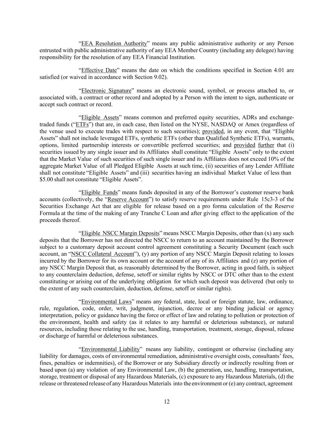 12 “EEA Resolution Authority” means any public administrative authority or any Person entrusted with public administrative authority of any EEA Member Country (including any delegee) having responsibility for the resolution of any EEA Financial Institution. “Effective Date” means the date on which the conditions specified in Section 4.01 are satisfied (or waived in accordance with Section 9.02). “Electronic Signature” means an electronic sound, symbol, or process attached to, or associated with, a contract or other record and adopted by a Person with the intent to sign, authenticate or accept such contract or record. “Eligible Assets” means common and preferred equity securities, ADRs and exchange- traded funds (“ETFs”) that are, in each case, then listed on the NYSE, NASDAQ or Amex (regardless of the venue used to execute trades with respect to such securities); provided, in any event, that “Eligible Assets” shall not include leveraged ETFs, synthetic ETFs (other than Qualified Synthetic ETFs), warrants, options, limited partnership interests or convertible preferred securities; and provided further that (i) securities issued by any single issuer and its Affiliates shall constitute “Eligible Assets” only to the extent that the Market Value of such securities of such single issuer and its Affiliates does not exceed 10% of the aggregate Market Value of all Pledged Eligible Assets at such time, (ii) securities of any Lender Affiliate shall not constitute “Eligible Assets” and (iii) securities having an individual Market Value of less than $5.00 shall not constitute “Eligible Assets”. “Eligible Funds” means funds deposited in any of the Borrower’s customer reserve bank accounts (collectively, the “Reserve Account”) to satisfy reserve requirements under Rule 15c3-3 of the Securities Exchange Act that are eligible for release based on a pro forma calculation of the Reserve Formula at the time of the making of any Tranche C Loan and after giving effect to the application of the proceeds thereof. “Eligible NSCC Margin Deposits” means NSCC Margin Deposits, other than (x) any such deposits that the Borrower has not directed the NSCC to return to an account maintained by the Borrower subject to a customary deposit account control agreement constituting a Security Document (each such account, an “NSCC Collateral Account”), (y) any portion of any NSCC Margin Deposit relating to losses incurred by the Borrower for its own account or the account of any of its Affiliates and (z) any portion of any NSCC Margin Deposit that, as reasonably determined by the Borrower, acting in good faith, is subject to any counterclaim deduction, defense, setoff or similar rights by NSCC or DTC other than to the extent constituting or arising out of the underlying obligation for which such deposit was delivered (but only to the extent of any such counterclaim, deduction, defense, setoff or similar rights). “Environmental Laws” means any federal, state, local or foreign statute, law, ordinance, rule, regulation, code, order, writ, judgment, injunction, decree or any binding judicial or agency interpretation, policy or guidance having the force or effect of law and relating to pollution or protection of the environment, health and safety (as it relates to any harmful or deleterious substance), or natural resources, including those relating to the use, handling, transportation, treatment, storage, disposal, release or discharge of harmful or deleterious substances. “Environmental Liability” means any liability, contingent or otherwise (including any liability for damages, costs of environmental remediation, administrative oversight costs, consultants’ fees, fines, penalties or indemnities), of the Borrower or any Subsidiary directly or indirectly resulting from or based upon (a) any violation of any Environmental Law, (b) the generation, use, handling, transportation, storage, treatment or disposal of any Hazardous Materials, (c) exposure to any Hazardous Materials, (d) the release or threatened release of any Hazardous Materials into the environment or (e) any contract, agreement