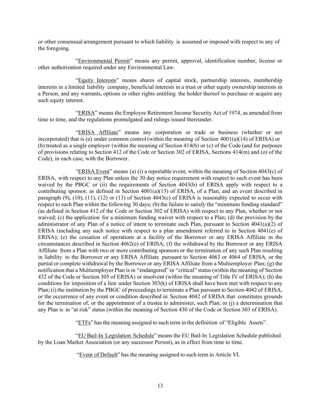 13 or other consensual arrangement pursuant to which liability is assumed or imposed with respect to any of the foregoing. “Environmental Permit” means any permit, approval, identification number, license or other authorization required under any Environmental Law. “Equity Interests” means shares of capital stock, partnership interests, membership interests in a limited liability company, beneficial interests in a trust or other equity ownership interests in a Person, and any warrants, options or other rights entitling the holder thereof to purchase or acquire any such equity interest. “ERISA” means the Employee Retirement Income Security Act of 1974, as amended from time to time, and the regulations promulgated and rulings issued thereunder. “ERISA Affiliate” means any corporation or trade or business (whether or not incorporated) that is (a) under common control (within the meaning of Section 4001(a)(14) of ERISA) or (b) treated as a single employer (within the meaning of Section 414(b) or (c) of the Code (and for purposes of provisions relating to Section 412 of the Code or Section 302 of ERISA, Sections 414(m) and (o) of the Code), in each case, with the Borrower. “ERISA Event” means (a) (i) a reportable event, within the meaning of Section 4043(c) of ERISA, with respect to any Plan unless the 30 day notice requirement with respect to such event has been waived by the PBGC or (ii) the requirements of Section 4043(b) of ERISA apply with respect to a contributing sponsor, as defined in Section 4001(a)(13) of ERISA, of a Plan, and an event described in paragraph (9), (10), (11), (12) or (13) of Section 4043(c) of ERISA is reasonably expected to occur with respect to such Plan within the following 30 days; (b) the failure to satisfy the “minimum funding standard” (as defined in Section 412 of the Code or Section 302 of ERISA) with respect to any Plan, whether or not waived; (c) the application for a minimum funding waiver with respect to a Plan; (d) the provision by the administrator of any Plan of a notice of intent to terminate such Plan, pursuant to Section 4041(a)(2) of ERISA (including any such notice with respect to a plan amendment referred to in Section 4041(e) of ERISA); (e) the cessation of operations at a facility of the Borrower or any ERISA Affiliate in the circumstances described in Section 4062(e) of ERISA; (f) the withdrawal by the Borrower or any ERISA Affiliate from a Plan with two or more contributing sponsors or the termination of any such Plan resulting in liability to the Borrower or any ERISA Affiliate pursuant to Section 4063 or 4064 of ERISA, or the partial or complete withdrawal by the Borrower or any ERISA Affiliate from a Multiemployer Plan; (g) the notification that a Multiemployer Plan is in “endangered” or “critical” status (within the meaning of Section 432 of the Code or Section 305 of ERISA) or insolvent (within the meaning of Title IV of ERISA); (h) the conditions for imposition of a lien under Section 303(k) of ERISA shall have been met with respect to any Plan; (i) the institution by the PBGC of proceedings to terminate a Plan pursuant to Section 4042 of ERISA, or the occurrence of any event or condition described in Section 4042 of ERISA that constitutes grounds for the termination of, or the appointment of a trustee to administer, such Plan; or (j) a determination that any Plan is in “at risk” status (within the meaning of Section 430 of the Code or Section 303 of ERISA). “ETFs” has the meaning assigned to such term in the definition of “Eligible Assets”. “EU Bail-In Legislation Schedule” means the EU Bail-In Legislation Schedule published by the Loan Market Association (or any successor Person), as in effect from time to time. “Event of Default” has the meaning assigned to such term in Article VI.
