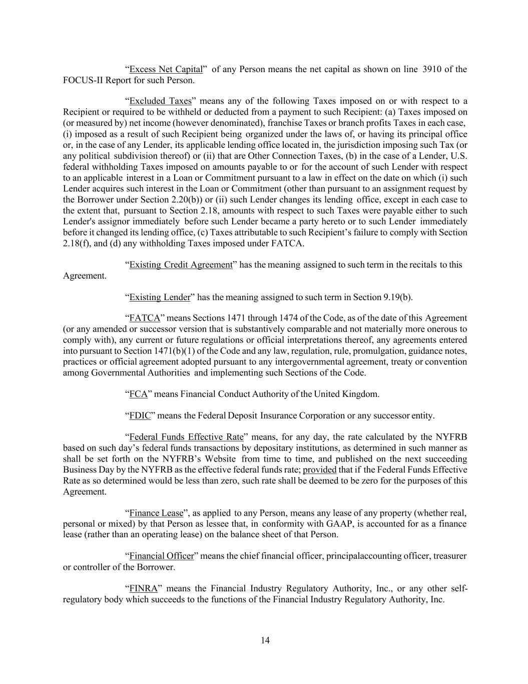 14 “Excess Net Capital” of any Person means the net capital as shown on line 3910 of the FOCUS-II Report for such Person. “Excluded Taxes” means any of the following Taxes imposed on or with respect to a Recipient or required to be withheld or deducted from a payment to such Recipient: (a) Taxes imposed on (or measured by) net income (however denominated), franchise Taxes or branch profits Taxes in each case, (i) imposed as a result of such Recipient being organized under the laws of, or having its principal office or, in the case of any Lender, its applicable lending office located in, the jurisdiction imposing such Tax (or any political subdivision thereof) or (ii) that are Other Connection Taxes, (b) in the case of a Lender, U.S. federal withholding Taxes imposed on amounts payable to or for the account of such Lender with respect to an applicable interest in a Loan or Commitment pursuant to a law in effect on the date on which (i) such Lender acquires such interest in the Loan or Commitment (other than pursuant to an assignment request by the Borrower under Section 2.20(b)) or (ii) such Lender changes its lending office, except in each case to the extent that, pursuant to Section 2.18, amounts with respect to such Taxes were payable either to such Lender's assignor immediately before such Lender became a party hereto or to such Lender immediately before it changed its lending office, (c) Taxes attributable to such Recipient’s failure to comply with Section 2.18(f), and (d) any withholding Taxes imposed under FATCA. “Existing Credit Agreement” has the meaning assigned to such term in the recitals to this Agreement. “Existing Lender” has the meaning assigned to such term in Section 9.19(b). “FATCA” means Sections 1471 through 1474 of the Code, as of the date of this Agreement (or any amended or successor version that is substantively comparable and not materially more onerous to comply with), any current or future regulations or official interpretations thereof, any agreements entered into pursuant to Section 1471(b)(1) of the Code and any law, regulation, rule, promulgation, guidance notes, practices or official agreement adopted pursuant to any intergovernmental agreement, treaty or convention among Governmental Authorities and implementing such Sections of the Code. “FCA” means Financial Conduct Authority of the United Kingdom. “FDIC” means the Federal Deposit Insurance Corporation or any successor entity. “Federal Funds Effective Rate” means, for any day, the rate calculated by the NYFRB based on such day’s federal funds transactions by depositary institutions, as determined in such manner as shall be set forth on the NYFRB’s Website from time to time, and published on the next succeeding Business Day by the NYFRB as the effective federal funds rate; provided that if the Federal Funds Effective Rate as so determined would be less than zero, such rate shall be deemed to be zero for the purposes of this Agreement. “Finance Lease”, as applied to any Person, means any lease of any property (whether real, personal or mixed) by that Person as lessee that, in conformity with GAAP, is accounted for as a finance lease (rather than an operating lease) on the balance sheet of that Person. “Financial Officer” means the chief financial officer, principalaccounting officer, treasurer or controller of the Borrower. “FINRA” means the Financial Industry Regulatory Authority, Inc., or any other self- regulatory body which succeeds to the functions of the Financial Industry Regulatory Authority, Inc.