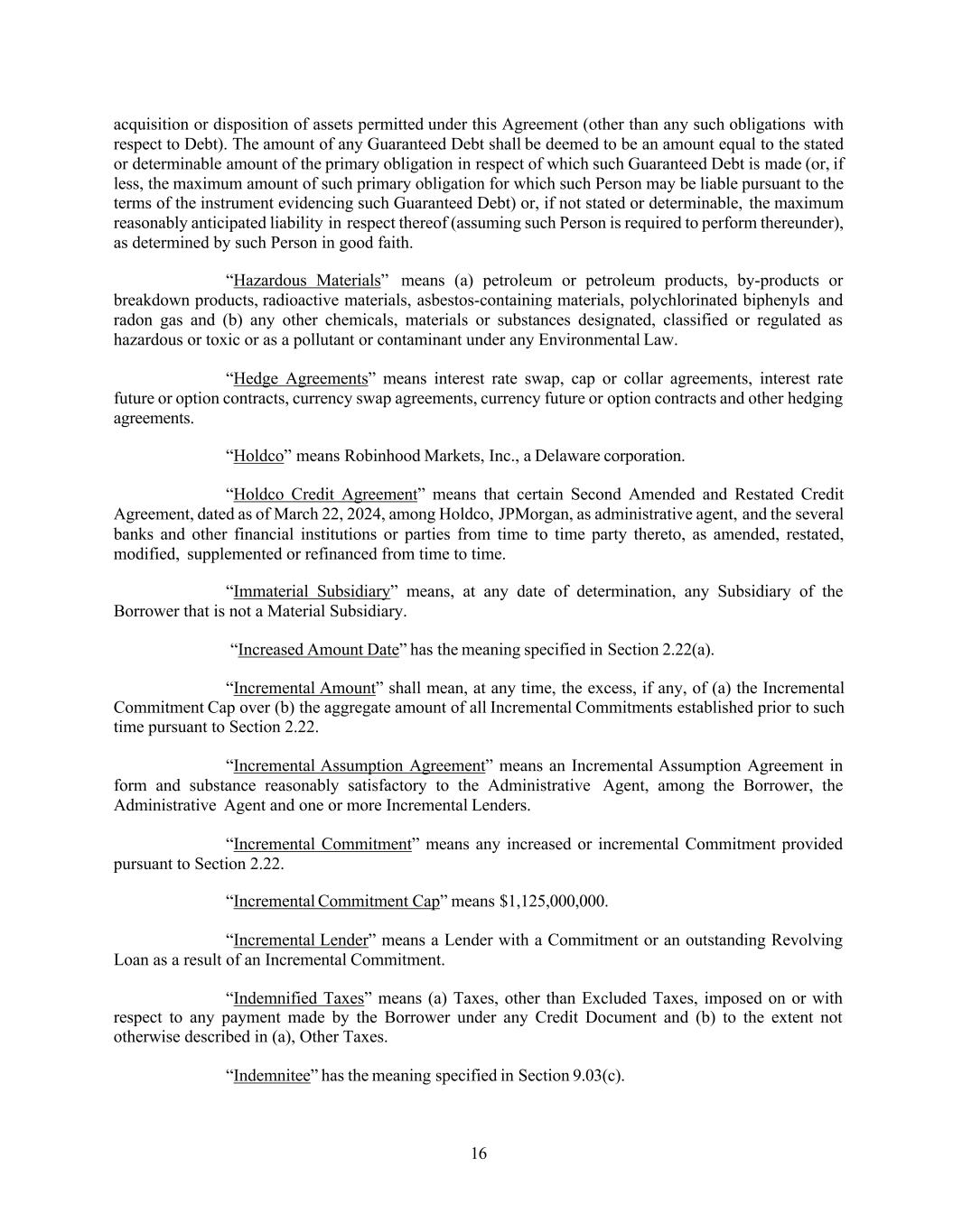 16 acquisition or disposition of assets permitted under this Agreement (other than any such obligations with respect to Debt). The amount of any Guaranteed Debt shall be deemed to be an amount equal to the stated or determinable amount of the primary obligation in respect of which such Guaranteed Debt is made (or, if less, the maximum amount of such primary obligation for which such Person may be liable pursuant to the terms of the instrument evidencing such Guaranteed Debt) or, if not stated or determinable, the maximum reasonably anticipated liability in respect thereof (assuming such Person is required to perform thereunder), as determined by such Person in good faith. “Hazardous Materials” means (a) petroleum or petroleum products, by-products or breakdown products, radioactive materials, asbestos-containing materials, polychlorinated biphenyls and radon gas and (b) any other chemicals, materials or substances designated, classified or regulated as hazardous or toxic or as a pollutant or contaminant under any Environmental Law. “Hedge Agreements” means interest rate swap, cap or collar agreements, interest rate future or option contracts, currency swap agreements, currency future or option contracts and other hedging agreements. “Holdco” means Robinhood Markets, Inc., a Delaware corporation. “Holdco Credit Agreement” means that certain Second Amended and Restated Credit Agreement, dated as of March 22, 2024, among Holdco, JPMorgan, as administrative agent, and the several banks and other financial institutions or parties from time to time party thereto, as amended, restated, modified, supplemented or refinanced from time to time. “Immaterial Subsidiary” means, at any date of determination, any Subsidiary of the Borrower that is not a Material Subsidiary. “Increased Amount Date” has the meaning specified in Section 2.22(a). “Incremental Amount” shall mean, at any time, the excess, if any, of (a) the Incremental Commitment Cap over (b) the aggregate amount of all Incremental Commitments established prior to such time pursuant to Section 2.22. “Incremental Assumption Agreement” means an Incremental Assumption Agreement in form and substance reasonably satisfactory to the Administrative Agent, among the Borrower, the Administrative Agent and one or more Incremental Lenders. “Incremental Commitment” means any increased or incremental Commitment provided pursuant to Section 2.22. “Incremental Commitment Cap” means $1,125,000,000. “Incremental Lender” means a Lender with a Commitment or an outstanding Revolving Loan as a result of an Incremental Commitment. “Indemnified Taxes” means (a) Taxes, other than Excluded Taxes, imposed on or with respect to any payment made by the Borrower under any Credit Document and (b) to the extent not otherwise described in (a), Other Taxes. “Indemnitee” has the meaning specified in Section 9.03(c).