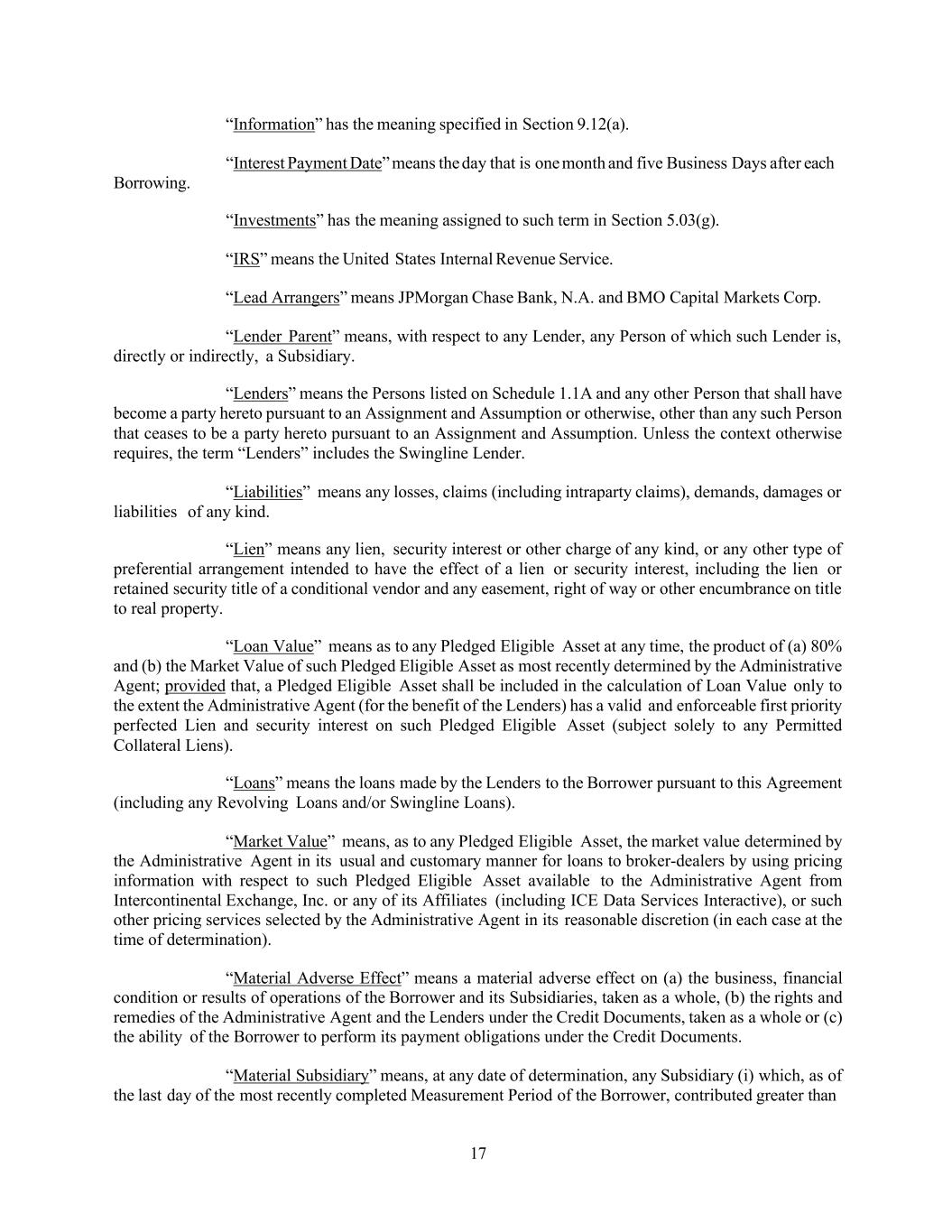 17 “Information” has the meaning specified in Section 9.12(a). Borrowing. “Interest Payment Date” means the day that is one month and five Business Days after each “Investments” has the meaning assigned to such term in Section 5.03(g). “IRS” means the United States Internal Revenue Service. “Lead Arrangers” means JPMorgan Chase Bank, N.A. and BMO Capital Markets Corp. “Lender Parent” means, with respect to any Lender, any Person of which such Lender is, directly or indirectly, a Subsidiary. “Lenders” means the Persons listed on Schedule 1.1A and any other Person that shall have become a party hereto pursuant to an Assignment and Assumption or otherwise, other than any such Person that ceases to be a party hereto pursuant to an Assignment and Assumption. Unless the context otherwise requires, the term “Lenders” includes the Swingline Lender. “Liabilities” means any losses, claims (including intraparty claims), demands, damages or liabilities of any kind. “Lien” means any lien, security interest or other charge of any kind, or any other type of preferential arrangement intended to have the effect of a lien or security interest, including the lien or retained security title of a conditional vendor and any easement, right of way or other encumbrance on title to real property. “Loan Value” means as to any Pledged Eligible Asset at any time, the product of (a) 80% and (b) the Market Value of such Pledged Eligible Asset as most recently determined by the Administrative Agent; provided that, a Pledged Eligible Asset shall be included in the calculation of Loan Value only to the extent the Administrative Agent (for the benefit of the Lenders) has a valid and enforceable first priority perfected Lien and security interest on such Pledged Eligible Asset (subject solely to any Permitted Collateral Liens). “Loans” means the loans made by the Lenders to the Borrower pursuant to this Agreement (including any Revolving Loans and/or Swingline Loans). “Market Value” means, as to any Pledged Eligible Asset, the market value determined by the Administrative Agent in its usual and customary manner for loans to broker-dealers by using pricing information with respect to such Pledged Eligible Asset available to the Administrative Agent from Intercontinental Exchange, Inc. or any of its Affiliates (including ICE Data Services Interactive), or such other pricing services selected by the Administrative Agent in its reasonable discretion (in each case at the time of determination). “Material Adverse Effect” means a material adverse effect on (a) the business, financial condition or results of operations of the Borrower and its Subsidiaries, taken as a whole, (b) the rights and remedies of the Administrative Agent and the Lenders under the Credit Documents, taken as a whole or (c) the ability of the Borrower to perform its payment obligations under the Credit Documents. “Material Subsidiary” means, at any date of determination, any Subsidiary (i) which, as of the last day of the most recently completed Measurement Period of the Borrower, contributed greater than