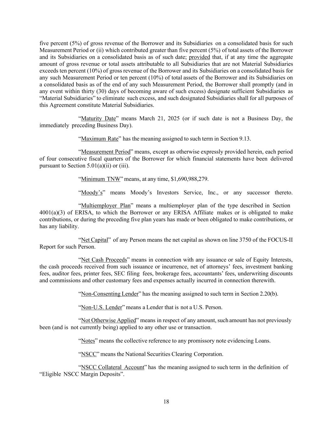 18 five percent (5%) of gross revenue of the Borrower and its Subsidiaries on a consolidated basis for such Measurement Period or (ii) which contributed greater than five percent (5%) of total assets of the Borrower and its Subsidiaries on a consolidated basis as of such date; provided that, if at any time the aggregate amount of gross revenue or total assets attributable to all Subsidiaries that are not Material Subsidiaries exceeds ten percent (10%) of gross revenue of the Borrower and its Subsidiaries on a consolidated basis for any such Measurement Period or ten percent (10%) of total assets of the Borrower and its Subsidiaries on a consolidated basis as of the end of any such Measurement Period, the Borrower shall promptly (and in any event within thirty (30) days of becoming aware of such excess) designate sufficient Subsidiaries as “Material Subsidiaries” to eliminate such excess, and such designated Subsidiaries shall for all purposes of this Agreement constitute Material Subsidiaries. “Maturity Date” means March 21, 2025 (or if such date is not a Business Day, the immediately preceding Business Day). “Maximum Rate” has the meaning assigned to such term in Section 9.13. “Measurement Period” means, except as otherwise expressly provided herein, each period of four consecutive fiscal quarters of the Borrower for which financial statements have been delivered pursuant to Section 5.01(a)(ii) or (iii). “Minimum TNW” means, at any time, $1,690,988,279. “Moody’s” means Moody’s Investors Service, Inc., or any successor thereto. “Multiemployer Plan” means a multiemployer plan of the type described in Section 4001(a)(3) of ERISA, to which the Borrower or any ERISA Affiliate makes or is obligated to make contributions, or during the preceding five plan years has made or been obligated to make contributions, or has any liability. “Net Capital” of any Person means the net capital as shown on line 3750 of the FOCUS-II Report for such Person. “Net Cash Proceeds” means in connection with any issuance or sale of Equity Interests, the cash proceeds received from such issuance or incurrence, net of attorneys’ fees, investment banking fees, auditor fees, printer fees, SEC filing fees, brokerage fees, accountants’ fees, underwriting discounts and commissions and other customary fees and expenses actually incurred in connection therewith. “Non-Consenting Lender” has the meaning assigned to such term in Section 2.20(b). “Non-U.S. Lender” means a Lender that is not a U.S. Person. “Not Otherwise Applied” means in respect of any amount, such amount has not previously been (and is not currently being) applied to any other use or transaction. “Notes” means the collective reference to any promissory note evidencing Loans. “NSCC” means the National Securities Clearing Corporation. “NSCC Collateral Account” has the meaning assigned to such term in the definition of “Eligible NSCC Margin Deposits”.