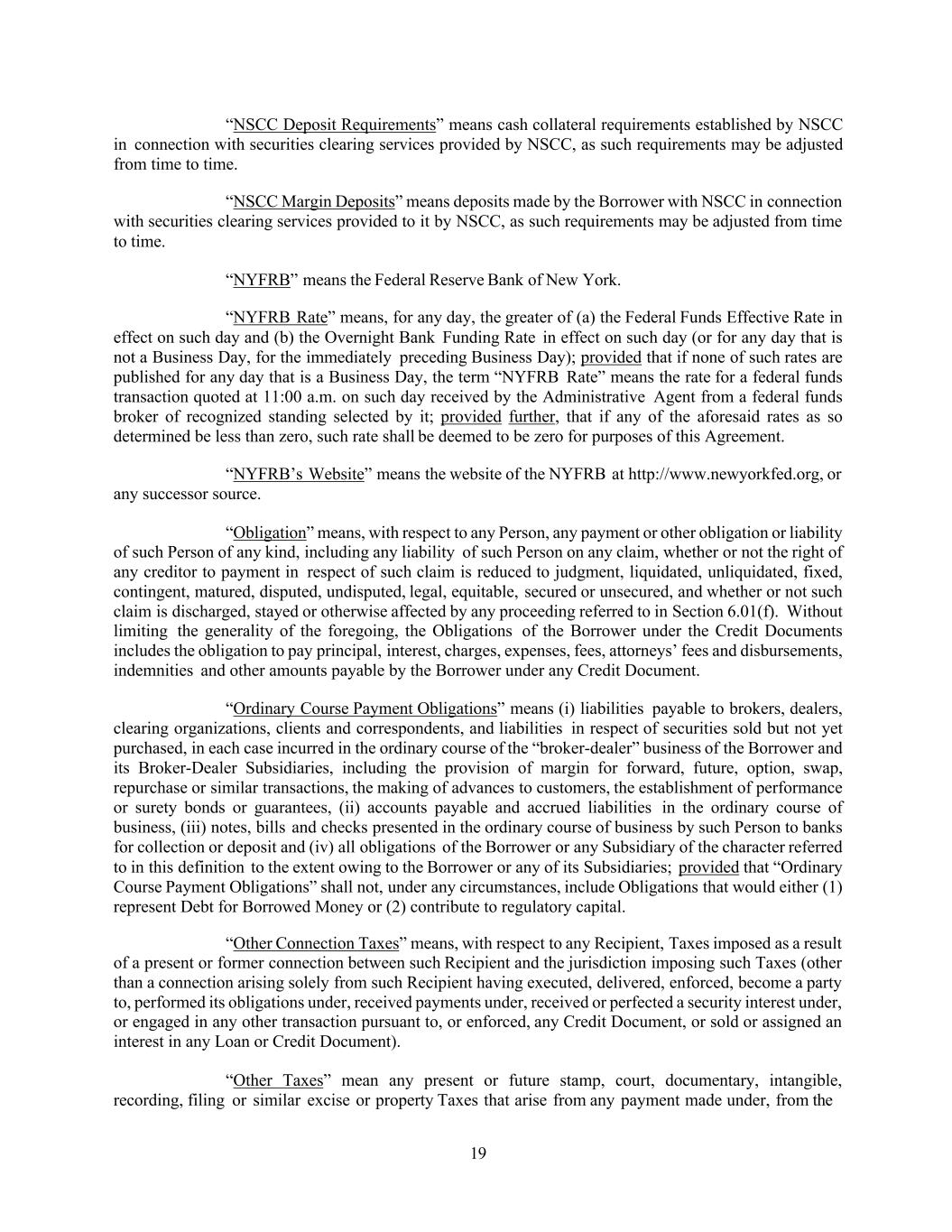 19 “NSCC Deposit Requirements” means cash collateral requirements established by NSCC in connection with securities clearing services provided by NSCC, as such requirements may be adjusted from time to time. “NSCC Margin Deposits” means deposits made by the Borrower with NSCC in connection with securities clearing services provided to it by NSCC, as such requirements may be adjusted from time to time. “NYFRB” means the Federal Reserve Bank of New York. “NYFRB Rate” means, for any day, the greater of (a) the Federal Funds Effective Rate in effect on such day and (b) the Overnight Bank Funding Rate in effect on such day (or for any day that is not a Business Day, for the immediately preceding Business Day); provided that if none of such rates are published for any day that is a Business Day, the term “NYFRB Rate” means the rate for a federal funds transaction quoted at 11:00 a.m. on such day received by the Administrative Agent from a federal funds broker of recognized standing selected by it; provided further, that if any of the aforesaid rates as so determined be less than zero, such rate shall be deemed to be zero for purposes of this Agreement. “NYFRB’s Website” means the website of the NYFRB at http://www.newyorkfed.org, or any successor source. “Obligation” means, with respect to any Person, any payment or other obligation or liability of such Person of any kind, including any liability of such Person on any claim, whether or not the right of any creditor to payment in respect of such claim is reduced to judgment, liquidated, unliquidated, fixed, contingent, matured, disputed, undisputed, legal, equitable, secured or unsecured, and whether or not such claim is discharged, stayed or otherwise affected by any proceeding referred to in Section 6.01(f). Without limiting the generality of the foregoing, the Obligations of the Borrower under the Credit Documents includes the obligation to pay principal, interest, charges, expenses, fees, attorneys’ fees and disbursements, indemnities and other amounts payable by the Borrower under any Credit Document. “Ordinary Course Payment Obligations” means (i) liabilities payable to brokers, dealers, clearing organizations, clients and correspondents, and liabilities in respect of securities sold but not yet purchased, in each case incurred in the ordinary course of the “broker-dealer” business of the Borrower and its Broker-Dealer Subsidiaries, including the provision of margin for forward, future, option, swap, repurchase or similar transactions, the making of advances to customers, the establishment of performance or surety bonds or guarantees, (ii) accounts payable and accrued liabilities in the ordinary course of business, (iii) notes, bills and checks presented in the ordinary course of business by such Person to banks for collection or deposit and (iv) all obligations of the Borrower or any Subsidiary of the character referred to in this definition to the extent owing to the Borrower or any of its Subsidiaries; provided that “Ordinary Course Payment Obligations” shall not, under any circumstances, include Obligations that would either (1) represent Debt for Borrowed Money or (2) contribute to regulatory capital. “Other Connection Taxes” means, with respect to any Recipient, Taxes imposed as a result of a present or former connection between such Recipient and the jurisdiction imposing such Taxes (other than a connection arising solely from such Recipient having executed, delivered, enforced, become a party to, performed its obligations under, received payments under, received or perfected a security interest under, or engaged in any other transaction pursuant to, or enforced, any Credit Document, or sold or assigned an interest in any Loan or Credit Document). “Other Taxes” mean any present or future stamp, court, documentary, intangible, recording, filing or similar excise or property Taxes that arise from any payment made under, from the