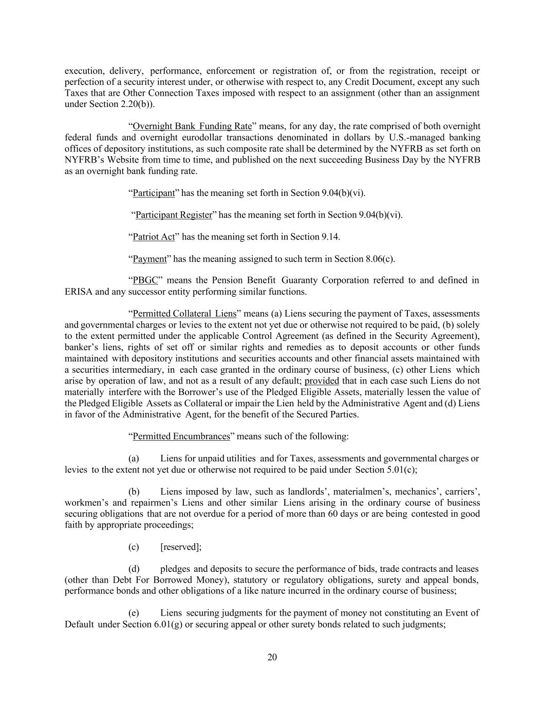20 execution, delivery, performance, enforcement or registration of, or from the registration, receipt or perfection of a security interest under, or otherwise with respect to, any Credit Document, except any such Taxes that are Other Connection Taxes imposed with respect to an assignment (other than an assignment under Section 2.20(b)). “Overnight Bank Funding Rate” means, for any day, the rate comprised of both overnight federal funds and overnight eurodollar transactions denominated in dollars by U.S.-managed banking offices of depository institutions, as such composite rate shall be determined by the NYFRB as set forth on NYFRB’s Website from time to time, and published on the next succeeding Business Day by the NYFRB as an overnight bank funding rate. “Participant” has the meaning set forth in Section 9.04(b)(vi). “Participant Register” has the meaning set forth in Section 9.04(b)(vi). “Patriot Act” has the meaning set forth in Section 9.14. “Payment” has the meaning assigned to such term in Section 8.06(c). “PBGC” means the Pension Benefit Guaranty Corporation referred to and defined in ERISA and any successor entity performing similar functions. “Permitted Collateral Liens” means (a) Liens securing the payment of Taxes, assessments and governmental charges or levies to the extent not yet due or otherwise not required to be paid, (b) solely to the extent permitted under the applicable Control Agreement (as defined in the Security Agreement), banker’s liens, rights of set off or similar rights and remedies as to deposit accounts or other funds maintained with depository institutions and securities accounts and other financial assets maintained with a securities intermediary, in each case granted in the ordinary course of business, (c) other Liens which arise by operation of law, and not as a result of any default; provided that in each case such Liens do not materially interfere with the Borrower’s use of the Pledged Eligible Assets, materially lessen the value of the Pledged Eligible Assets as Collateral or impair the Lien held by the Administrative Agent and (d) Liens in favor of the Administrative Agent, for the benefit of the Secured Parties. “Permitted Encumbrances” means such of the following: (a) Liens for unpaid utilities and for Taxes, assessments and governmental charges or levies to the extent not yet due or otherwise not required to be paid under Section 5.01(c); (b) Liens imposed by law, such as landlords’, materialmen’s, mechanics’, carriers’, workmen’s and repairmen’s Liens and other similar Liens arising in the ordinary course of business securing obligations that are not overdue for a period of more than 60 days or are being contested in good faith by appropriate proceedings; (c) [reserved]; (d) pledges and deposits to secure the performance of bids, trade contracts and leases (other than Debt For Borrowed Money), statutory or regulatory obligations, surety and appeal bonds, performance bonds and other obligations of a like nature incurred in the ordinary course of business; (e) Liens securing judgments for the payment of money not constituting an Event of Default under Section 6.01(g) or securing appeal or other surety bonds related to such judgments;