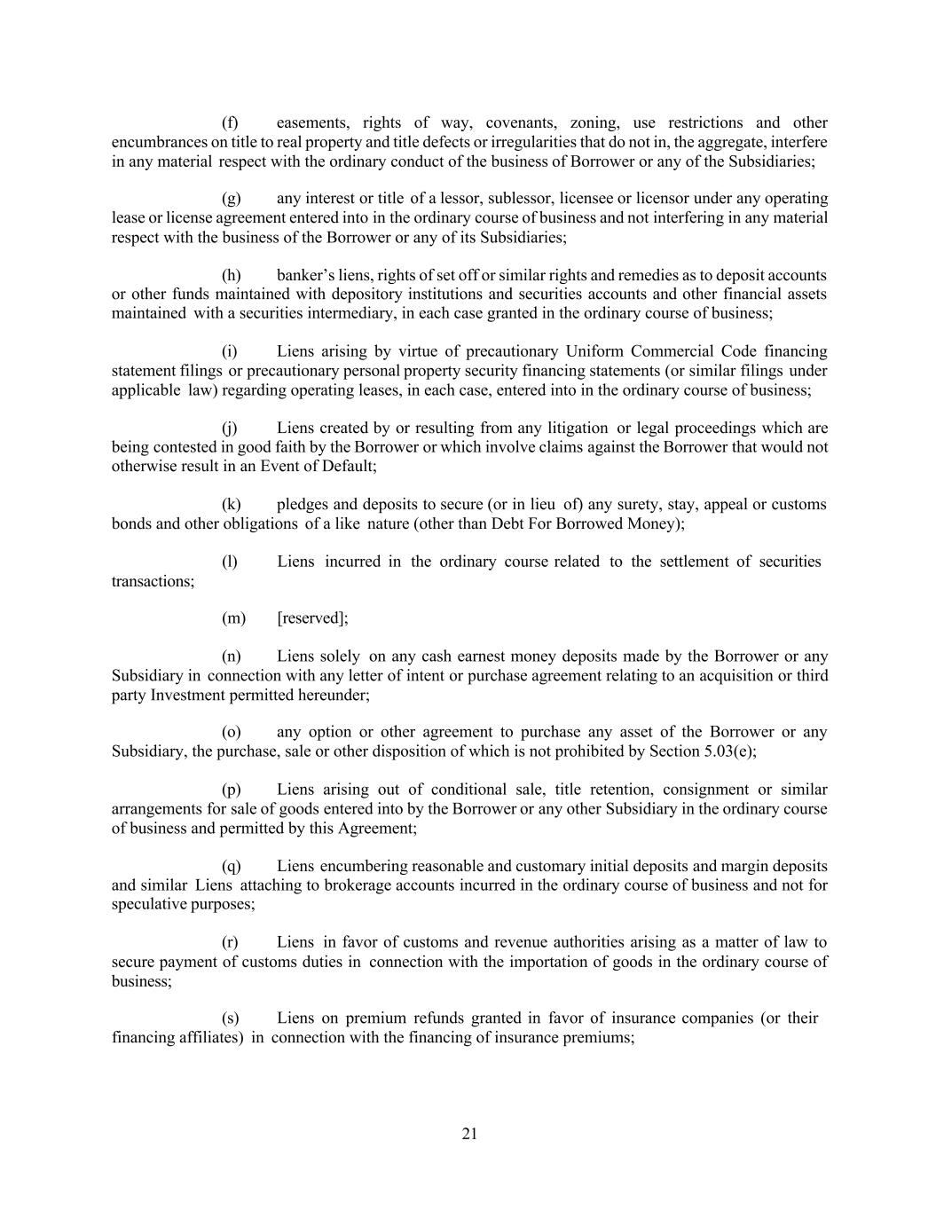 21 (f) easements, rights of way, covenants, zoning, use restrictions and other encumbrances on title to real property and title defects or irregularities that do not in, the aggregate, interfere in any material respect with the ordinary conduct of the business of Borrower or any of the Subsidiaries; (g) any interest or title of a lessor, sublessor, licensee or licensor under any operating lease or license agreement entered into in the ordinary course of business and not interfering in any material respect with the business of the Borrower or any of its Subsidiaries; (h) banker’s liens, rights of set off or similar rights and remedies as to deposit accounts or other funds maintained with depository institutions and securities accounts and other financial assets maintained with a securities intermediary, in each case granted in the ordinary course of business; (i) Liens arising by virtue of precautionary Uniform Commercial Code financing statement filings or precautionary personal property security financing statements (or similar filings under applicable law) regarding operating leases, in each case, entered into in the ordinary course of business; (j) Liens created by or resulting from any litigation or legal proceedings which are being contested in good faith by the Borrower or which involve claims against the Borrower that would not otherwise result in an Event of Default; (k) pledges and deposits to secure (or in lieu of) any surety, stay, appeal or customs bonds and other obligations of a like nature (other than Debt For Borrowed Money); transactions; (l) Liens incurred in the ordinary course related to the settlement of securities (m) [reserved]; (n) Liens solely on any cash earnest money deposits made by the Borrower or any Subsidiary in connection with any letter of intent or purchase agreement relating to an acquisition or third party Investment permitted hereunder; (o) any option or other agreement to purchase any asset of the Borrower or any Subsidiary, the purchase, sale or other disposition of which is not prohibited by Section 5.03(e); (p) Liens arising out of conditional sale, title retention, consignment or similar arrangements for sale of goods entered into by the Borrower or any other Subsidiary in the ordinary course of business and permitted by this Agreement; (q) Liens encumbering reasonable and customary initial deposits and margin deposits and similar Liens attaching to brokerage accounts incurred in the ordinary course of business and not for speculative purposes; (r) Liens in favor of customs and revenue authorities arising as a matter of law to secure payment of customs duties in connection with the importation of goods in the ordinary course of business; (s) Liens on premium refunds granted in favor of insurance companies (or their financing affiliates) in connection with the financing of insurance premiums;