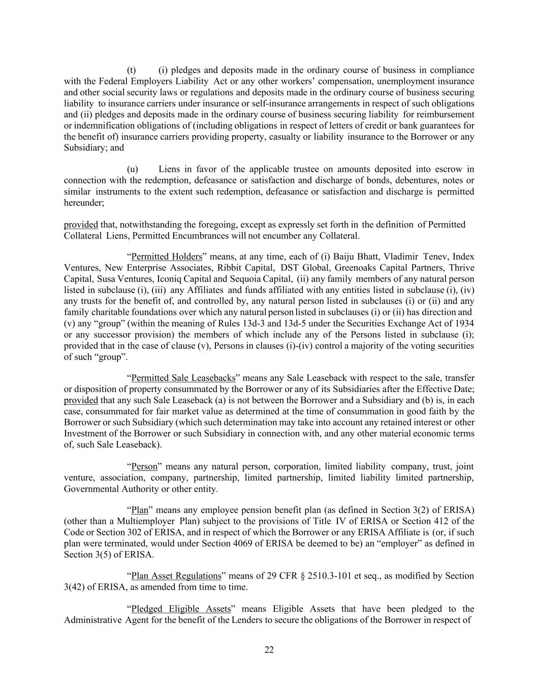 22 (t) (i) pledges and deposits made in the ordinary course of business in compliance with the Federal Employers Liability Act or any other workers’ compensation, unemployment insurance and other social security laws or regulations and deposits made in the ordinary course of business securing liability to insurance carriers under insurance or self-insurance arrangements in respect of such obligations and (ii) pledges and deposits made in the ordinary course of business securing liability for reimbursement or indemnification obligations of (including obligations in respect of letters of credit or bank guarantees for the benefit of) insurance carriers providing property, casualty or liability insurance to the Borrower or any Subsidiary; and (u) Liens in favor of the applicable trustee on amounts deposited into escrow in connection with the redemption, defeasance or satisfaction and discharge of bonds, debentures, notes or similar instruments to the extent such redemption, defeasance or satisfaction and discharge is permitted hereunder; provided that, notwithstanding the foregoing, except as expressly set forth in the definition of Permitted Collateral Liens, Permitted Encumbrances will not encumber any Collateral. “Permitted Holders” means, at any time, each of (i) Baiju Bhatt, Vladimir Tenev, Index Ventures, New Enterprise Associates, Ribbit Capital, DST Global, Greenoaks Capital Partners, Thrive Capital, Susa Ventures, Iconiq Capital and Sequoia Capital, (ii) any family members of any natural person listed in subclause (i), (iii) any Affiliates and funds affiliated with any entities listed in subclause (i), (iv) any trusts for the benefit of, and controlled by, any natural person listed in subclauses (i) or (ii) and any family charitable foundations over which any natural person listed in subclauses (i) or (ii) has direction and (v) any “group” (within the meaning of Rules 13d-3 and 13d-5 under the Securities Exchange Act of 1934 or any successor provision) the members of which include any of the Persons listed in subclause (i); provided that in the case of clause (v), Persons in clauses (i)-(iv) control a majority of the voting securities of such “group”. “Permitted Sale Leasebacks” means any Sale Leaseback with respect to the sale, transfer or disposition of property consummated by the Borrower or any of its Subsidiaries after the Effective Date; provided that any such Sale Leaseback (a) is not between the Borrower and a Subsidiary and (b) is, in each case, consummated for fair market value as determined at the time of consummation in good faith by the Borrower or such Subsidiary (which such determination may take into account any retained interest or other Investment of the Borrower or such Subsidiary in connection with, and any other material economic terms of, such Sale Leaseback). “Person” means any natural person, corporation, limited liability company, trust, joint venture, association, company, partnership, limited partnership, limited liability limited partnership, Governmental Authority or other entity. “Plan” means any employee pension benefit plan (as defined in Section 3(2) of ERISA) (other than a Multiemployer Plan) subject to the provisions of Title IV of ERISA or Section 412 of the Code or Section 302 of ERISA, and in respect of which the Borrower or any ERISA Affiliate is (or, if such plan were terminated, would under Section 4069 of ERISA be deemed to be) an “employer” as defined in Section 3(5) of ERISA. “Plan Asset Regulations” means of 29 CFR § 2510.3-101 et seq., as modified by Section 3(42) of ERISA, as amended from time to time. “Pledged Eligible Assets” means Eligible Assets that have been pledged to the Administrative Agent for the benefit of the Lenders to secure the obligations of the Borrower in respect of