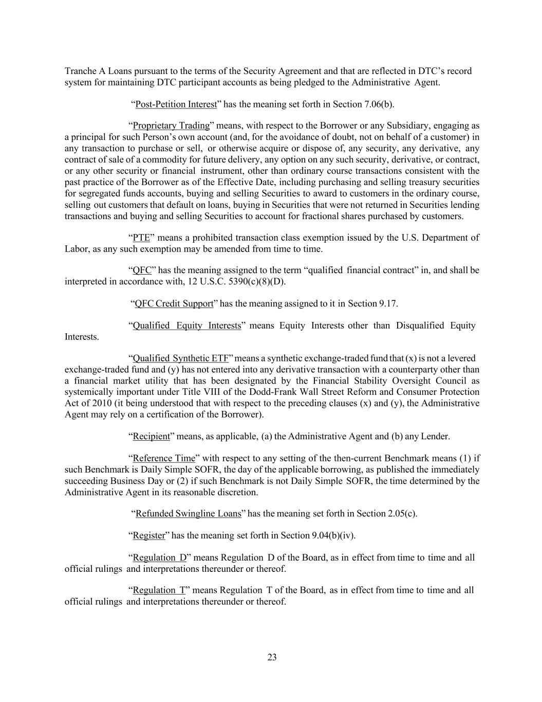 23 Tranche A Loans pursuant to the terms of the Security Agreement and that are reflected in DTC’s record system for maintaining DTC participant accounts as being pledged to the Administrative Agent. “Post-Petition Interest” has the meaning set forth in Section 7.06(b). “Proprietary Trading” means, with respect to the Borrower or any Subsidiary, engaging as a principal for such Person’s own account (and, for the avoidance of doubt, not on behalf of a customer) in any transaction to purchase or sell, or otherwise acquire or dispose of, any security, any derivative, any contract of sale of a commodity for future delivery, any option on any such security, derivative, or contract, or any other security or financial instrument, other than ordinary course transactions consistent with the past practice of the Borrower as of the Effective Date, including purchasing and selling treasury securities for segregated funds accounts, buying and selling Securities to award to customers in the ordinary course, selling out customers that default on loans, buying in Securities that were not returned in Securities lending transactions and buying and selling Securities to account for fractional shares purchased by customers. “PTE” means a prohibited transaction class exemption issued by the U.S. Department of Labor, as any such exemption may be amended from time to time. “QFC” has the meaning assigned to the term “qualified financial contract” in, and shall be interpreted in accordance with, 12 U.S.C. 5390(c)(8)(D). “QFC Credit Support” has the meaning assigned to it in Section 9.17. Interests. “Qualified Equity Interests” means Equity Interests other than Disqualified Equity “Qualified Synthetic ETF” means a synthetic exchange-traded fund that (x) is not a levered exchange-traded fund and (y) has not entered into any derivative transaction with a counterparty other than a financial market utility that has been designated by the Financial Stability Oversight Council as systemically important under Title VIII of the Dodd-Frank Wall Street Reform and Consumer Protection Act of 2010 (it being understood that with respect to the preceding clauses (x) and (y), the Administrative Agent may rely on a certification of the Borrower). “Recipient” means, as applicable, (a) the Administrative Agent and (b) any Lender. “Reference Time” with respect to any setting of the then-current Benchmark means (1) if such Benchmark is Daily Simple SOFR, the day of the applicable borrowing, as published the immediately succeeding Business Day or (2) if such Benchmark is not Daily Simple SOFR, the time determined by the Administrative Agent in its reasonable discretion. “Refunded Swingline Loans” has the meaning set forth in Section 2.05(c). “Register” has the meaning set forth in Section 9.04(b)(iv). “Regulation D” means Regulation D of the Board, as in effect from time to time and all official rulings and interpretations thereunder or thereof. “Regulation T” means Regulation T of the Board, as in effect from time to time and all official rulings and interpretations thereunder or thereof.