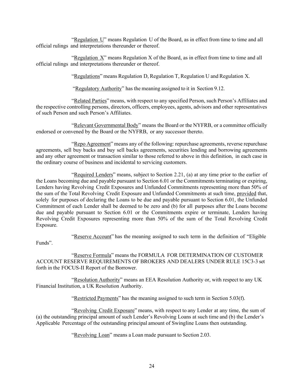 24 “Regulation U” means Regulation U of the Board, as in effect from time to time and all official rulings and interpretations thereunder or thereof. “Regulation X” means Regulation X of the Board, as in effect from time to time and all official rulings and interpretations thereunder or thereof. “Regulations” means Regulation D, Regulation T, Regulation U and Regulation X. “Regulatory Authority” has the meaning assigned to it in Section 9.12. “Related Parties” means, with respect to any specified Person, such Person’s Affiliates and the respective controlling persons, directors, officers, employees, agents, advisors and other representatives of such Person and such Person’s Affiliates. “Relevant Governmental Body” means the Board or the NYFRB, or a committee officially endorsed or convened by the Board or the NYFRB, or any successor thereto. “Repo Agreement” means any of the following: repurchase agreements, reverse repurchase agreements, sell buy backs and buy sell backs agreements, securities lending and borrowing agreements and any other agreement or transaction similar to those referred to above in this definition, in each case in the ordinary course of business and incidental to servicing customers. “Required Lenders” means, subject to Section 2.21, (a) at any time prior to the earlier of the Loans becoming due and payable pursuant to Section 6.01 or the Commitments terminating or expiring, Lenders having Revolving Credit Exposures and Unfunded Commitments representing more than 50% of the sum of the Total Revolving Credit Exposure and Unfunded Commitments at such time, provided that, solely for purposes of declaring the Loans to be due and payable pursuant to Section 6.01, the Unfunded Commitment of each Lender shall be deemed to be zero and (b) for all purposes after the Loans become due and payable pursuant to Section 6.01 or the Commitments expire or terminate, Lenders having Revolving Credit Exposures representing more than 50% of the sum of the Total Revolving Credit Exposure. “Reserve Account” has the meaning assigned to such term in the definition of “Eligible Funds”. “Reserve Formula” means the FORMULA FOR DETERMINATION OF CUSTOMER ACCOUNT RESERVE REQUIREMENTS OF BROKERS AND DEALERS UNDER RULE 15C3-3 set forth in the FOCUS-II Report of the Borrower. “Resolution Authority” means an EEA Resolution Authority or, with respect to any UK Financial Institution, a UK Resolution Authority. “Restricted Payments” has the meaning assigned to such term in Section 5.03(f). “Revolving Credit Exposure” means, with respect to any Lender at any time, the sum of (a) the outstanding principal amount of such Lender’s Revolving Loans at such time and (b) the Lender’s Applicable Percentage of the outstanding principal amount of Swingline Loans then outstanding. “Revolving Loan” means a Loan made pursuant to Section 2.03.