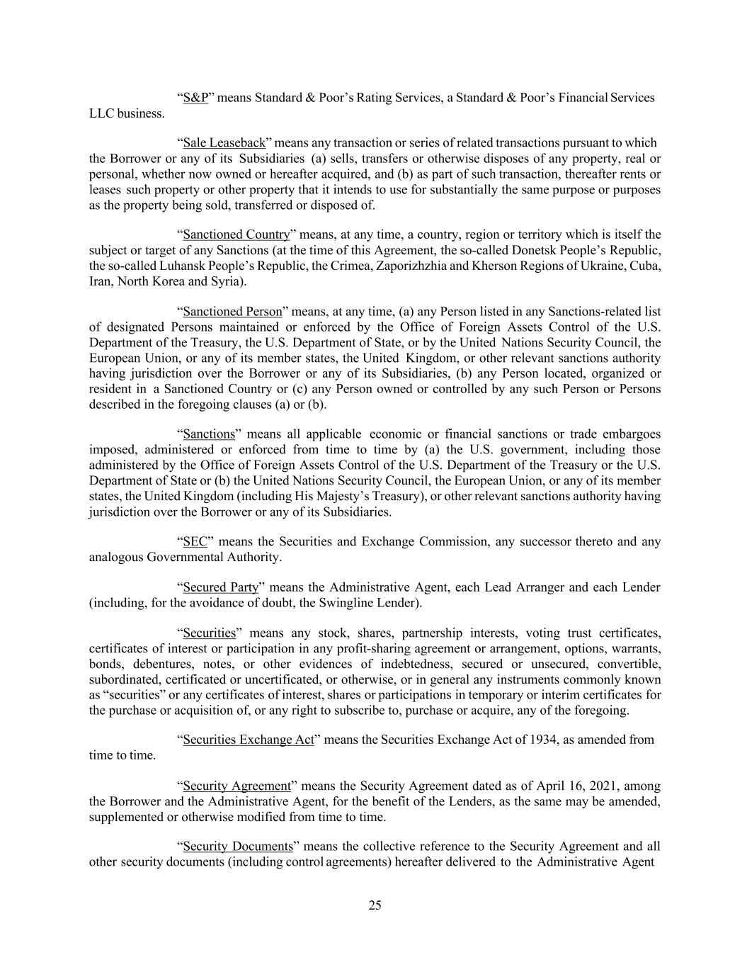 25 LLC business. “S&P” means Standard & Poor’s Rating Services, a Standard & Poor’s Financial Services “Sale Leaseback” means any transaction or series of related transactions pursuant to which the Borrower or any of its Subsidiaries (a) sells, transfers or otherwise disposes of any property, real or personal, whether now owned or hereafter acquired, and (b) as part of such transaction, thereafter rents or leases such property or other property that it intends to use for substantially the same purpose or purposes as the property being sold, transferred or disposed of. “Sanctioned Country” means, at any time, a country, region or territory which is itself the subject or target of any Sanctions (at the time of this Agreement, the so-called Donetsk People’s Republic, the so-called Luhansk People’s Republic, the Crimea, Zaporizhzhia and Kherson Regions of Ukraine, Cuba, Iran, North Korea and Syria). “Sanctioned Person” means, at any time, (a) any Person listed in any Sanctions-related list of designated Persons maintained or enforced by the Office of Foreign Assets Control of the U.S. Department of the Treasury, the U.S. Department of State, or by the United Nations Security Council, the European Union, or any of its member states, the United Kingdom, or other relevant sanctions authority having jurisdiction over the Borrower or any of its Subsidiaries, (b) any Person located, organized or resident in a Sanctioned Country or (c) any Person owned or controlled by any such Person or Persons described in the foregoing clauses (a) or (b). “Sanctions” means all applicable economic or financial sanctions or trade embargoes imposed, administered or enforced from time to time by (a) the U.S. government, including those administered by the Office of Foreign Assets Control of the U.S. Department of the Treasury or the U.S. Department of State or (b) the United Nations Security Council, the European Union, or any of its member states, the United Kingdom (including His Majesty’s Treasury), or other relevant sanctions authority having jurisdiction over the Borrower or any of its Subsidiaries. “SEC” means the Securities and Exchange Commission, any successor thereto and any analogous Governmental Authority. “Secured Party” means the Administrative Agent, each Lead Arranger and each Lender (including, for the avoidance of doubt, the Swingline Lender). “Securities” means any stock, shares, partnership interests, voting trust certificates, certificates of interest or participation in any profit-sharing agreement or arrangement, options, warrants, bonds, debentures, notes, or other evidences of indebtedness, secured or unsecured, convertible, subordinated, certificated or uncertificated, or otherwise, or in general any instruments commonly known as “securities” or any certificates of interest, shares or participations in temporary or interim certificates for the purchase or acquisition of, or any right to subscribe to, purchase or acquire, any of the foregoing. “Securities Exchange Act” means the Securities Exchange Act of 1934, as amended from time to time. “Security Agreement” means the Security Agreement dated as of April 16, 2021, among the Borrower and the Administrative Agent, for the benefit of the Lenders, as the same may be amended, supplemented or otherwise modified from time to time. “Security Documents” means the collective reference to the Security Agreement and all other security documents (including control agreements) hereafter delivered to the Administrative Agent