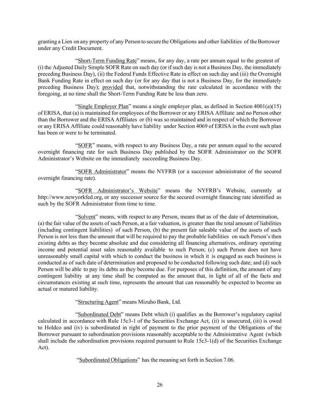 26 granting a Lien on any property of any Person to secure the Obligations and other liabilities of the Borrower under any Credit Document. “Short-Term Funding Rate” means, for any day, a rate per annum equal to the greatest of (i) the Adjusted Daily Simple SOFR Rate on such day (or if such day is not a Business Day, the immediately preceding Business Day), (ii) the Federal Funds Effective Rate in effect on such day and (iii) the Overnight Bank Funding Rate in effect on such day (or for any day that is not a Business Day, for the immediately preceding Business Day); provided that, notwithstanding the rate calculated in accordance with the foregoing, at no time shall the Short-Term Funding Rate be less than zero. “Single Employer Plan” means a single employer plan, as defined in Section 4001(a)(15) of ERISA, that (a) is maintained for employees of the Borrower or any ERISA Affiliate and no Person other than the Borrower and the ERISA Affiliates or (b) was so maintained and in respect of which the Borrower or any ERISA Affiliate could reasonably have liability under Section 4069 of ERISA in the event such plan has been or were to be terminated. “SOFR” means, with respect to any Business Day, a rate per annum equal to the secured overnight financing rate for such Business Day published by the SOFR Administrator on the SOFR Administrator’s Website on the immediately succeeding Business Day. “SOFR Administrator” means the NYFRB (or a successor administrator of the secured overnight financing rate). “SOFR Administrator’s Website” means the NYFRB’s Website, currently at http://www.newyorkfed.org, or any successor source for the secured overnight financing rate identified as such by the SOFR Administrator from time to time. “Solvent” means, with respect to any Person, means that as of the date of determination, (a) the fair value of the assets of such Person, at a fair valuation, is greater than the total amount of liabilities (including contingent liabilities) of such Person, (b) the present fair saleable value of the assets of such Person is not less than the amount that will be required to pay the probable liabilities on such Person’s then existing debts as they become absolute and due considering all financing alternatives, ordinary operating income and potential asset sales reasonably available to such Person; (c) such Person does not have unreasonably small capital with which to conduct the business in which it is engaged as such business is conducted as of such date of determination and proposed to be conducted following such date; and (d) such Person will be able to pay its debts as they become due. For purposes of this definition, the amount of any contingent liability at any time shall be computed as the amount that, in light of all of the facts and circumstances existing at such time, represents the amount that can reasonably be expected to become an actual or matured liability. “Structuring Agent” means Mizuho Bank, Ltd. “Subordinated Debt” means Debt which (i) qualifies as the Borrower’s regulatory capital calculated in accordance with Rule 15c3-1 of the Securities Exchange Act, (ii) is unsecured, (iii) is owed to Holdco and (iv) is subordinated in right of payment to the prior payment of the Obligations of the Borrower pursuant to subordination provisions reasonably acceptable to the Administrative Agent (which shall include the subordination provisions required pursuant to Rule 15c3-1(d) of the Securities Exchange Act). “Subordinated Obligations” has the meaning set forth in Section 7.06.