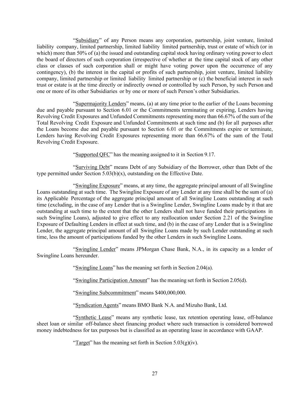 27 “Subsidiary” of any Person means any corporation, partnership, joint venture, limited liability company, limited partnership, limited liability limited partnership, trust or estate of which (or in which) more than 50% of (a) the issued and outstanding capital stock having ordinary voting power to elect the board of directors of such corporation (irrespective of whether at the time capital stock of any other class or classes of such corporation shall or might have voting power upon the occurrence of any contingency), (b) the interest in the capital or profits of such partnership, joint venture, limited liability company, limited partnership or limited liability limited partnership or (c) the beneficial interest in such trust or estate is at the time directly or indirectly owned or controlled by such Person, by such Person and one or more of its other Subsidiaries or by one or more of such Person’s other Subsidiaries. “Supermajority Lenders” means, (a) at any time prior to the earlier of the Loans becoming due and payable pursuant to Section 6.01 or the Commitments terminating or expiring, Lenders having Revolving Credit Exposures and Unfunded Commitments representing more than 66.67% of the sum of the Total Revolving Credit Exposure and Unfunded Commitments at such time and (b) for all purposes after the Loans become due and payable pursuant to Section 6.01 or the Commitments expire or terminate, Lenders having Revolving Credit Exposures representing more than 66.67% of the sum of the Total Revolving Credit Exposure. “Supported QFC” has the meaning assigned to it in Section 9.17. “Surviving Debt” means Debt of any Subsidiary of the Borrower, other than Debt of the type permitted under Section 5.03(b)(x), outstanding on the Effective Date. “Swingline Exposure” means, at any time, the aggregate principal amount of all Swingline Loans outstanding at such time. The Swingline Exposure of any Lender at any time shall be the sum of (a) its Applicable Percentage of the aggregate principal amount of all Swingline Loans outstanding at such time (excluding, in the case of any Lender that is a Swingline Lender, Swingline Loans made by it that are outstanding at such time to the extent that the other Lenders shall not have funded their participations in such Swingline Loans), adjusted to give effect to any reallocation under Section 2.21 of the Swingline Exposure of Defaulting Lenders in effect at such time, and (b) in the case of any Lender that is a Swingline Lender, the aggregate principal amount of all Swingline Loans made by such Lender outstanding at such time, less the amount of participations funded by the other Lenders in such Swingline Loans. “Swingline Lender” means JPMorgan Chase Bank, N.A., in its capacity as a lender of Swingline Loans hereunder. “Swingline Loans” has the meaning set forth in Section 2.04(a). “Swingline Participation Amount” has the meaning set forth in Section 2.05(d). “Swingline Subcommitment” means $400,000,000. “Syndication Agents” means BMO Bank N.A. and Mizuho Bank, Ltd. “Synthetic Lease” means any synthetic lease, tax retention operating lease, off-balance sheet loan or similar off-balance sheet financing product where such transaction is considered borrowed money indebtedness for tax purposes but is classified as an operating lease in accordance with GAAP. “Target” has the meaning set forth in Section 5.03(g)(iv).