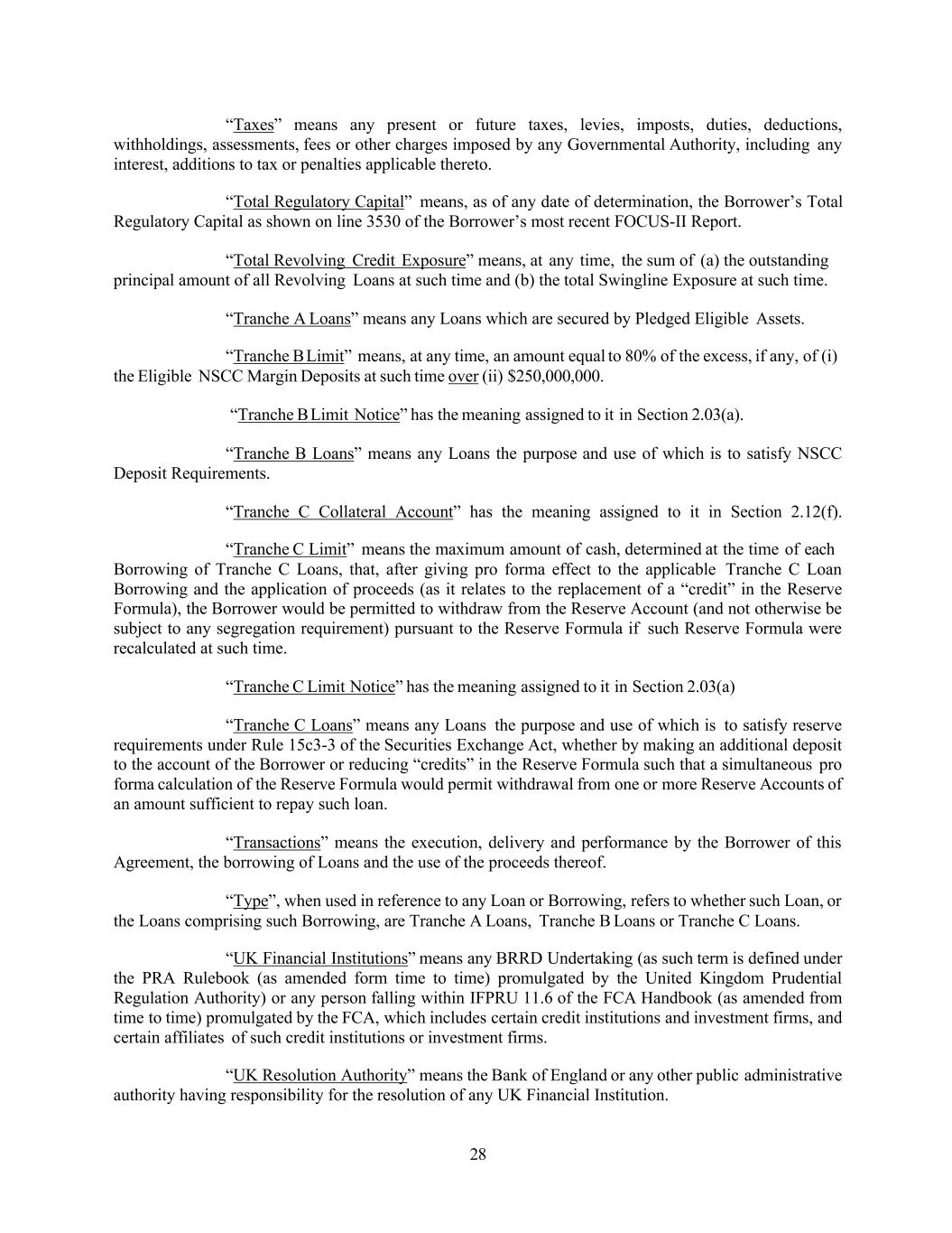 28 “Taxes” means any present or future taxes, levies, imposts, duties, deductions, withholdings, assessments, fees or other charges imposed by any Governmental Authority, including any interest, additions to tax or penalties applicable thereto. “Total Regulatory Capital” means, as of any date of determination, the Borrower’s Total Regulatory Capital as shown on line 3530 of the Borrower’s most recent FOCUS-II Report. “Total Revolving Credit Exposure” means, at any time, the sum of (a) the outstanding principal amount of all Revolving Loans at such time and (b) the total Swingline Exposure at such time. “Tranche A Loans” means any Loans which are secured by Pledged Eligible Assets. “Tranche B Limit” means, at any time, an amount equal to 80% of the excess, if any, of (i) the Eligible NSCC Margin Deposits at such time over (ii) $250,000,000. “Tranche B Limit Notice” has the meaning assigned to it in Section 2.03(a). “Tranche B Loans” means any Loans the purpose and use of which is to satisfy NSCC Deposit Requirements. “Tranche C Collateral Account” has the meaning assigned to it in Section 2.12(f). “Tranche C Limit” means the maximum amount of cash, determined at the time of each Borrowing of Tranche C Loans, that, after giving pro forma effect to the applicable Tranche C Loan Borrowing and the application of proceeds (as it relates to the replacement of a “credit” in the Reserve Formula), the Borrower would be permitted to withdraw from the Reserve Account (and not otherwise be subject to any segregation requirement) pursuant to the Reserve Formula if such Reserve Formula were recalculated at such time. “Tranche C Limit Notice” has the meaning assigned to it in Section 2.03(a) “Tranche C Loans” means any Loans the purpose and use of which is to satisfy reserve requirements under Rule 15c3-3 of the Securities Exchange Act, whether by making an additional deposit to the account of the Borrower or reducing “credits” in the Reserve Formula such that a simultaneous pro forma calculation of the Reserve Formula would permit withdrawal from one or more Reserve Accounts of an amount sufficient to repay such loan. “Transactions” means the execution, delivery and performance by the Borrower of this Agreement, the borrowing of Loans and the use of the proceeds thereof. “Type”, when used in reference to any Loan or Borrowing, refers to whether such Loan, or the Loans comprising such Borrowing, are Tranche A Loans, Tranche B Loans or Tranche C Loans. “UK Financial Institutions” means any BRRD Undertaking (as such term is defined under the PRA Rulebook (as amended form time to time) promulgated by the United Kingdom Prudential Regulation Authority) or any person falling within IFPRU 11.6 of the FCA Handbook (as amended from time to time) promulgated by the FCA, which includes certain credit institutions and investment firms, and certain affiliates of such credit institutions or investment firms. “UK Resolution Authority” means the Bank of England or any other public administrative authority having responsibility for the resolution of any UK Financial Institution.