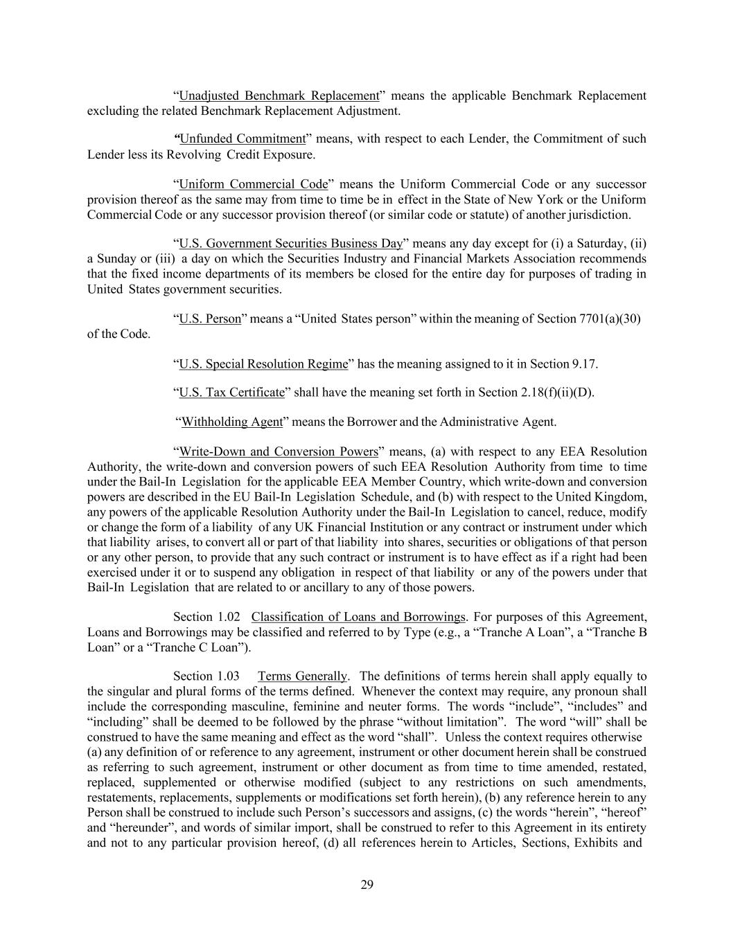 29 “Unadjusted Benchmark Replacement” means the applicable Benchmark Replacement excluding the related Benchmark Replacement Adjustment. “Unfunded Commitment” means, with respect to each Lender, the Commitment of such Lender less its Revolving Credit Exposure. “Uniform Commercial Code” means the Uniform Commercial Code or any successor provision thereof as the same may from time to time be in effect in the State of New York or the Uniform Commercial Code or any successor provision thereof (or similar code or statute) of another jurisdiction. “U.S. Government Securities Business Day” means any day except for (i) a Saturday, (ii) a Sunday or (iii) a day on which the Securities Industry and Financial Markets Association recommends that the fixed income departments of its members be closed for the entire day for purposes of trading in United States government securities. “U.S. Person” means a “United States person” within the meaning of Section 7701(a)(30) of the Code. “U.S. Special Resolution Regime” has the meaning assigned to it in Section 9.17. “U.S. Tax Certificate” shall have the meaning set forth in Section 2.18(f)(ii)(D). “Withholding Agent” means the Borrower and the Administrative Agent. “Write-Down and Conversion Powers” means, (a) with respect to any EEA Resolution Authority, the write-down and conversion powers of such EEA Resolution Authority from time to time under the Bail-In Legislation for the applicable EEA Member Country, which write-down and conversion powers are described in the EU Bail-In Legislation Schedule, and (b) with respect to the United Kingdom, any powers of the applicable Resolution Authority under the Bail-In Legislation to cancel, reduce, modify or change the form of a liability of any UK Financial Institution or any contract or instrument under which that liability arises, to convert all or part of that liability into shares, securities or obligations of that person or any other person, to provide that any such contract or instrument is to have effect as if a right had been exercised under it or to suspend any obligation in respect of that liability or any of the powers under that Bail-In Legislation that are related to or ancillary to any of those powers. Section 1.02 Classification of Loans and Borrowings. For purposes of this Agreement, Loans and Borrowings may be classified and referred to by Type (e.g., a “Tranche A Loan”, a “Tranche B Loan” or a “Tranche C Loan”). Section 1.03 Terms Generally. The definitions of terms herein shall apply equally to the singular and plural forms of the terms defined. Whenever the context may require, any pronoun shall include the corresponding masculine, feminine and neuter forms. The words “include”, “includes” and “including” shall be deemed to be followed by the phrase “without limitation”. The word “will” shall be construed to have the same meaning and effect as the word “shall”. Unless the context requires otherwise (a) any definition of or reference to any agreement, instrument or other document herein shall be construed as referring to such agreement, instrument or other document as from time to time amended, restated, replaced, supplemented or otherwise modified (subject to any restrictions on such amendments, restatements, replacements, supplements or modifications set forth herein), (b) any reference herein to any Person shall be construed to include such Person’s successors and assigns, (c) the words “herein”, “hereof” and “hereunder”, and words of similar import, shall be construed to refer to this Agreement in its entirety and not to any particular provision hereof, (d) all references herein to Articles, Sections, Exhibits and