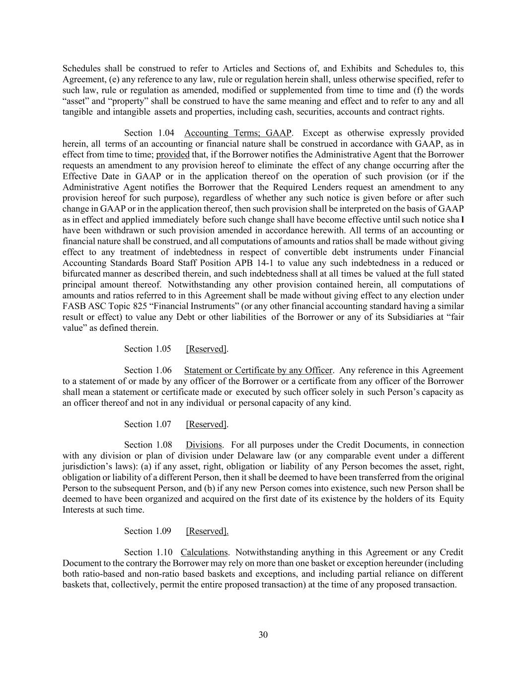 30 Schedules shall be construed to refer to Articles and Sections of, and Exhibits and Schedules to, this Agreement, (e) any reference to any law, rule or regulation herein shall, unless otherwise specified, refer to such law, rule or regulation as amended, modified or supplemented from time to time and (f) the words “asset” and “property” shall be construed to have the same meaning and effect and to refer to any and all tangible and intangible assets and properties, including cash, securities, accounts and contract rights. Section 1.04 Accounting Terms; GAAP. Except as otherwise expressly provided herein, all terms of an accounting or financial nature shall be construed in accordance with GAAP, as in effect from time to time; provided that, if the Borrower notifies the Administrative Agent that the Borrower requests an amendment to any provision hereof to eliminate the effect of any change occurring after the Effective Date in GAAP or in the application thereof on the operation of such provision (or if the Administrative Agent notifies the Borrower that the Required Lenders request an amendment to any provision hereof for such purpose), regardless of whether any such notice is given before or after such change in GAAP or in the application thereof, then such provision shall be interpreted on the basis of GAAP as in effect and applied immediately before such change shall have become effective until such notice sha l have been withdrawn or such provision amended in accordance herewith. All terms of an accounting or financial nature shall be construed, and all computations of amounts and ratios shall be made without giving effect to any treatment of indebtedness in respect of convertible debt instruments under Financial Accounting Standards Board Staff Position APB 14-1 to value any such indebtedness in a reduced or bifurcated manner as described therein, and such indebtedness shall at all times be valued at the full stated principal amount thereof. Notwithstanding any other provision contained herein, all computations of amounts and ratios referred to in this Agreement shall be made without giving effect to any election under FASB ASC Topic 825 “Financial Instruments” (or any other financial accounting standard having a similar result or effect) to value any Debt or other liabilities of the Borrower or any of its Subsidiaries at “fair value” as defined therein. Section 1.05 [Reserved]. Section 1.06 Statement or Certificate by any Officer. Any reference in this Agreement to a statement of or made by any officer of the Borrower or a certificate from any officer of the Borrower shall mean a statement or certificate made or executed by such officer solely in such Person’s capacity as an officer thereof and not in any individual or personal capacity of any kind. Section 1.07 [Reserved]. Section 1.08 Divisions. For all purposes under the Credit Documents, in connection with any division or plan of division under Delaware law (or any comparable event under a different jurisdiction’s laws): (a) if any asset, right, obligation or liability of any Person becomes the asset, right, obligation or liability of a different Person, then it shall be deemed to have been transferred from the original Person to the subsequent Person, and (b) if any new Person comes into existence, such new Person shall be deemed to have been organized and acquired on the first date of its existence by the holders of its Equity Interests at such time. Section 1.09 [Reserved]. Section 1.10 Calculations. Notwithstanding anything in this Agreement or any Credit Document to the contrary the Borrower may rely on more than one basket or exception hereunder (including both ratio-based and non-ratio based baskets and exceptions, and including partial reliance on different baskets that, collectively, permit the entire proposed transaction) at the time of any proposed transaction.